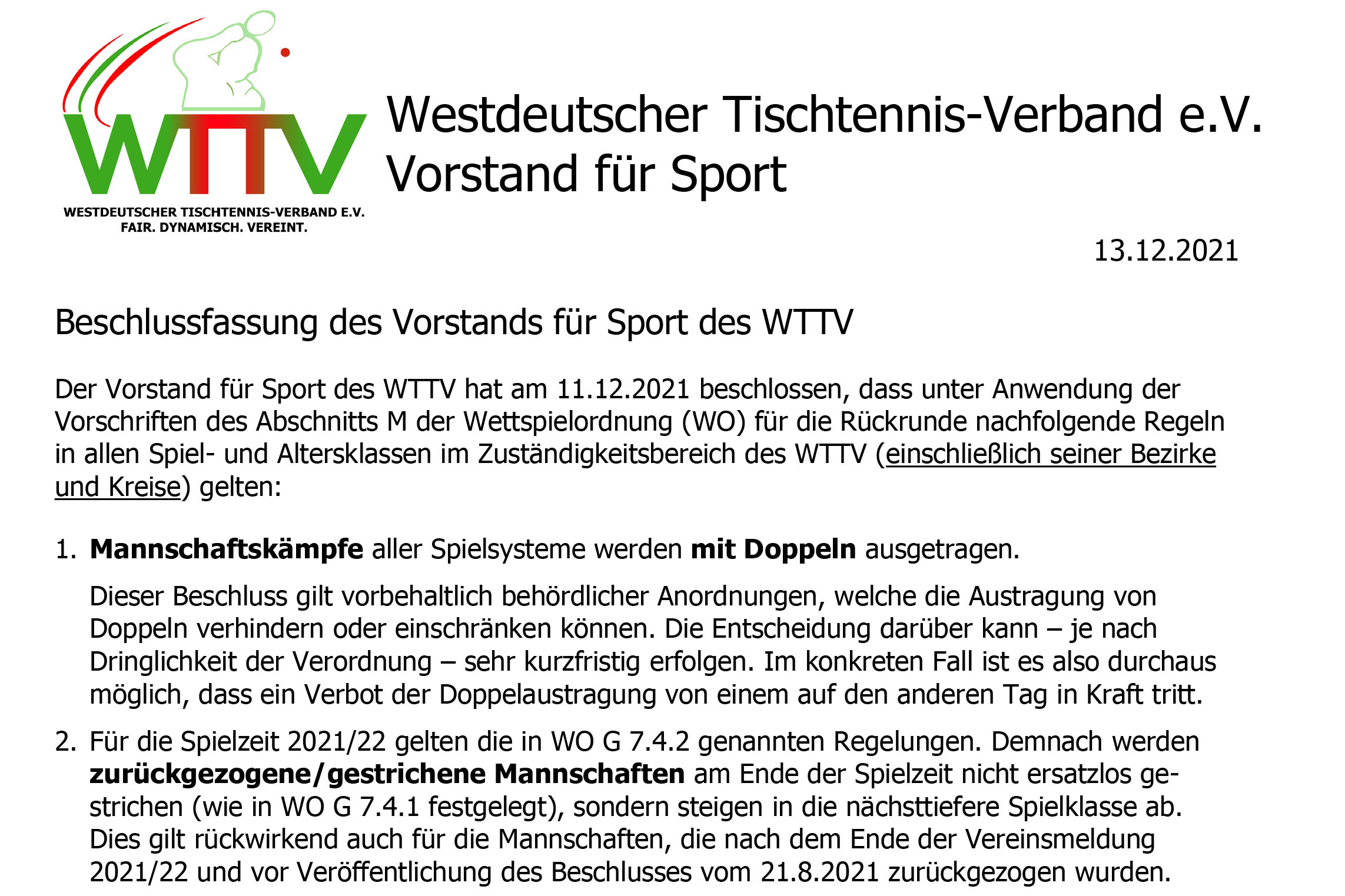 Tischtennis Kreis Oberberg – WTTV Beschluss vom 11.12.2021 zum Fortgang der Spielzeit 2021/22