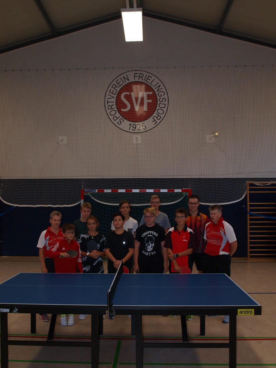Während die anderen Preisträger bereits kurz nach dem Verbandsfinale im Mai ihre Preise entgegennehmen konnten gestaltete sich die Übergabe des Tischtennis-Tisches etwas langwieriger. Aber am Freitag, 06. September, war es dann soweit: für den SV Frielingsdorf nahm die Jugendabteilung den Tischtennistisch während des Trainings entgegen. Die „Macherin“ beim SV, Ulrike Kolb, hatte ihren Verein zum Wettbewerb angemeldet. Denn der SV Frielingsdorf (im Kreis Köln-rechtsrheinisch in der Nähe von Lindlar gelegen) macht seit Jahren bei den mini-Meisterschaften mit und kann durch die Zusammenarbeit mit Schulen auch immer eine erkleckliche Anzahl an Spieler/-innen für den Verein gewinnen. „Aber auch bei uns ist es schwierig, die Jugendlichen langfristig im Verein zu halten. Auch die Zahl der Mitarbeiter, besonders im Trainingsbetrieb, könnte größer sein.“ So abermuss der SV immer wieder einen neuen Anlauf nehmen, um Tischtennis auch im Oberbergischen weiter populär zu machen.