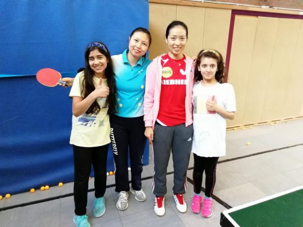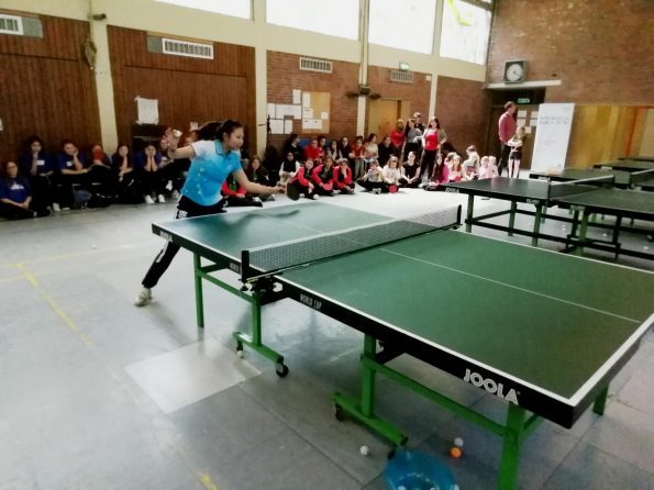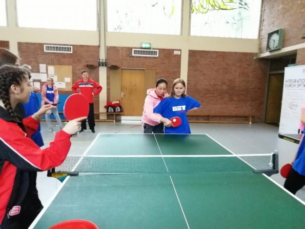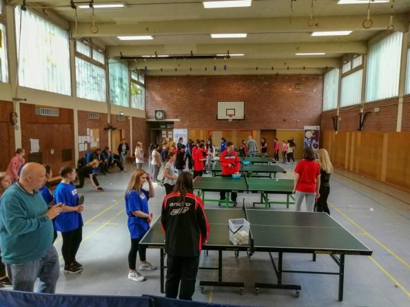 Gegen 10:30 Uhr haben sich in der Sporthalle der Justus-von Liebig Schule 43 Schülerinnen aus 5 Schulen versammelt. Die Helferinnen aus der achten Klasse, hatten zuvor acht Tische in der Einfachhalle aufgebaut. Sie sind alle aktive TT-Spielerinnen, vier von ihnen haben Fluchtgeschichte. Als besonderes Highlight konnten zwei Bundesligaspielerinnen für die Veranstaltung gewonnen werden!