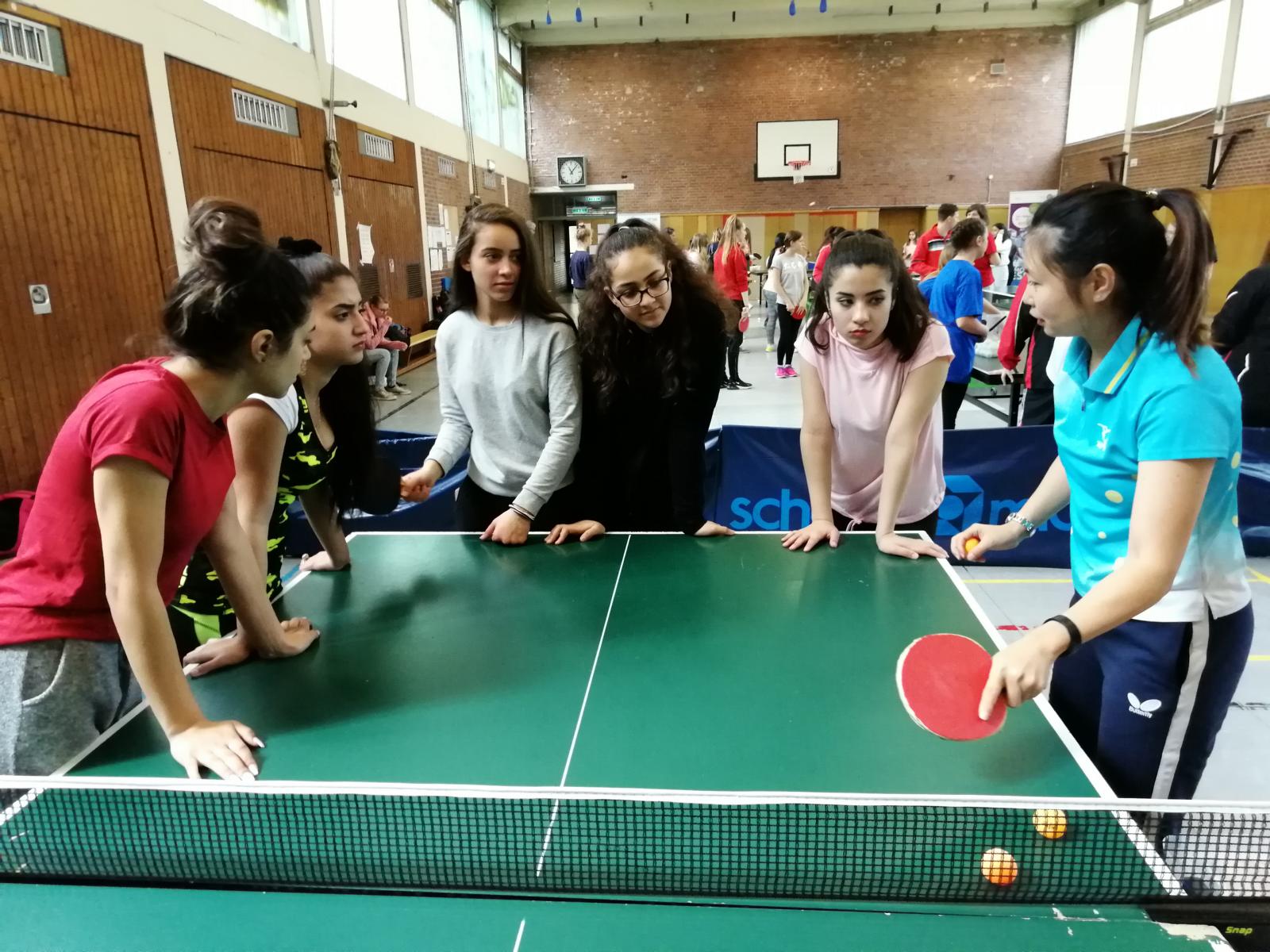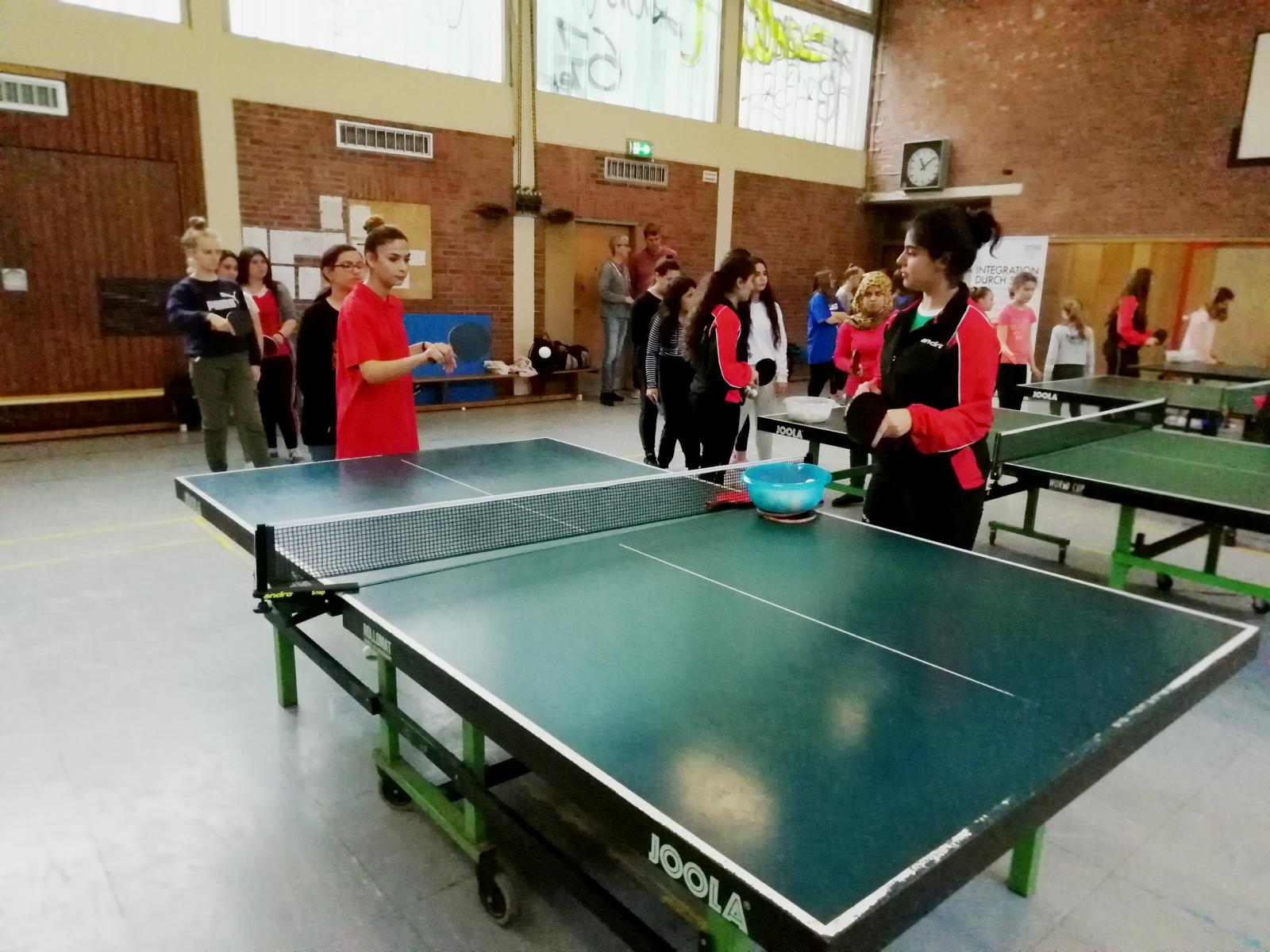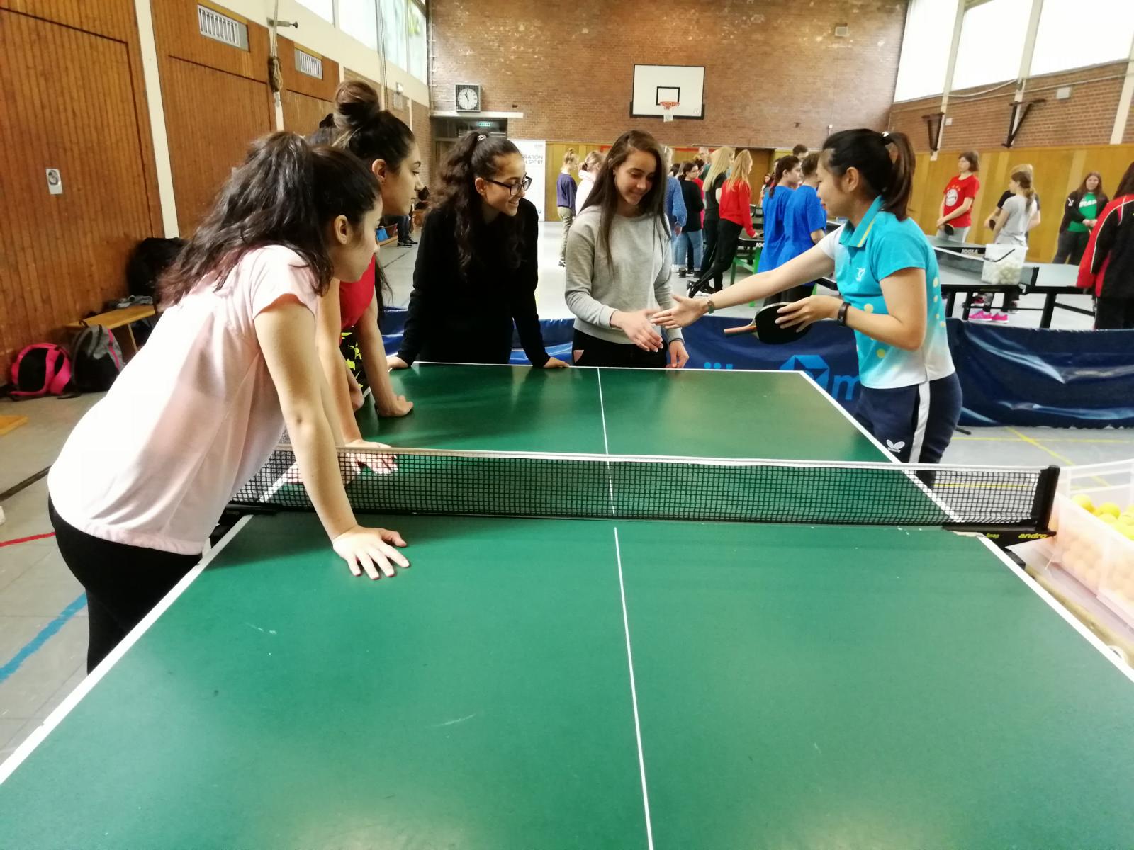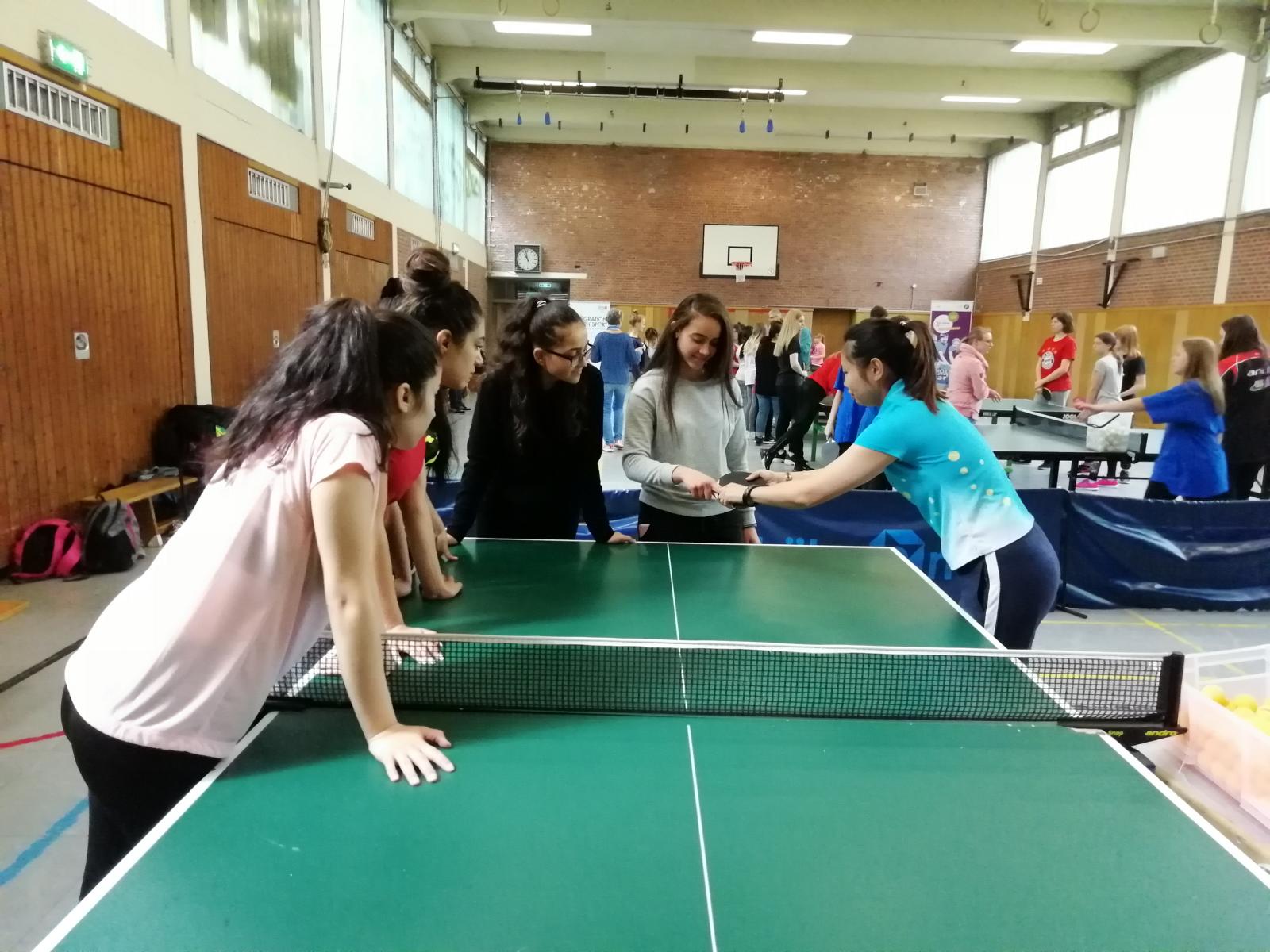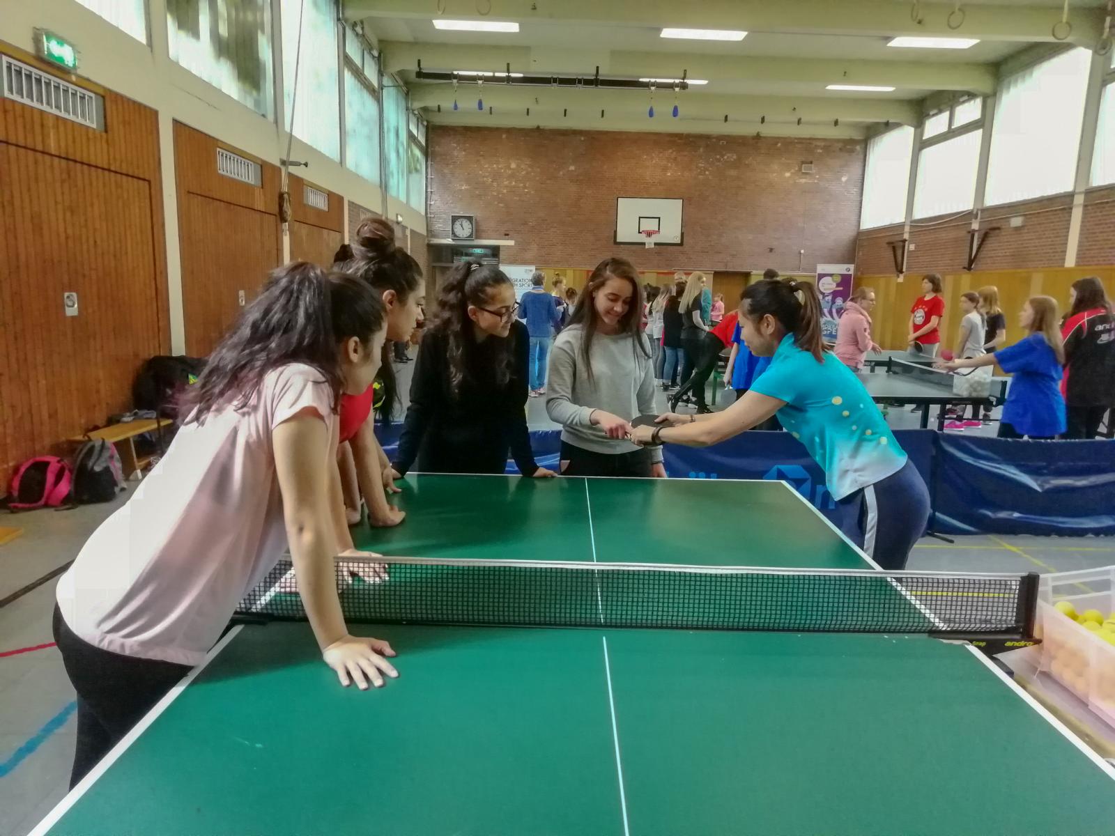 Gegen 10:30 Uhr haben sich in der Sporthalle der Justus-von Liebig Schule 43 Schülerinnen aus 5 Schulen versammelt. Die Helferinnen aus der achten Klasse, hatten zuvor acht Tische in der Einfachhalle aufgebaut. Sie sind alle aktive TT-Spielerinnen, vier von ihnen haben Fluchtgeschichte. Als besonderes Highlight konnten zwei Bundesligaspielerinnen für die Veranstaltung gewonnen werden!