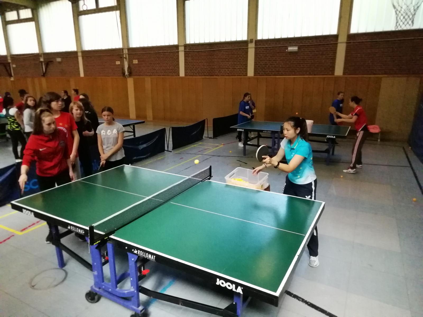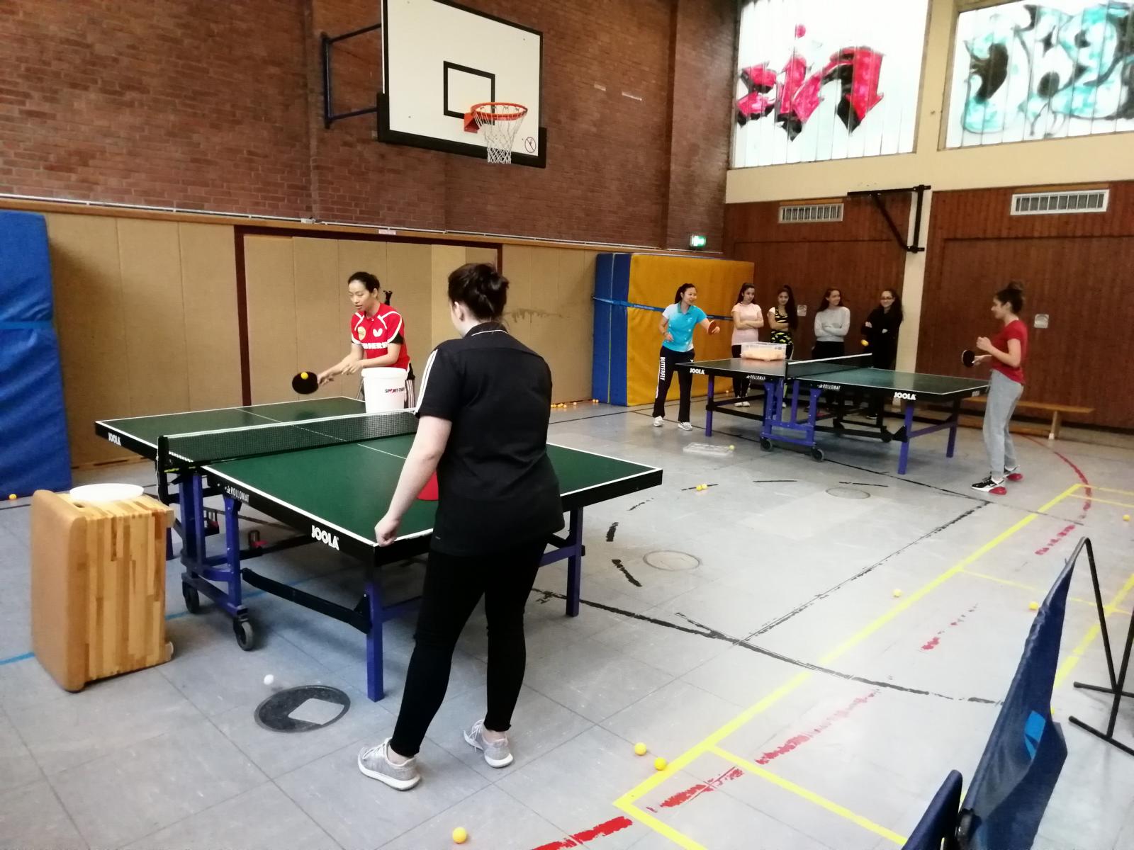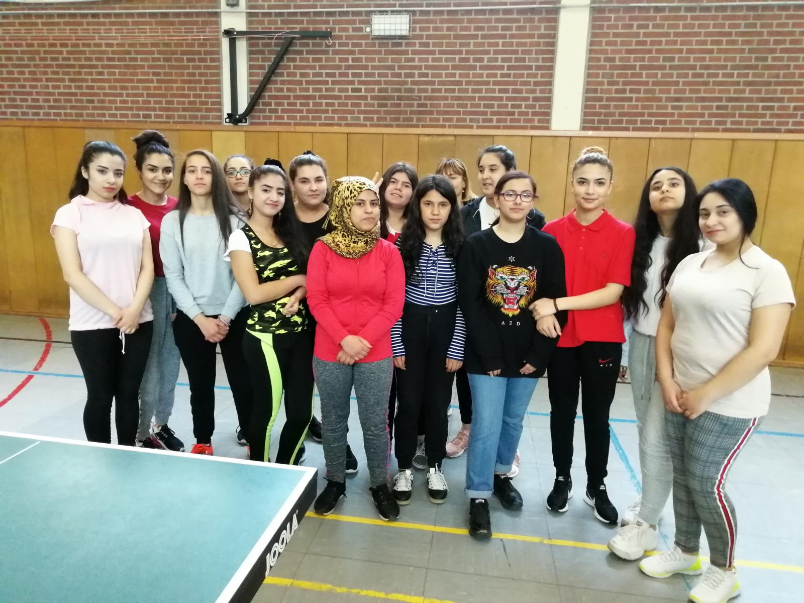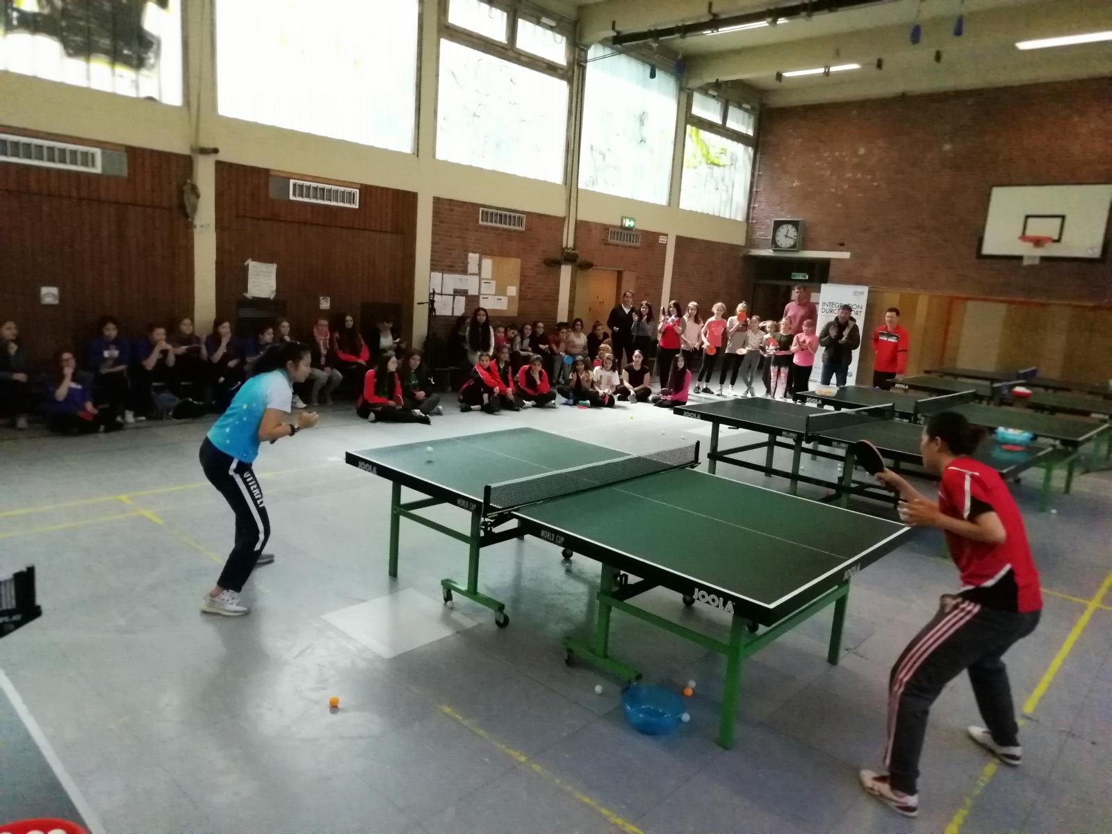 Gegen 10:30 Uhr haben sich in der Sporthalle der Justus-von Liebig Schule 43 Schülerinnen aus 5 Schulen versammelt. Die Helferinnen aus der achten Klasse, hatten zuvor acht Tische in der Einfachhalle aufgebaut. Sie sind alle aktive TT-Spielerinnen, vier von ihnen haben Fluchtgeschichte. Als besonderes Highlight konnten zwei Bundesligaspielerinnen für die Veranstaltung gewonnen werden!