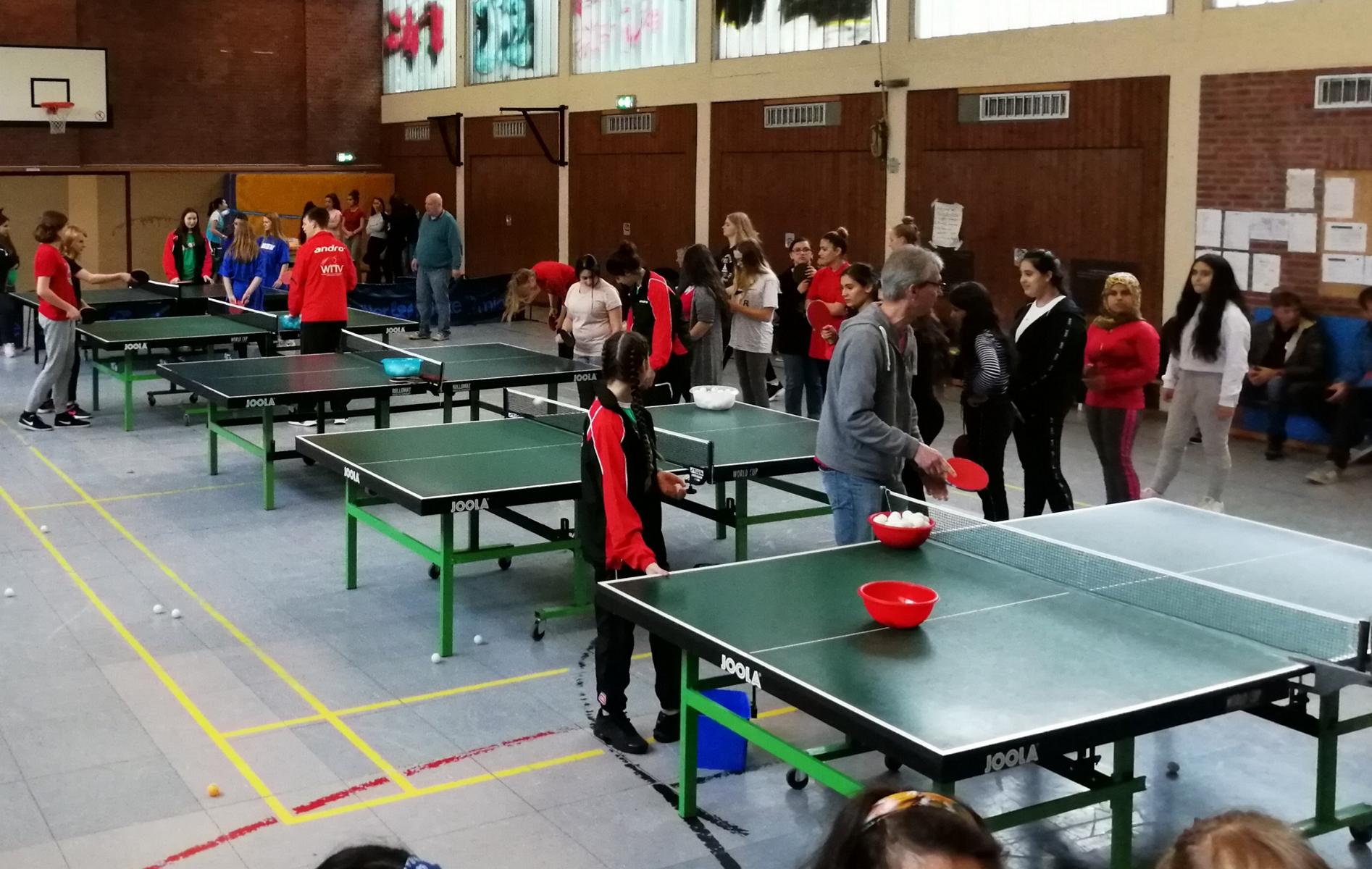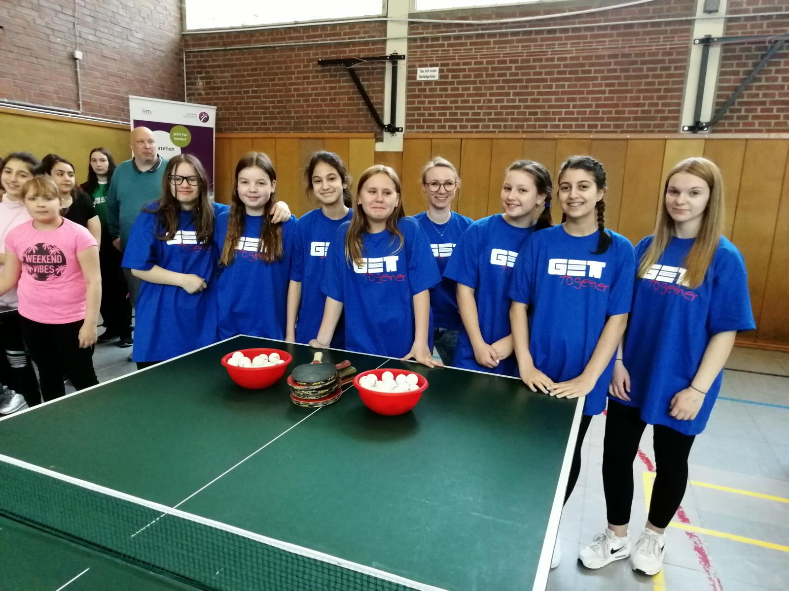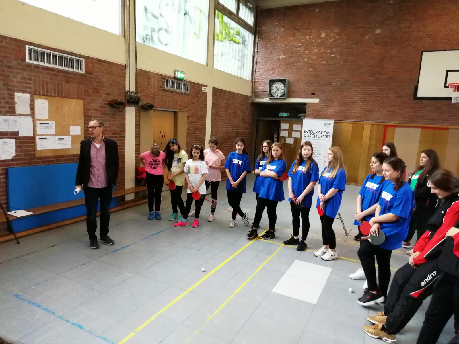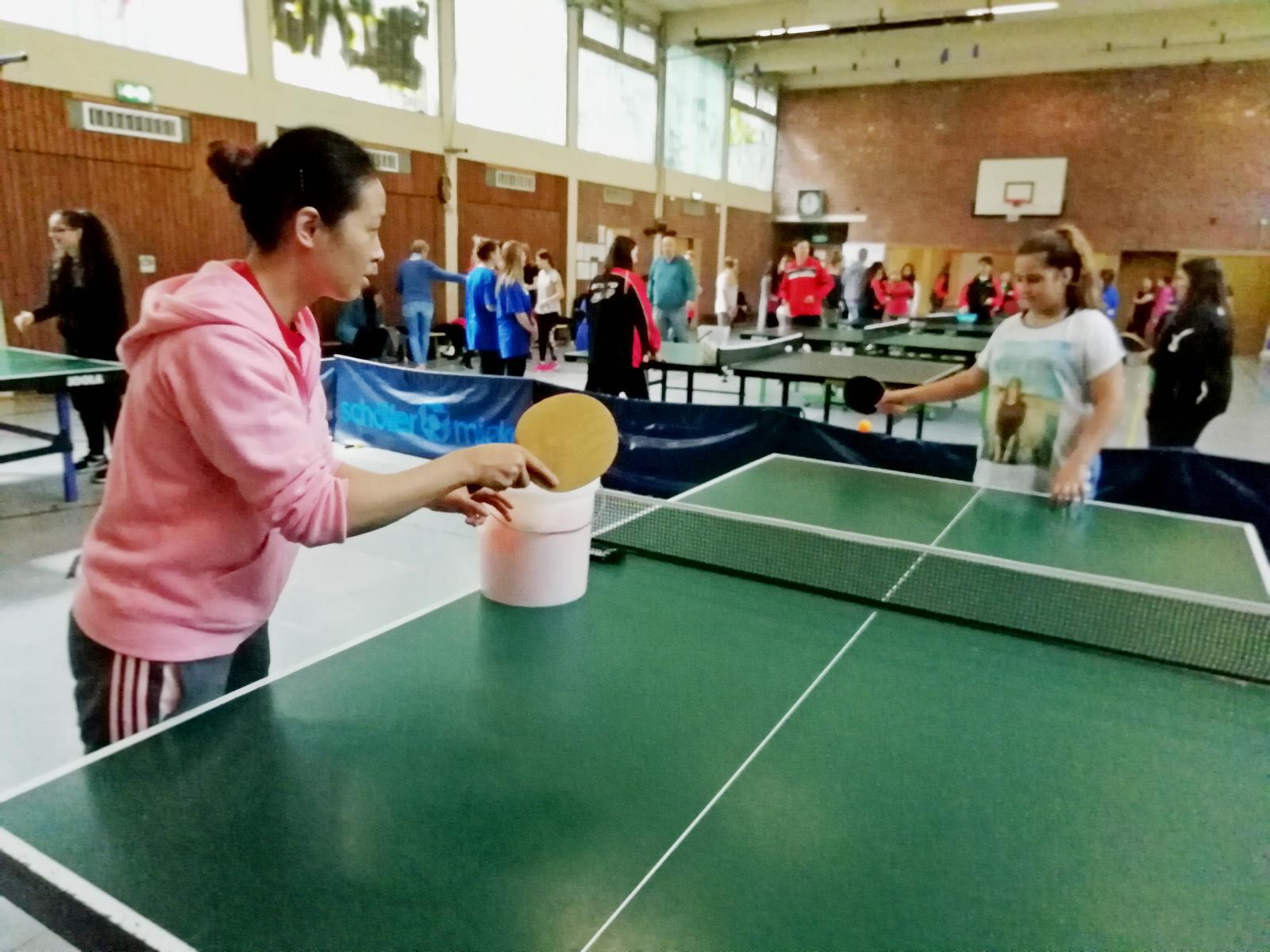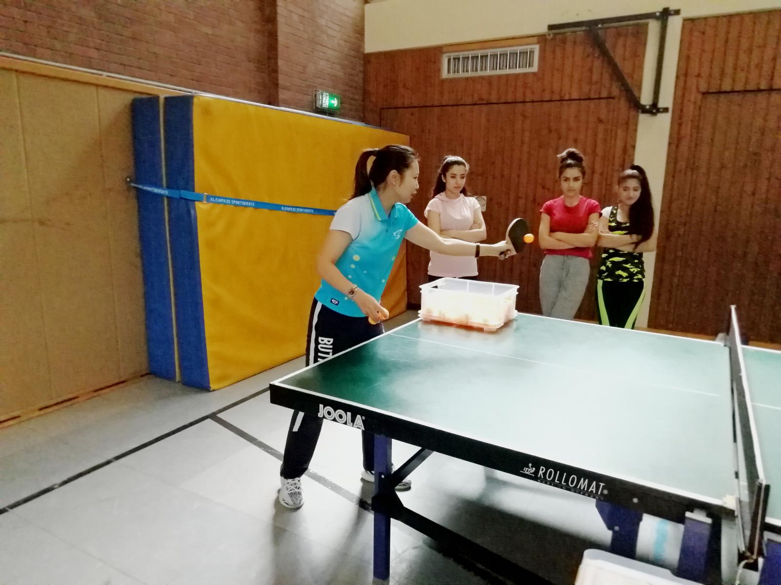 Gegen 10:30 Uhr haben sich in der Sporthalle der Justus-von Liebig Schule 43 Schülerinnen aus 5 Schulen versammelt. Die Helferinnen aus der achten Klasse, hatten zuvor acht Tische in der Einfachhalle aufgebaut. Sie sind alle aktive TT-Spielerinnen, vier von ihnen haben Fluchtgeschichte. Als besonderes Highlight konnten zwei Bundesligaspielerinnen für die Veranstaltung gewonnen werden!