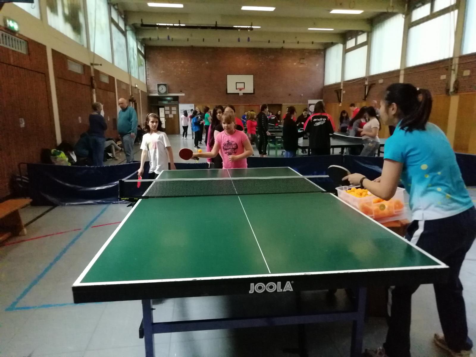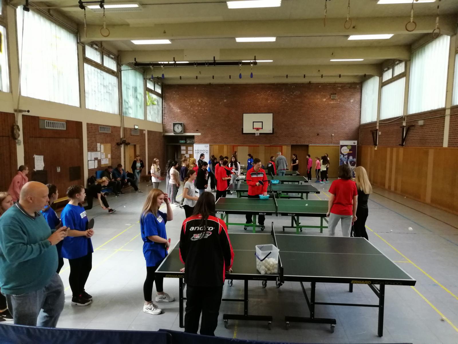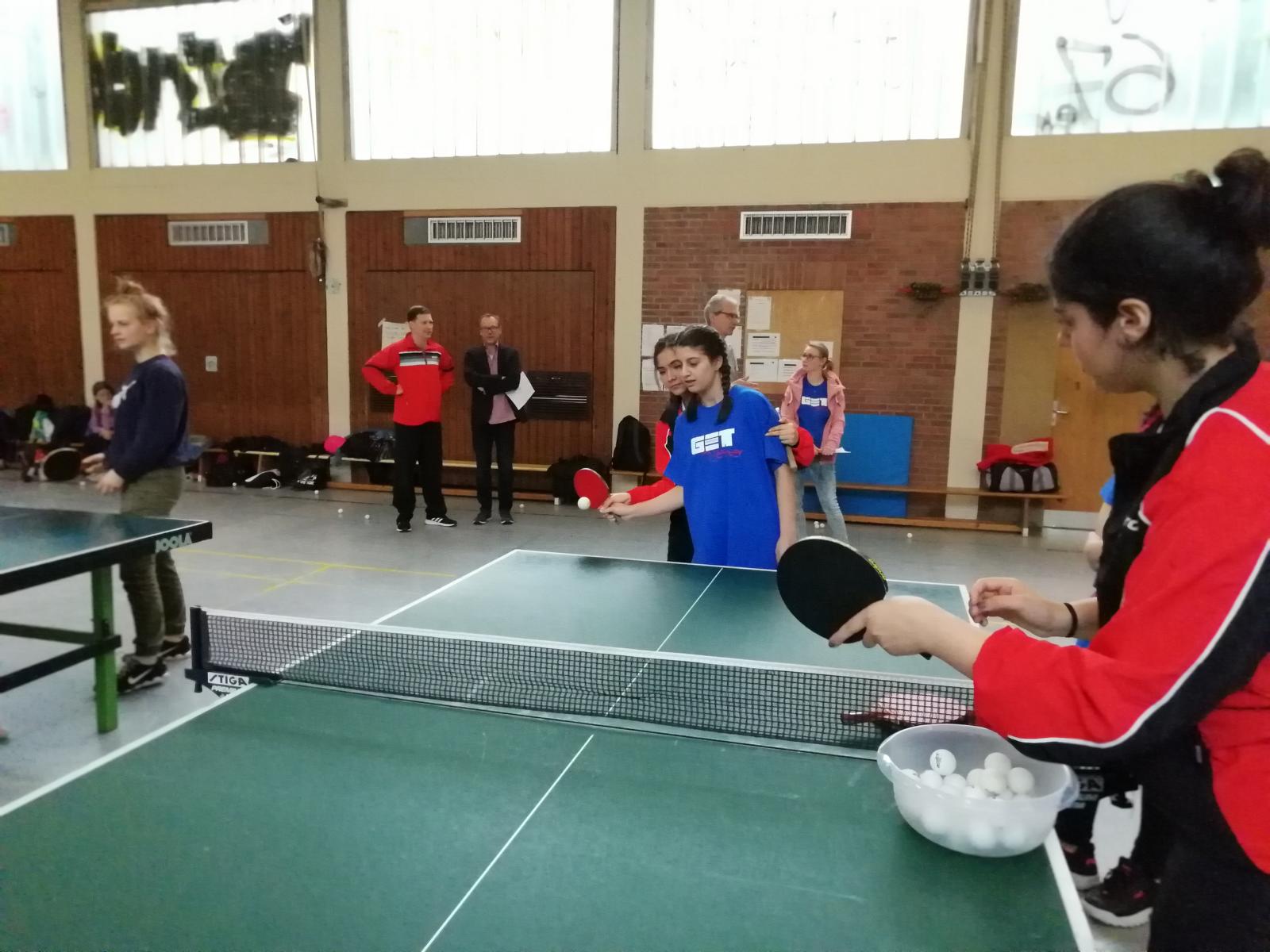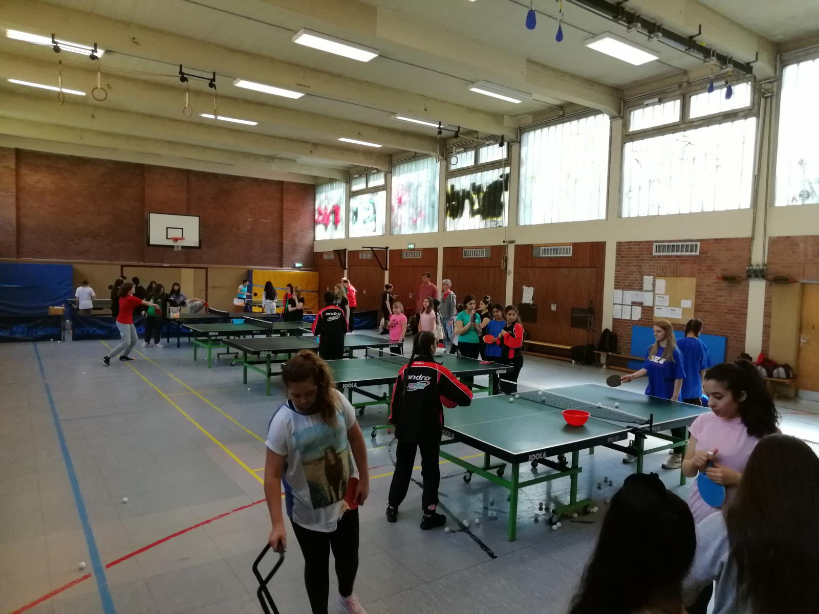 Gegen 10:30 Uhr haben sich in der Sporthalle der Justus-von Liebig Schule 43 Schülerinnen aus 5 Schulen versammelt. Die Helferinnen aus der achten Klasse, hatten zuvor acht Tische in der Einfachhalle aufgebaut. Sie sind alle aktive TT-Spielerinnen, vier von ihnen haben Fluchtgeschichte. Als besonderes Highlight konnten zwei Bundesligaspielerinnen für die Veranstaltung gewonnen werden!