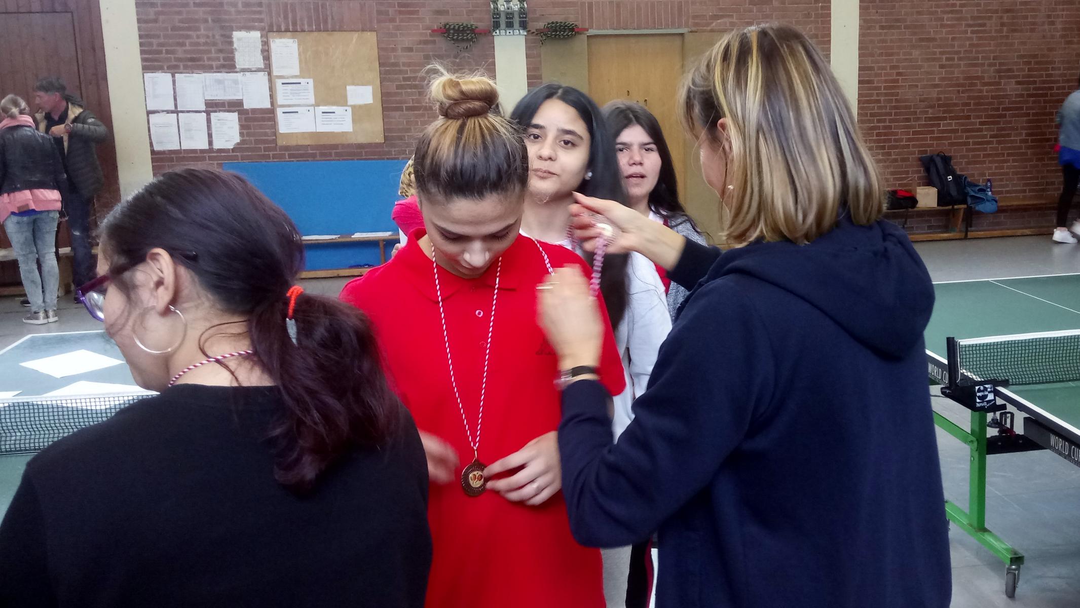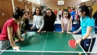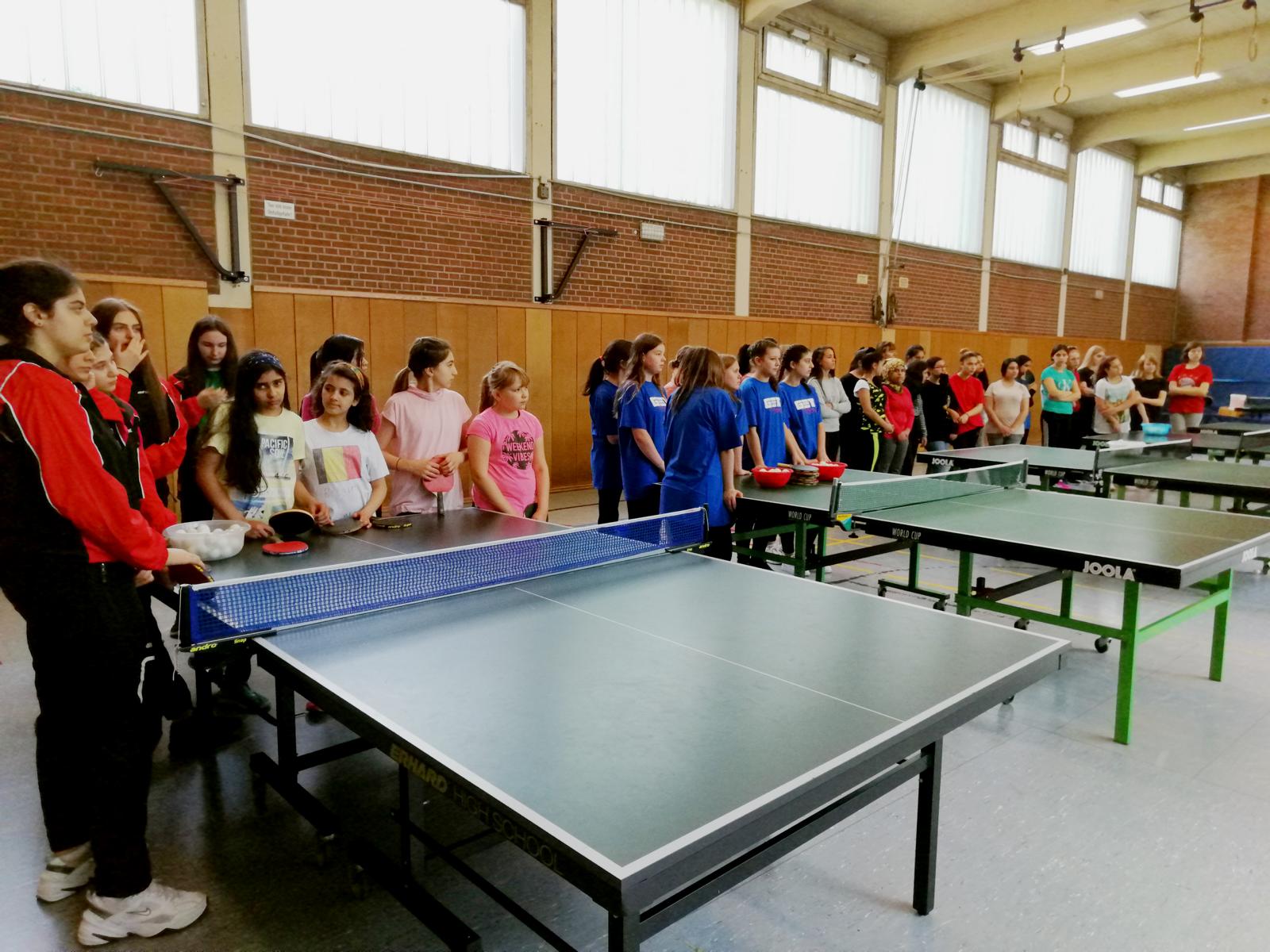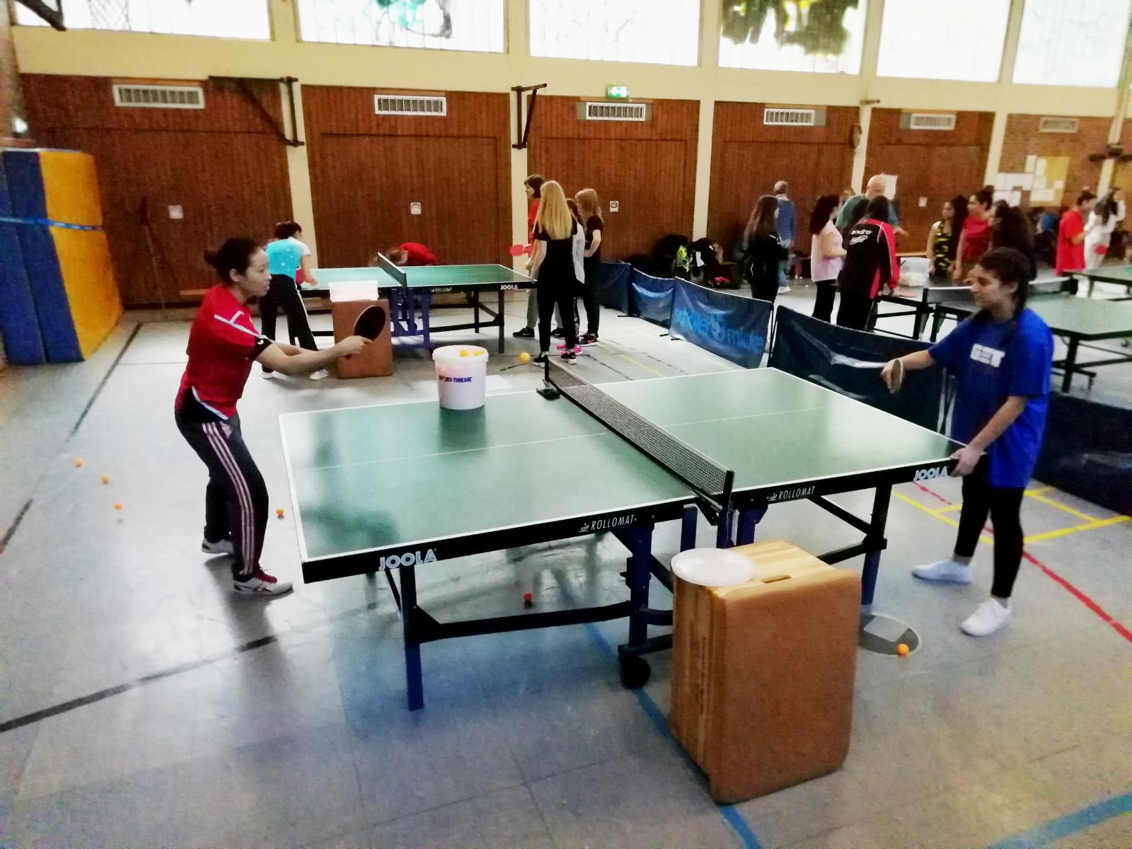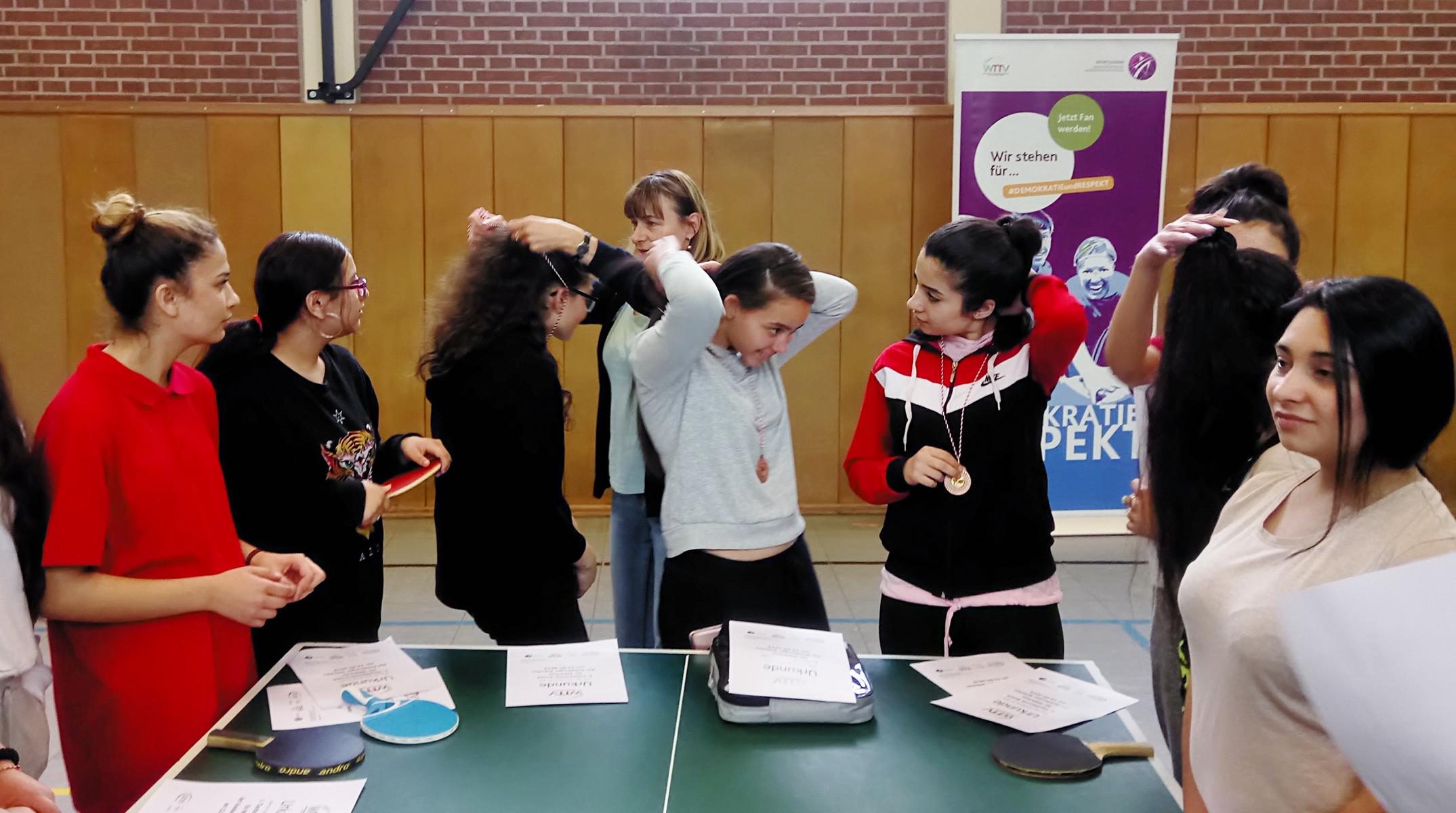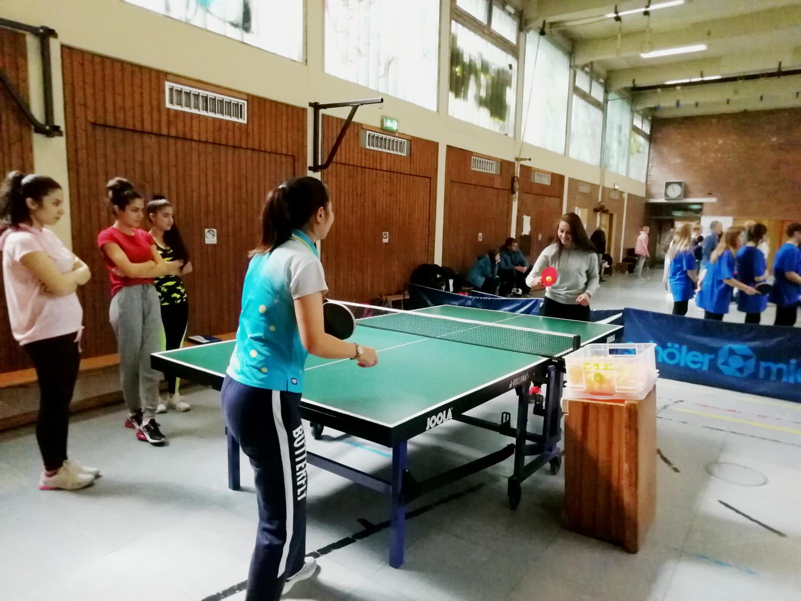 Gegen 10:30 Uhr haben sich in der Sporthalle der Justus-von Liebig Schule 43 Schülerinnen aus 5 Schulen versammelt. Die Helferinnen aus der achten Klasse, hatten zuvor acht Tische in der Einfachhalle aufgebaut. Sie sind alle aktive TT-Spielerinnen, vier von ihnen haben Fluchtgeschichte. Als besonderes Highlight konnten zwei Bundesligaspielerinnen für die Veranstaltung gewonnen werden!
