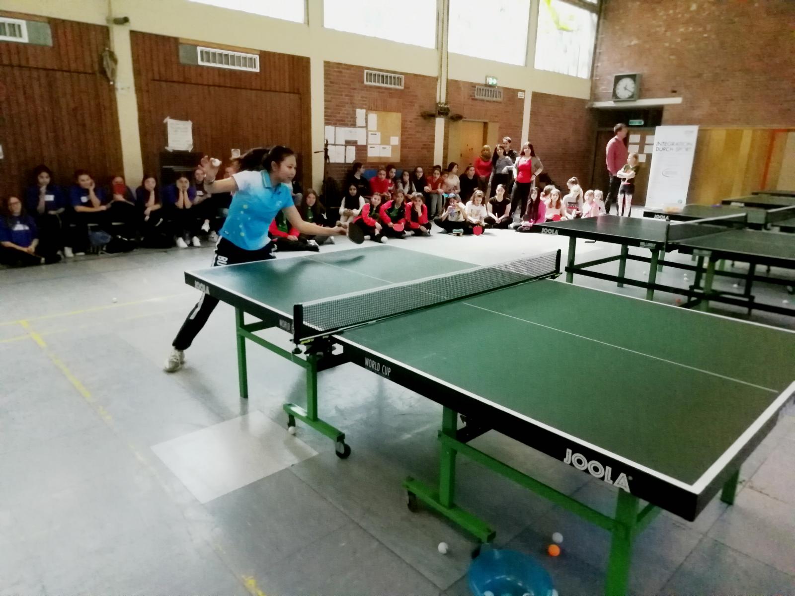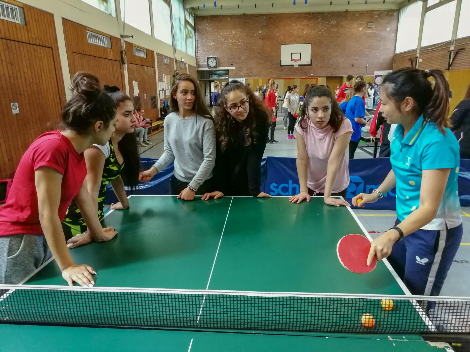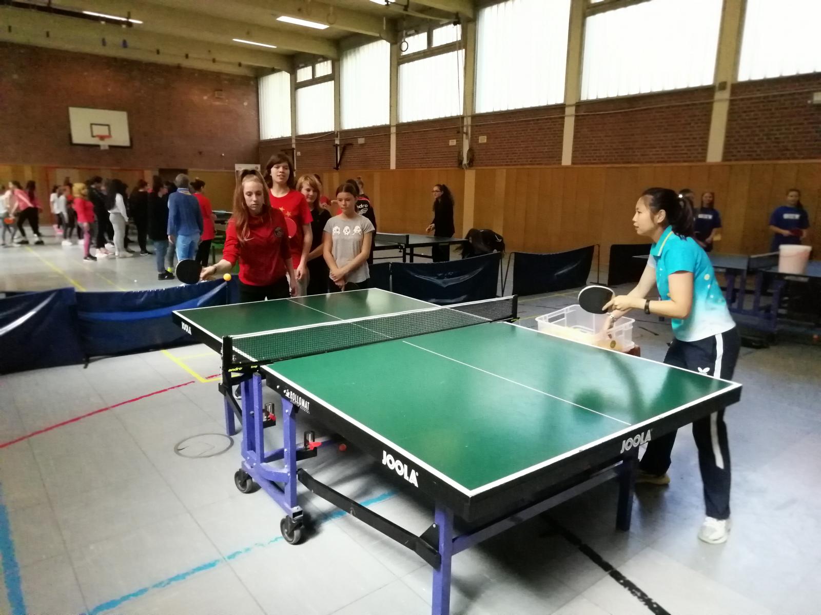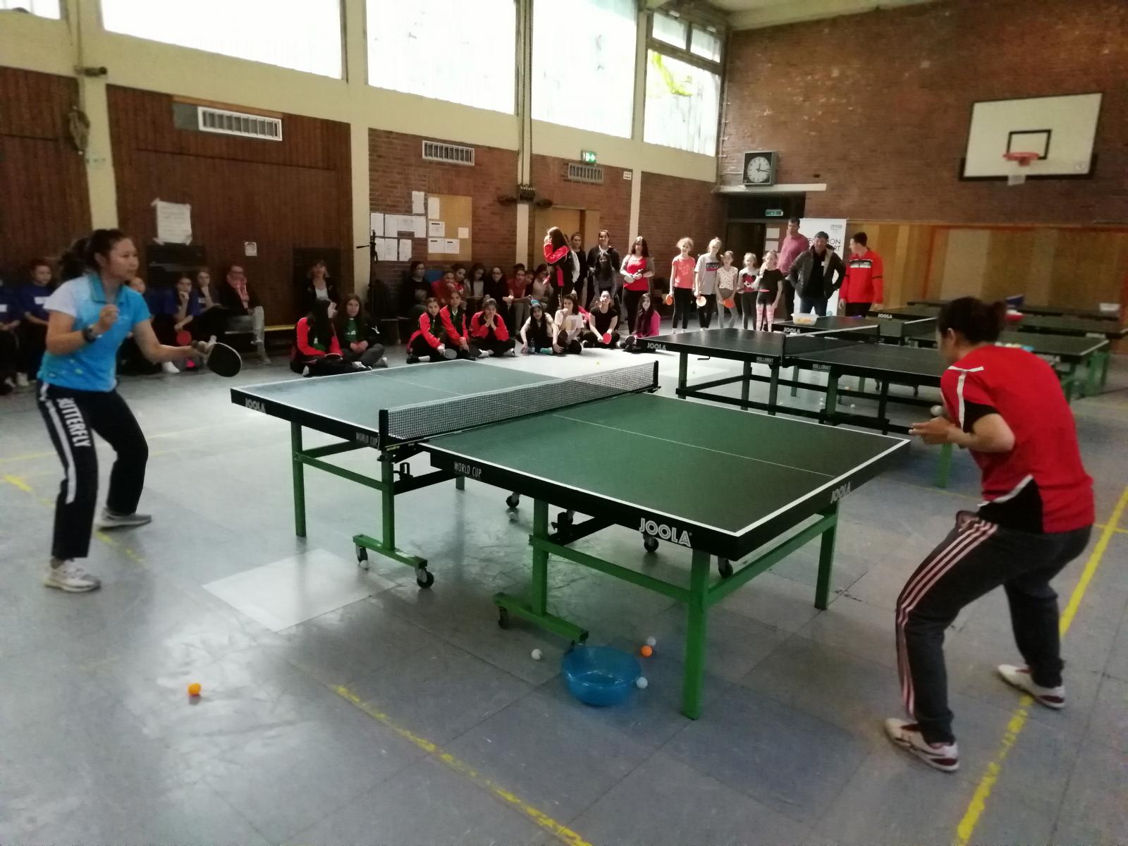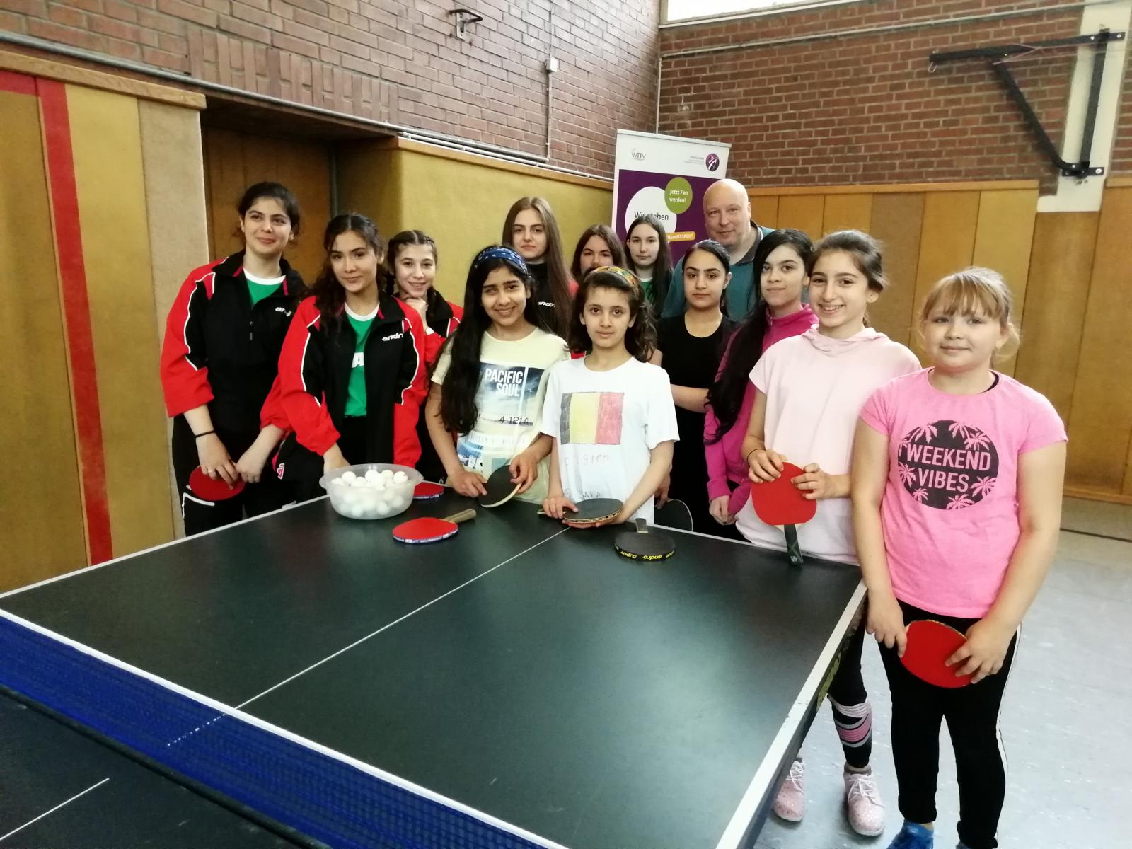 43 Mädchen aus 13 verschieden Nationen nahmen am 22.05.2019 teil an dem „ersten Tischtennis-Event der Duisburger Schulen“ und bekamen Tipps von zwei Bundesligaspielerinnen!