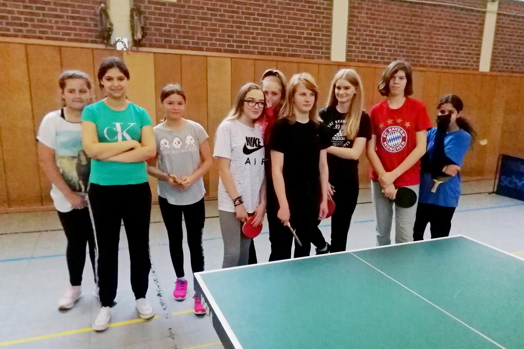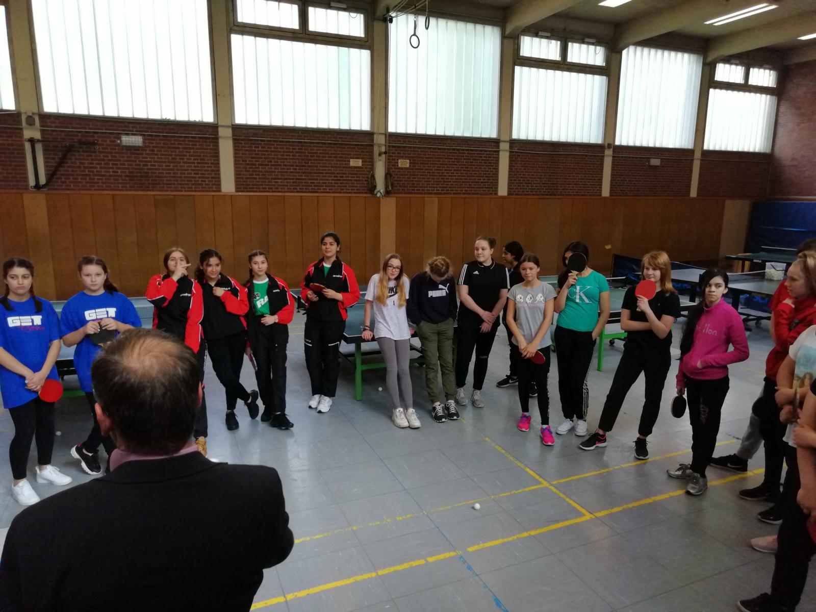 Nach der kurzen Begrüßung von Horst Nelles (Schulamt: Berater im Schulsport), Jörg Mischler, sowie dem Schulleiter ging es direkt los mit dem Balleimertraining, um die Mädchen auf das bevorstehende Turnier vorzubereiten. Hier konnten Vorhand- sowie Rückhandtechniken, Wechsel und Aufschläge geübt werden. Durch die vielen Ballkontakte war die Lernkurve bei allen Teilnehmerinnen sehr steil, sodass innerhalb von 1,5 Stunden alle in der Lage waren, den Ball zu spielen.