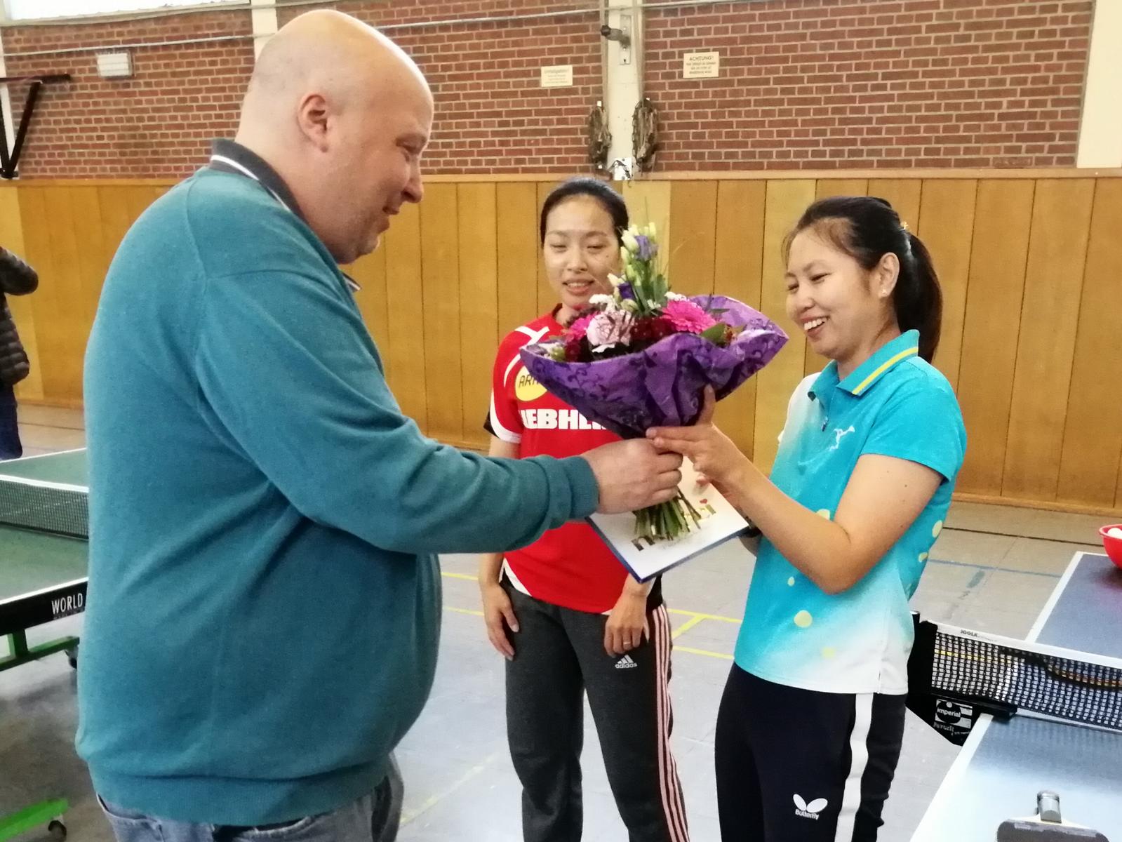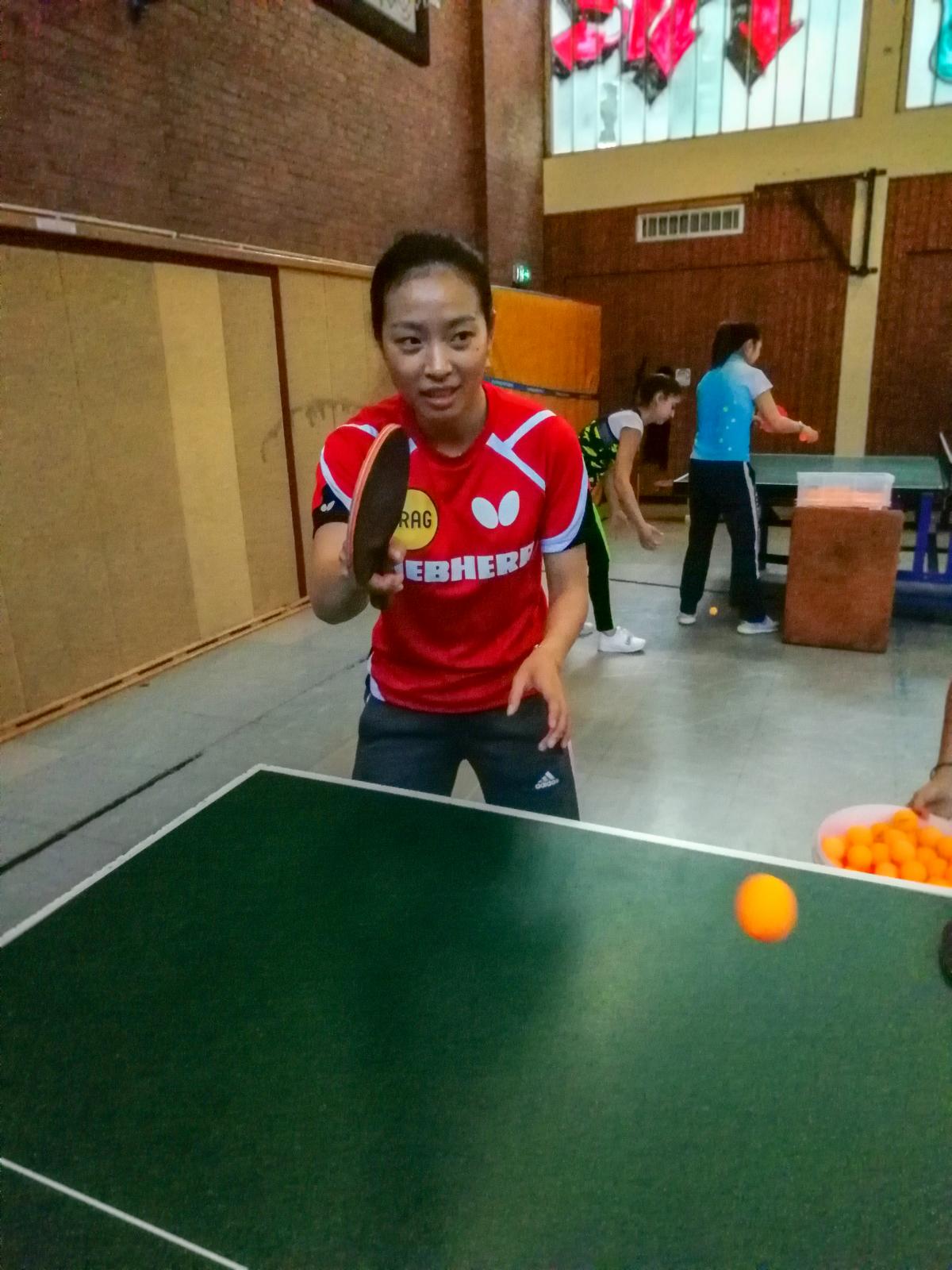 Nach der kurzen Pause wurde es ganz still und die Stimmung gespannt, als Annie Yang und Shi Qi (Bundesligaspielerinnen) die Schläger in die Hand nahmen und einen Showkampf präsentierten. So „angeheizt“ und motiviert ging es an den letzten Programmpunkt: Das 7 Punkte Ablösespiel.