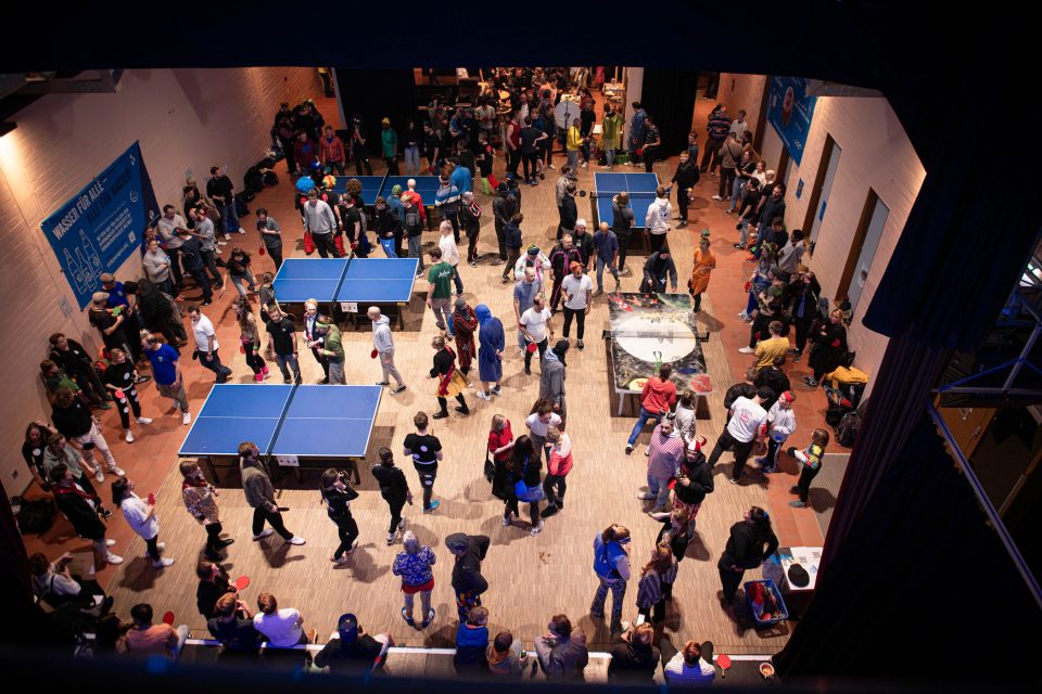 „Ja ‚is den heut‘ schon Karneval?“ Das wird sich so mancher gefragt haben, der am 02. November 2024 bunt kostümierte Gestalten auf dem Weg zum Bürgerzentrum Altenberger Hof in Köln Nippes sah. Das lag nicht an zeitlicher Desorientierung, sondern am Tischtennis-Rundlaufturnier viva movimiento von viva con agua Köln. Der Verein viva con agua generiert Spendengelder für Wasser-, Sanitär- und Hygieneprojekte (WASH) in Gebieten, in denen Menschen keinen Zugang zu sauberem Wasser, Toiletten und grundlegender Hygiene haben. Mit Projektpartnern werden z. B. in Südafrika und Nepal Brunnen gebohrt, Toilettenanlagen errichtet und Schulungen zu Themen der Hygiene durchgeführt – alles Dinge, die für uns selbstverständlich sind. Statt klassisch Spenden zu sammeln setzt der Verein unter dem Motto „all for profit“ darauf, deutschlandweit mit lokalen Crews vor Ort Interesse an den WASH-Themen zu wecken und mit Aktionen wie z. B. Spendenläufen und Pfandbechersammlungen auf Konzerten und Festivals, Menschen zum Mitmachen zu bewegen und so zu Spendern zu machen. Dies folgt dem Ansatz der universellen Sprachen von Kunst, Musik und Sport, die unabhängig von sozialer Stellung etc. funktionieren (Universal Language Approach ULA). Er bringt Menschen über alle kulturellen Barrieren hinaus in einen positiven Austausch. Fester Bestandteil des Aktionskalenders der Kölner Crew ist das Tischtennis-Rundlaufturnier, das mittlerweile zum 16. Mal stattfand. Der Teilnahmebeitrag und Einnahmen aus der Tombola und dem Verkauf von Speisen und Getränken sorgen für die Finanzierung von Projekten zur Trinkwasserversorgung in Südafrika. Auch im Herbst 2024 konnten so knapp 5800 € für den guten Zweck erspielt werden.