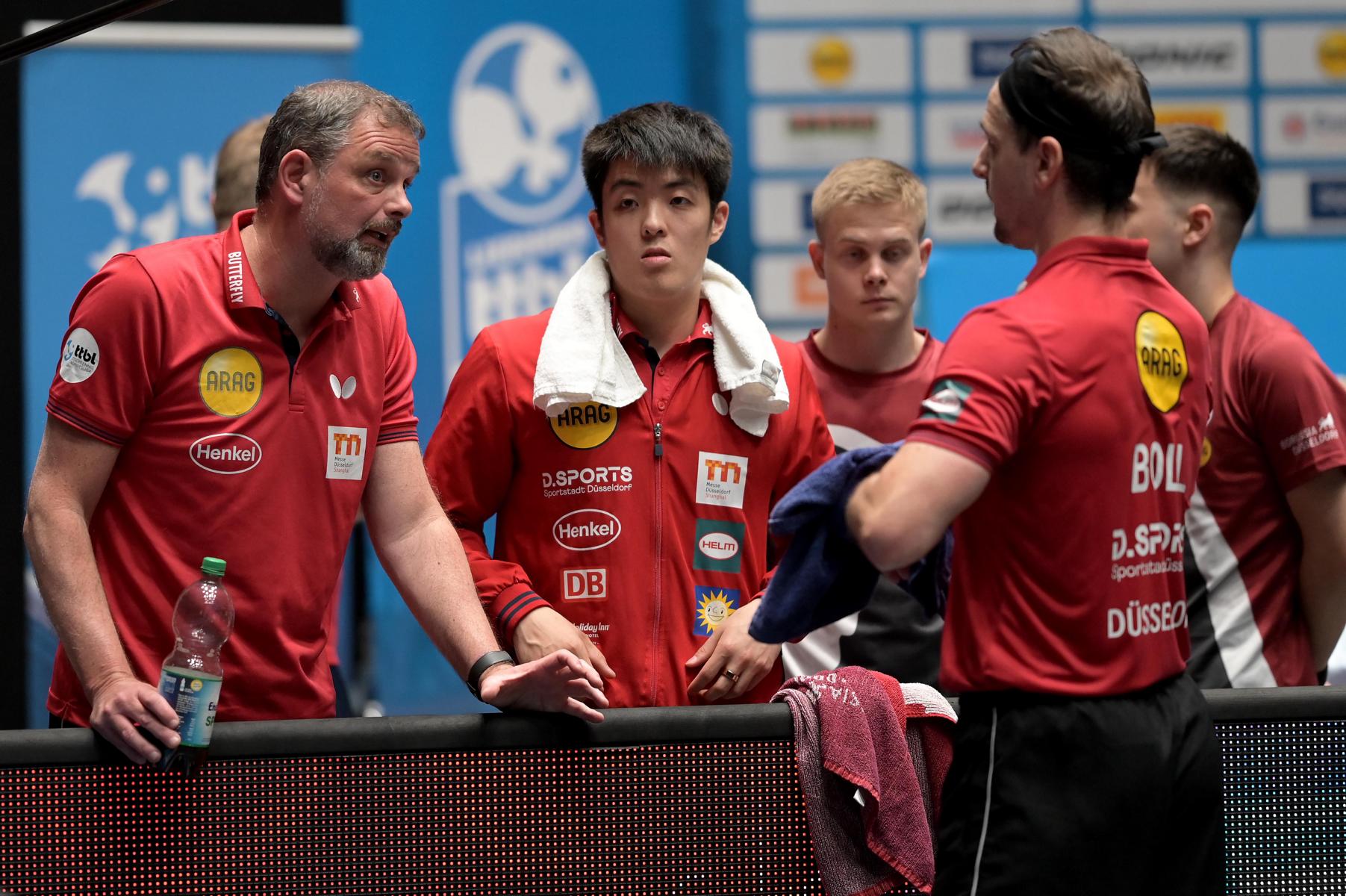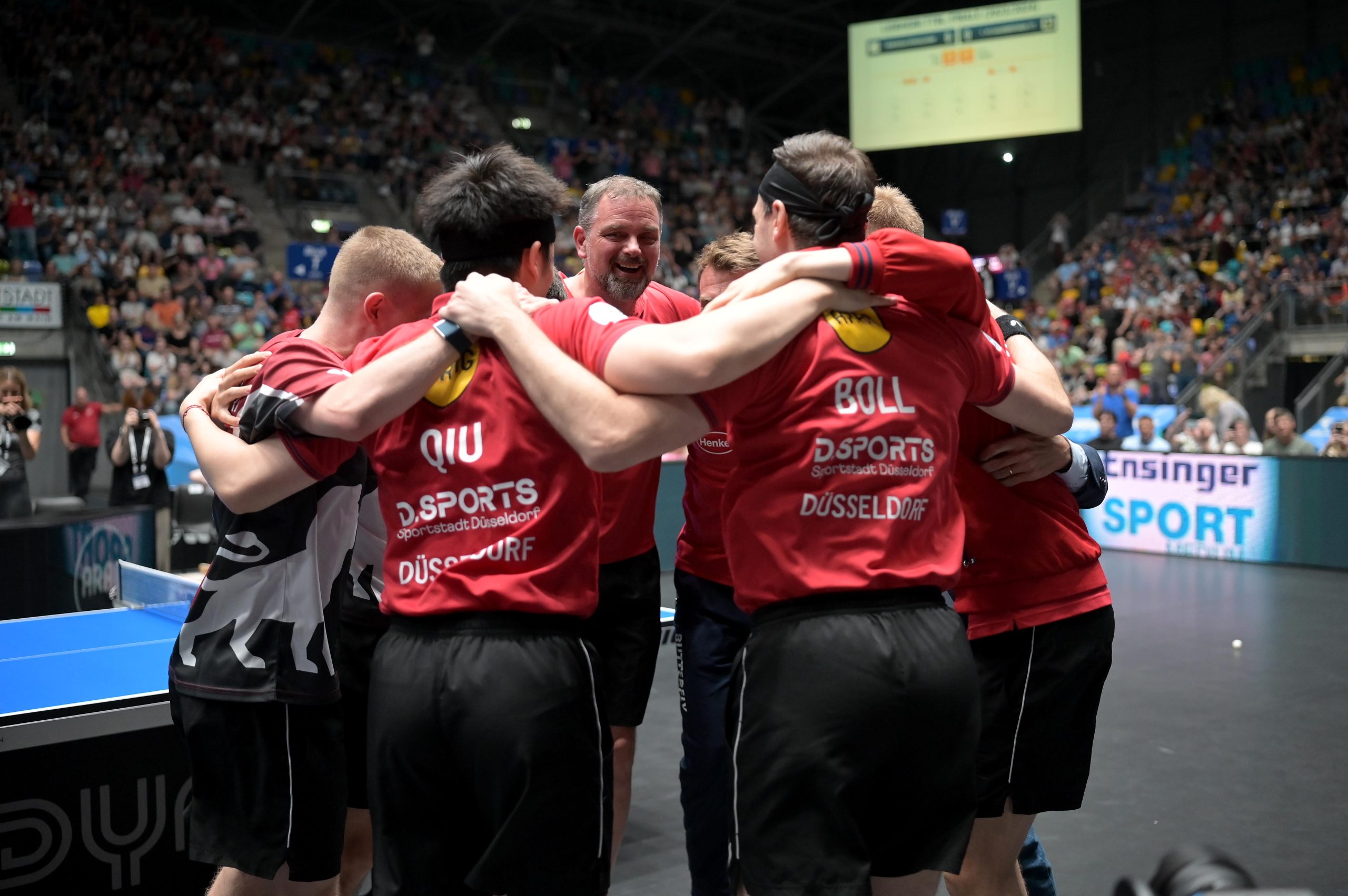 Mit einem Zwischenstand von 2:1 für die Borussen durften Dang Qiu und Darko Jorgic im nächsten und letzten Duell an den Tisch. Nachdem Qiu den ersten Satz mit 9:11 verloren hatte, schaffte er das sehr seltene Kunststück in der TTBL, Jorgic mit 11:0 im zweiten Satz zu bezwingen. Auch die Sätze drei (11:8) und vier (11:4) holte sich der Nationalspieler, und nach dem letzten Ballwechsel gab es kein Halten mehr auf der Spielerbank und bei den Fans.