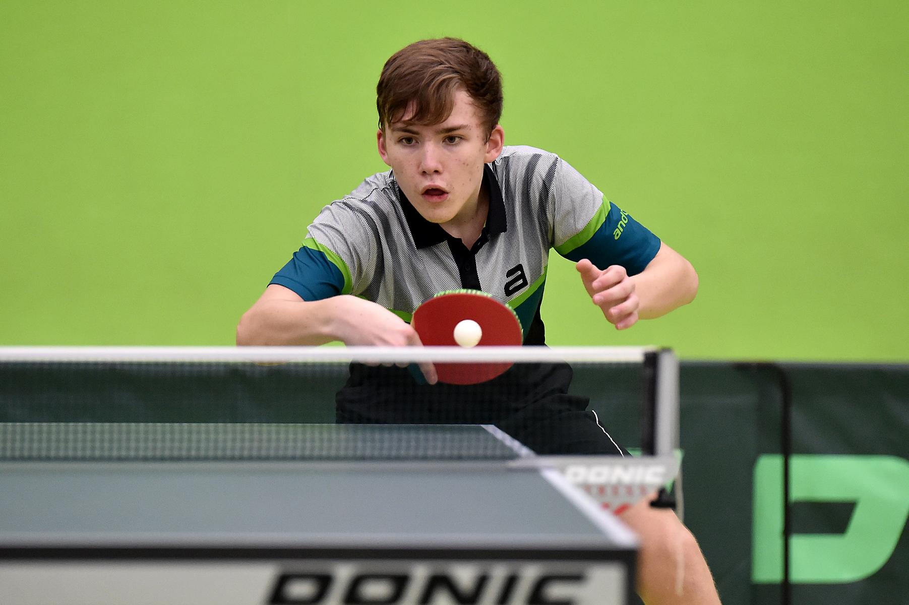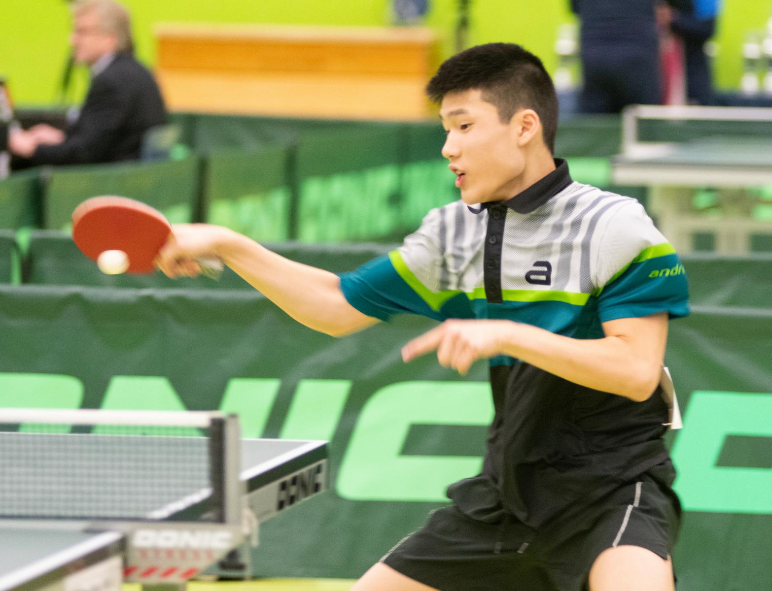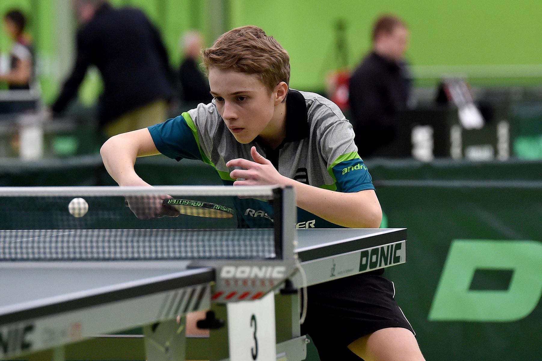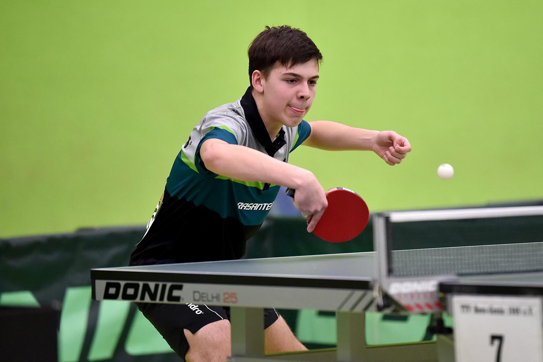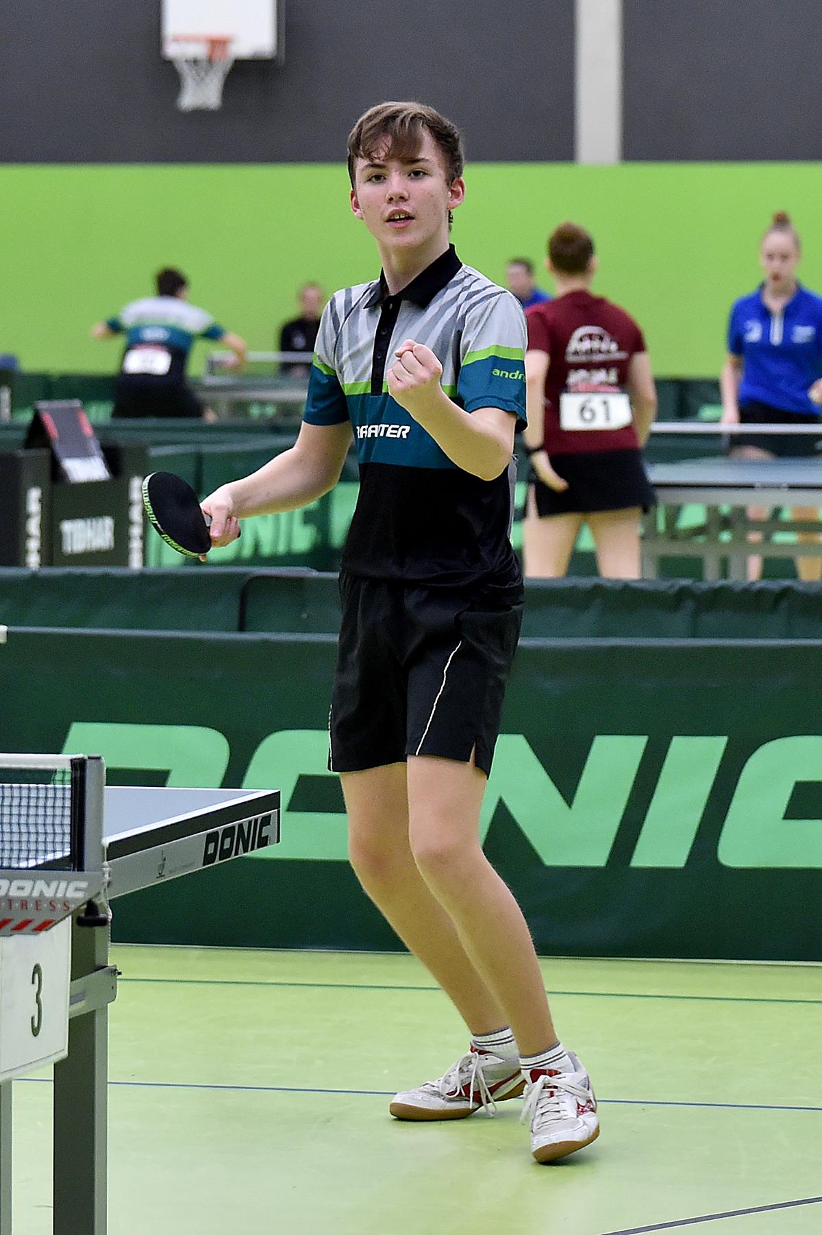 Sehr erfreulich war, dass sowohl Andre Bertelsmeier als auch Wim Verdonschot, die beide noch im nächsten Jahr bei den Schülern startberechtig sind, dieses auch erreichten. Beide kamen mit einer 2:1-Bilanz und damit Platz Zwei in der Gruppe in die Zwischenrunde. Wim traf hier auf Samuel Schürlein (TTBW) und es sah zu Beginn des Spiels gar nicht gut aus. Wim verlor die ersten beiden Sätze. Doch dann zündete er den Turbo, wurde immer offensiver und belohnte sich mit einem 11:3, 11:9, 11:5 und dem damit erreichten Achtelfinale.