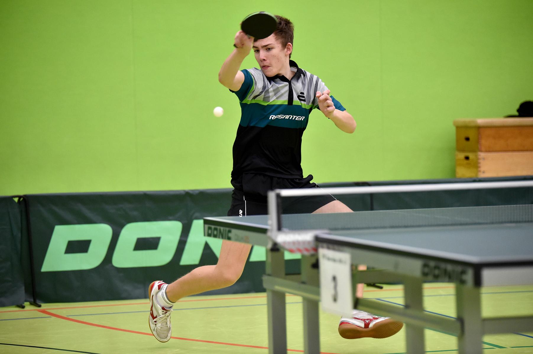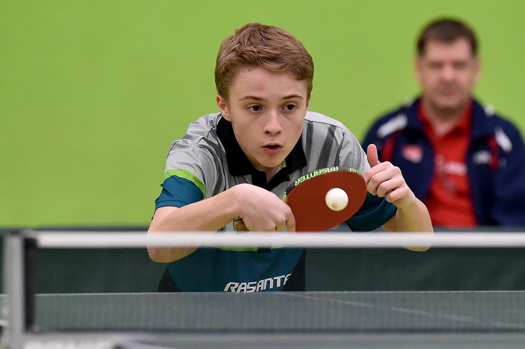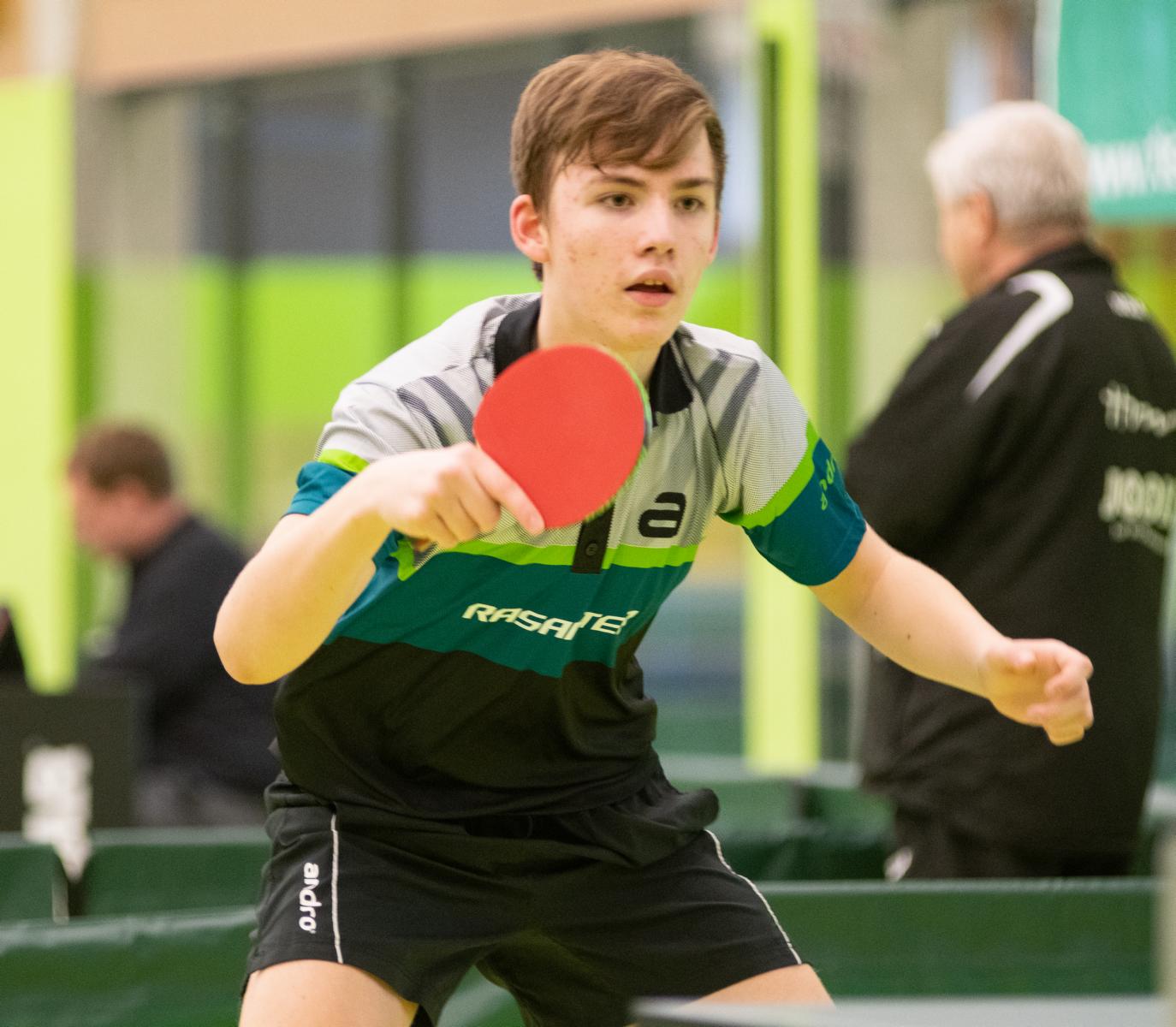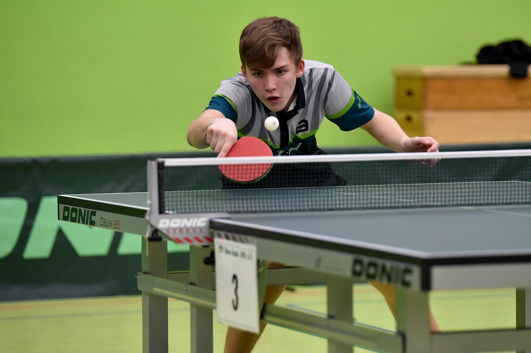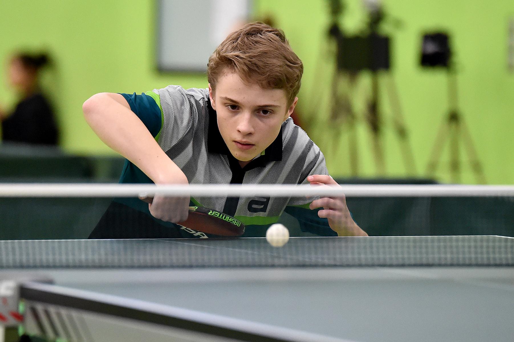 Sehr erfreulich war, dass sowohl Andre Bertelsmeier als auch Wim Verdonschot, die beide noch im nächsten Jahr bei den Schülern startberechtig sind, dieses auch erreichten. Beide kamen mit einer 2:1-Bilanz und damit Platz Zwei in der Gruppe in die Zwischenrunde. Wim traf hier auf Samuel Schürlein (TTBW) und es sah zu Beginn des Spiels gar nicht gut aus. Wim verlor die ersten beiden Sätze. Doch dann zündete er den Turbo, wurde immer offensiver und belohnte sich mit einem 11:3, 11:9, 11:5 und dem damit erreichten Achtelfinale.