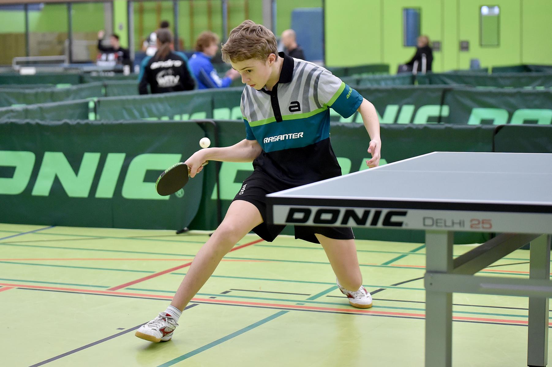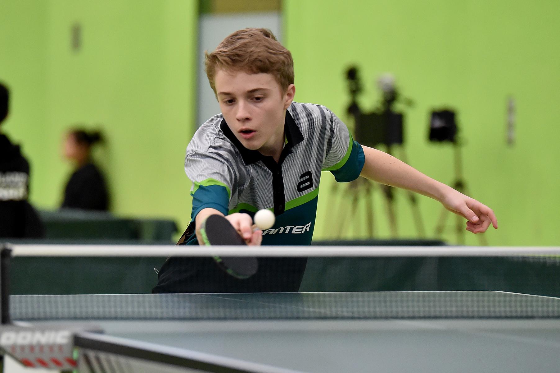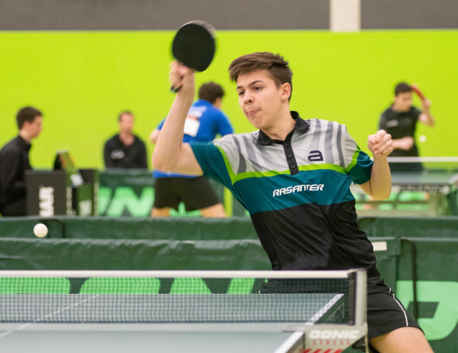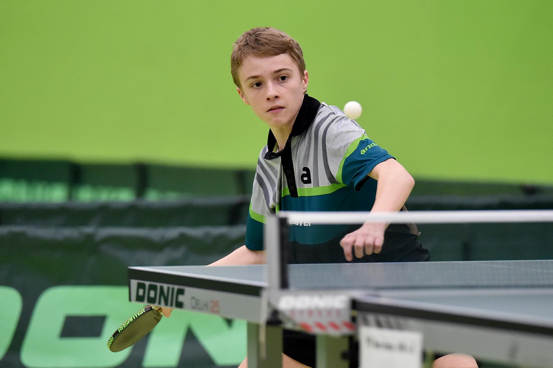 Sehr erfreulich war, dass sowohl Andre Bertelsmeier als auch Wim Verdonschot, die beide noch im nächsten Jahr bei den Schülern startberechtig sind, dieses auch erreichten. Beide kamen mit einer 2:1-Bilanz und damit Platz Zwei in der Gruppe in die Zwischenrunde. Wim traf hier auf Samuel Schürlein (TTBW) und es sah zu Beginn des Spiels gar nicht gut aus. Wim verlor die ersten beiden Sätze. Doch dann zündete er den Turbo, wurde immer offensiver und belohnte sich mit einem 11:3, 11:9, 11:5 und dem damit erreichten Achtelfinale.