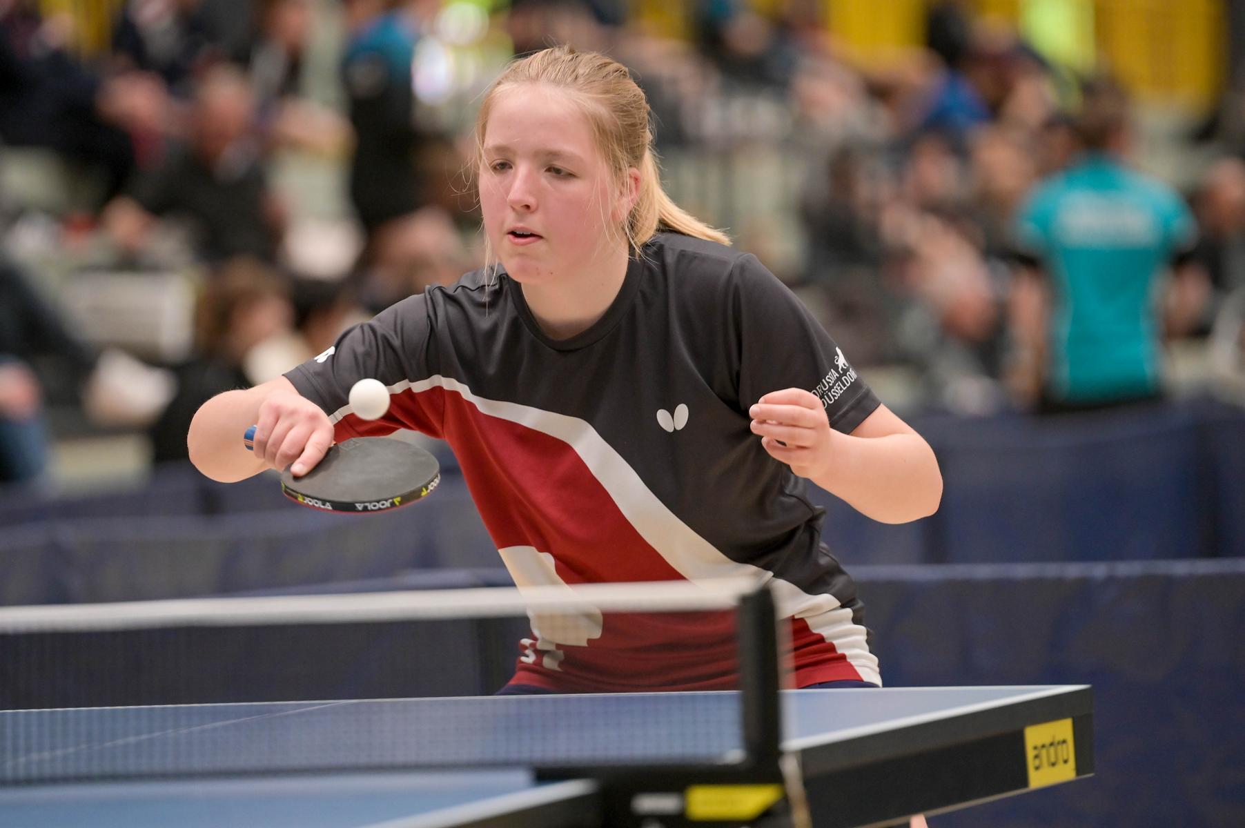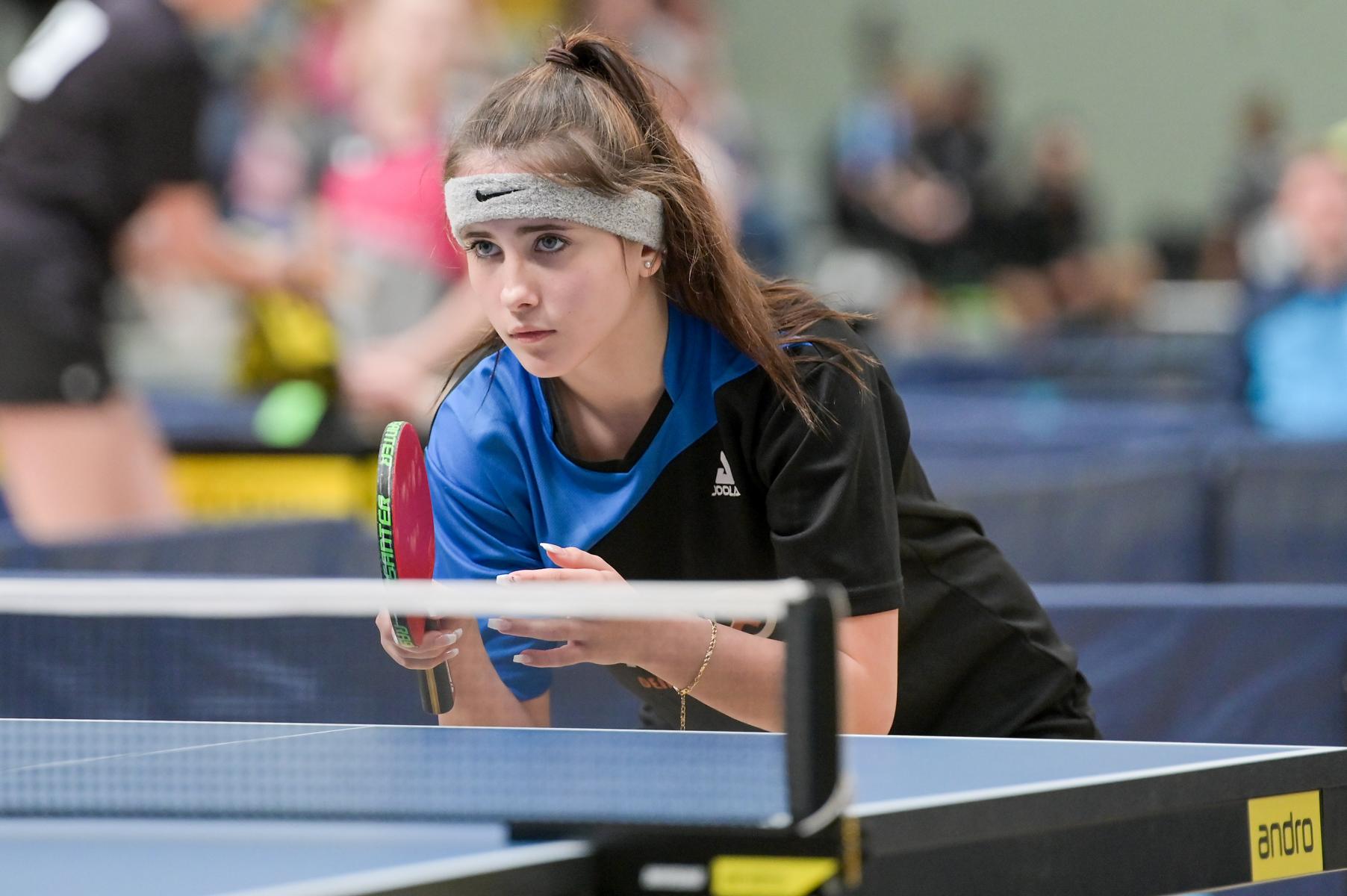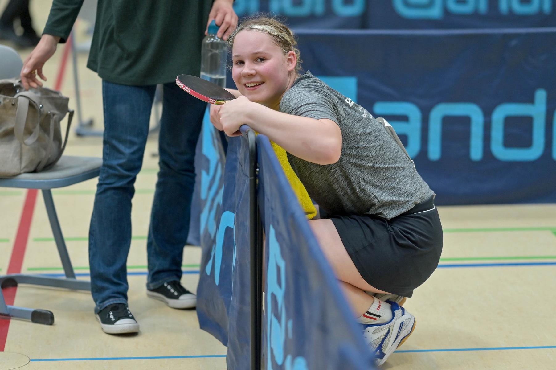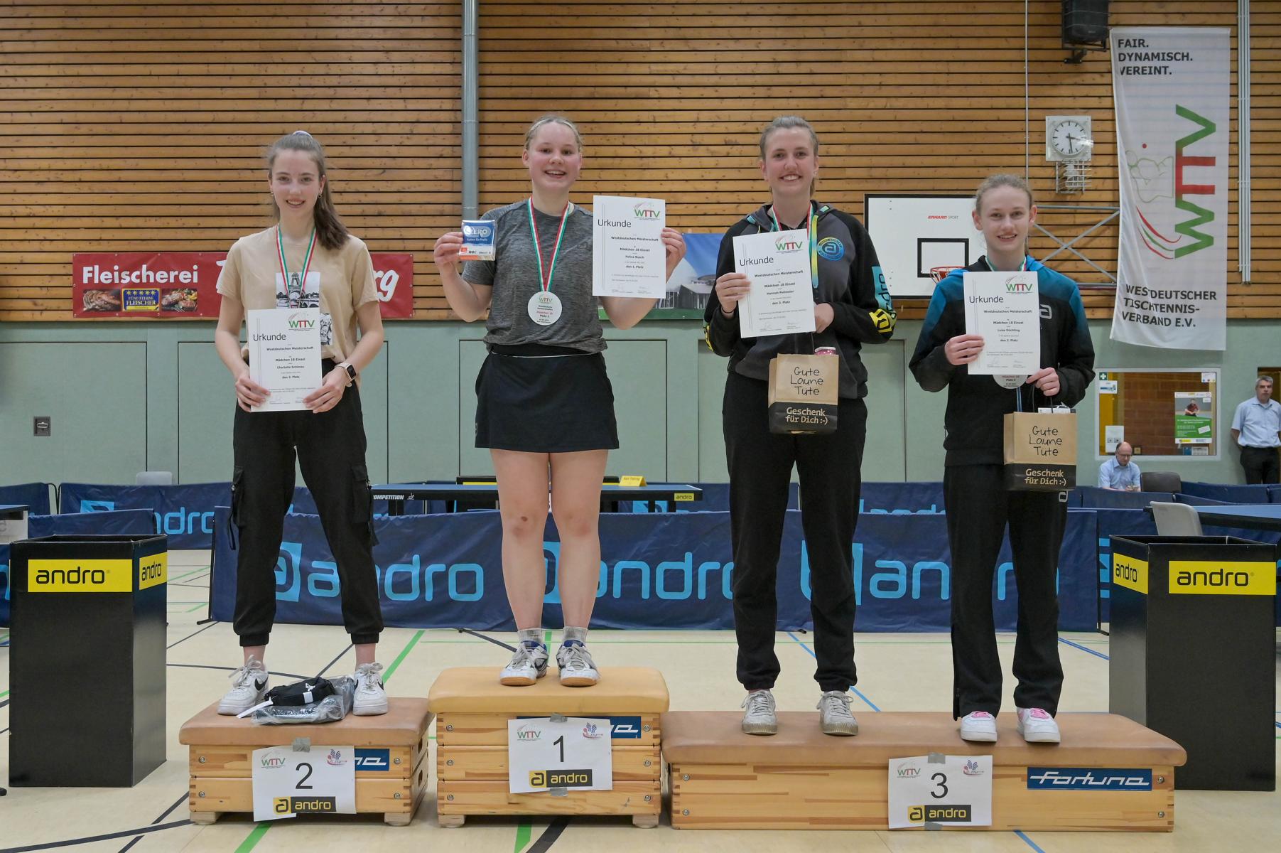 Auch bei den Mädchen 18 gab es in der Vorrunde keine Überraschungen und alle Favoritinnen zogen in die KO-Runde ein. Im Viertelfinale musste sich dann aber die an Position eins gesetzte Melinda Maiwald (TTV Hövelhof) Luisa Düchting (TTG Langenich) mit 1:3 geschlagen geben. Luisa traf dann im Halbfinale auf Felina Busch (SC Fortuna Bonn) und die beiden zeigten gerade im ersten Satz ein sehr spannendes Spiel, denn dieser endete mit 23:21 für Felina, die am Ende das Spiel dann in vier Sätzen für sich entscheiden konnte. Das zweite Halbfinale bestritten Charlotte Schönau (TTC GW Fritzdorf) und Hannah Pollmeier (TTV Hövelhof). Auch dieses Spiel gestaltete sich äußerst knapp, denn alle Sätze wurden nur mit zwei Punkten Unterscheid gewonnen. Am Ende zog Charlotte mit einem 3:1 ins Finale gegen Felina ein.