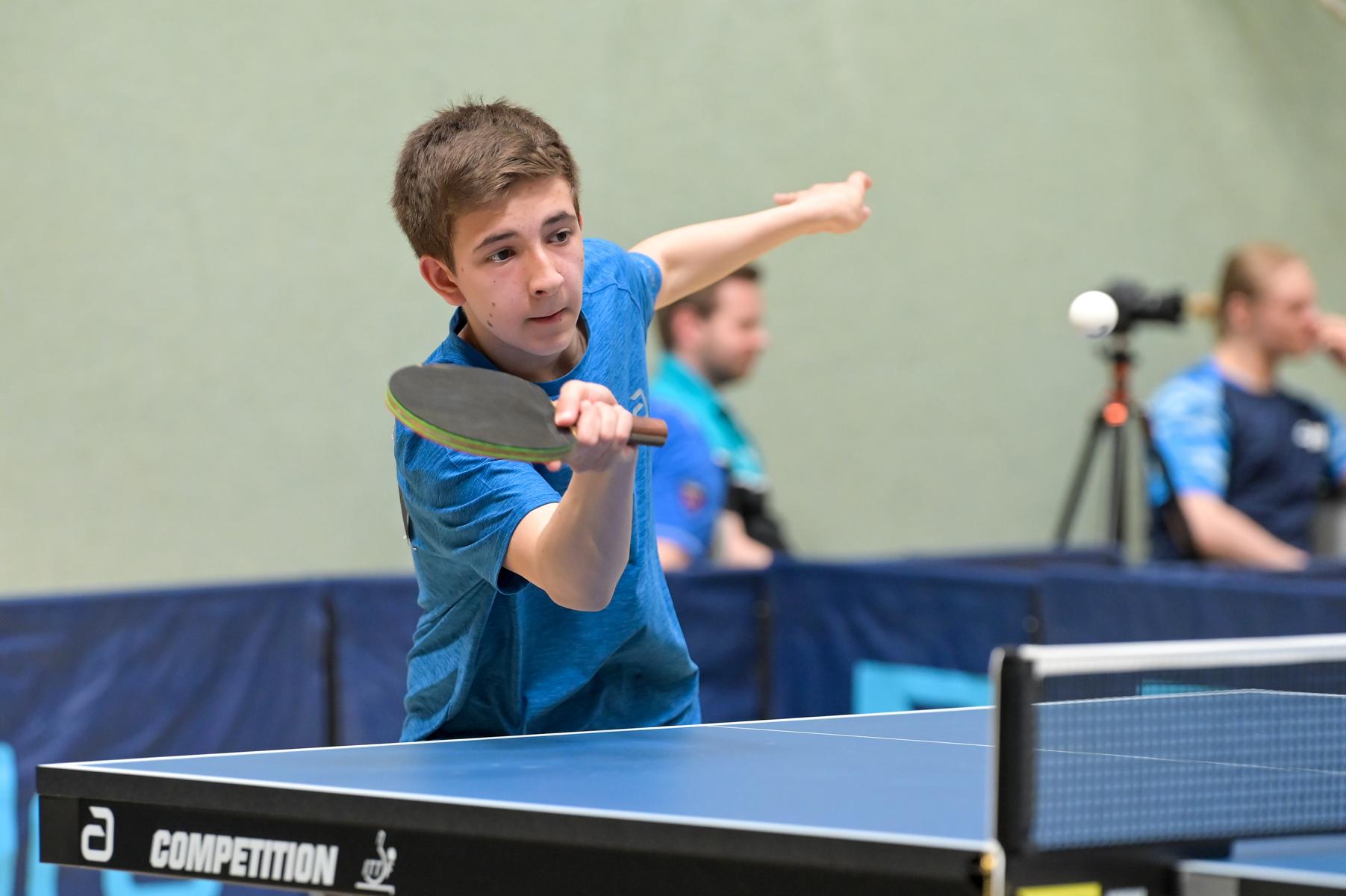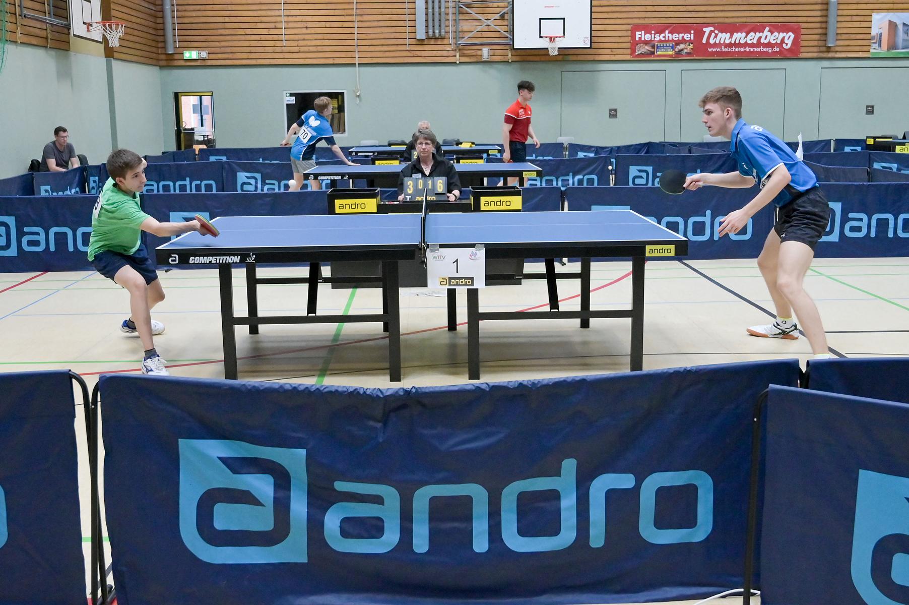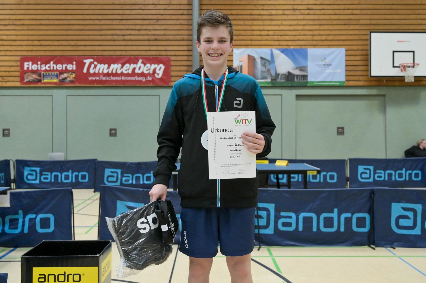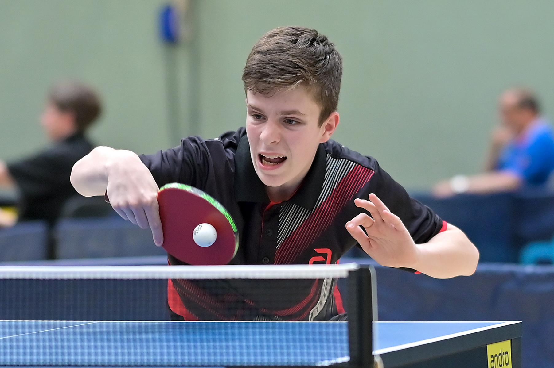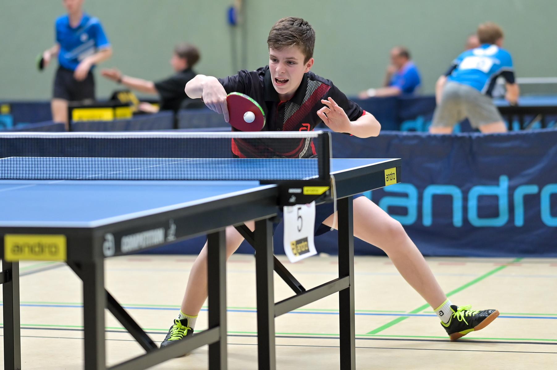 Los ging es am Samstag mit den älteren Athleten, der U18-Konkurrenz. Bei den Jungen setzte sich mit Wim Verdonschot (Borussia Dortmund), der im gesamten Turnier lediglich drei Sätze abgeben musste; verdient der topgesetzte Spieler durch. Sehr erfreulich war hier das Abschneiden der beiden U15-Spieler Friedrich Kühn von Burgsdorff (Post SV Gütersloh) und Noah Hersel (1. FC Köln), die sich beide erst dem späteren Sieger mit 3:0 bzw. 3:1 geschlagen geben mussten. Noah schaffte es im Finale sogar, Wim fast in den Entscheidungssatz zu zwingen, verlor den vierten Satz aber nach hartem Kampf mit 10:12. Platz drei sicherte sich neben Friedrich, Chris Andersen 8DJK Germania Lenkerbeck), der im Halbfinale Noah mit 1:3 unterlegen war.
