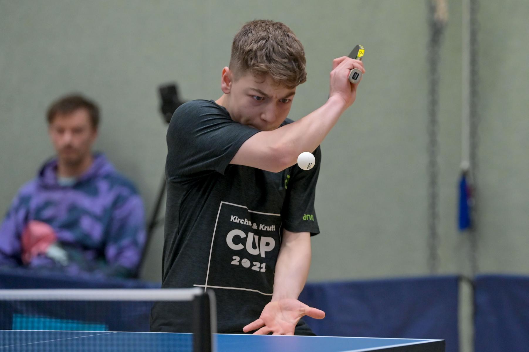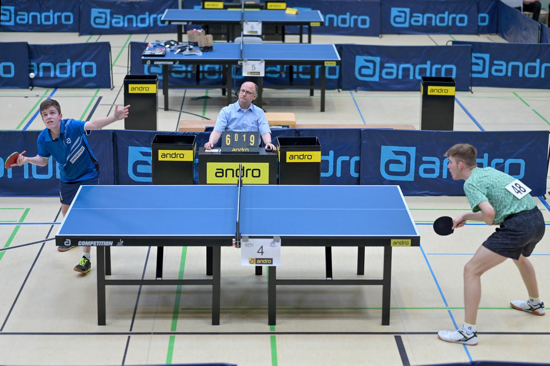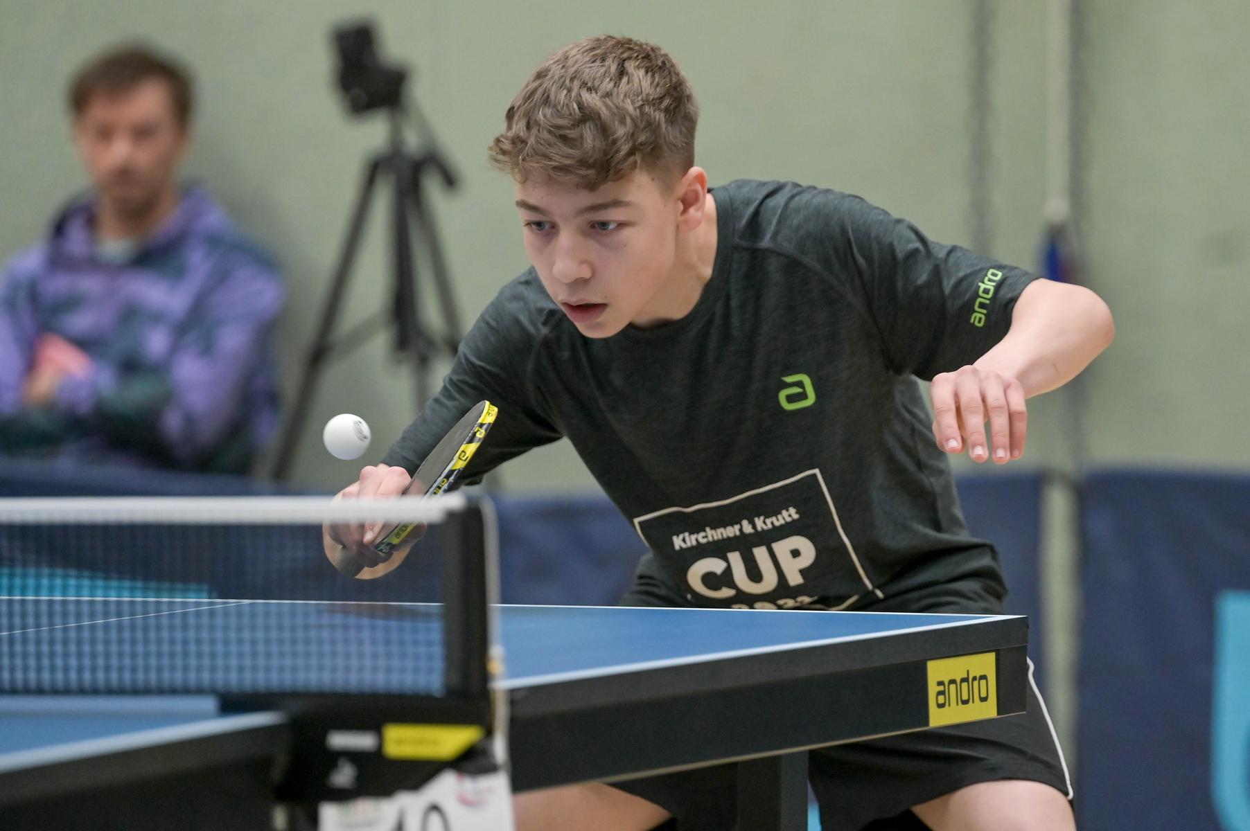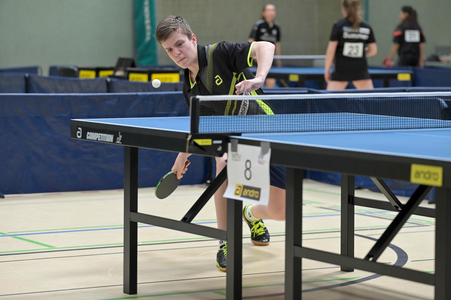 Los ging es am Samstag mit den älteren Athleten, der U18-Konkurrenz. Bei den Jungen setzte sich mit Wim Verdonschot (Borussia Dortmund), der im gesamten Turnier lediglich drei Sätze abgeben musste; verdient der topgesetzte Spieler durch. Sehr erfreulich war hier das Abschneiden der beiden U15-Spieler Friedrich Kühn von Burgsdorff (Post SV Gütersloh) und Noah Hersel (1. FC Köln), die sich beide erst dem späteren Sieger mit 3:0 bzw. 3:1 geschlagen geben mussten. Noah schaffte es im Finale sogar, Wim fast in den Entscheidungssatz zu zwingen, verlor den vierten Satz aber nach hartem Kampf mit 10:12. Platz drei sicherte sich neben Friedrich, Chris Andersen 8DJK Germania Lenkerbeck), der im Halbfinale Noah mit 1:3 unterlegen war.