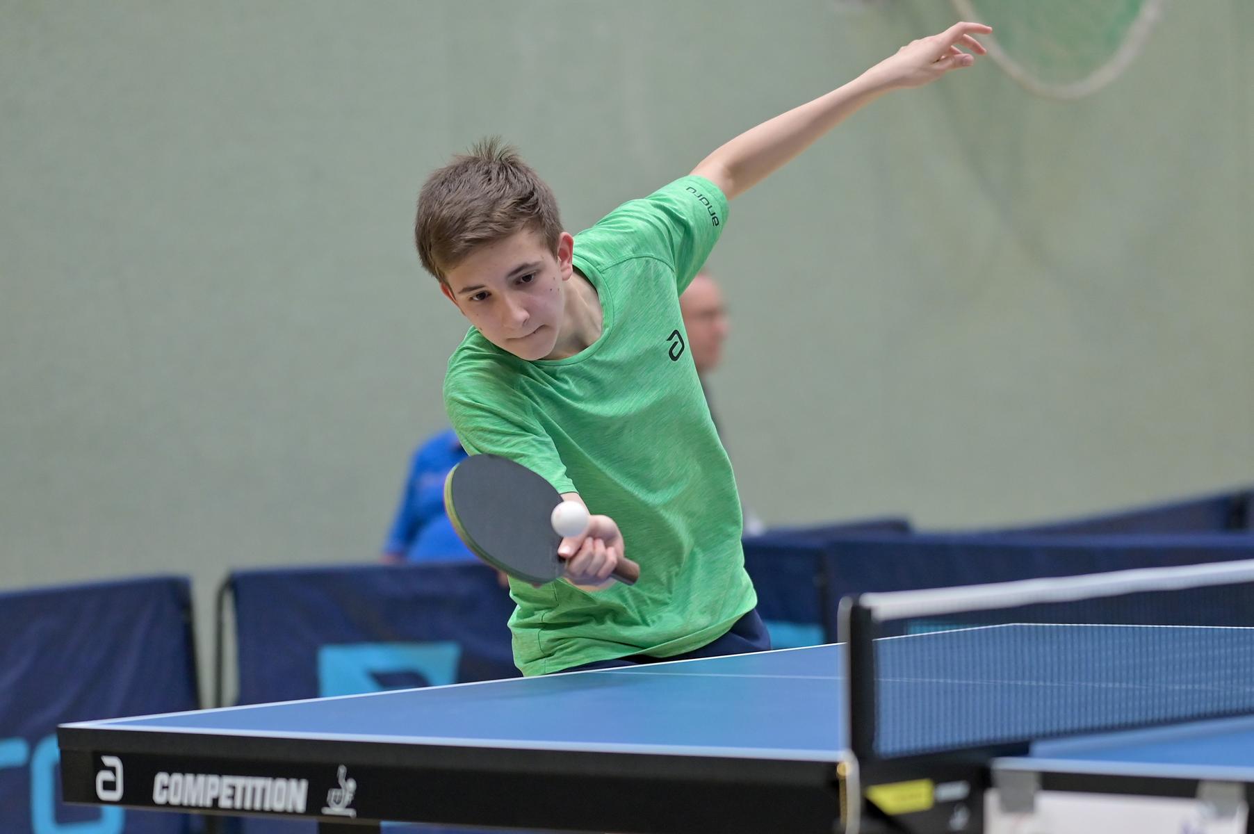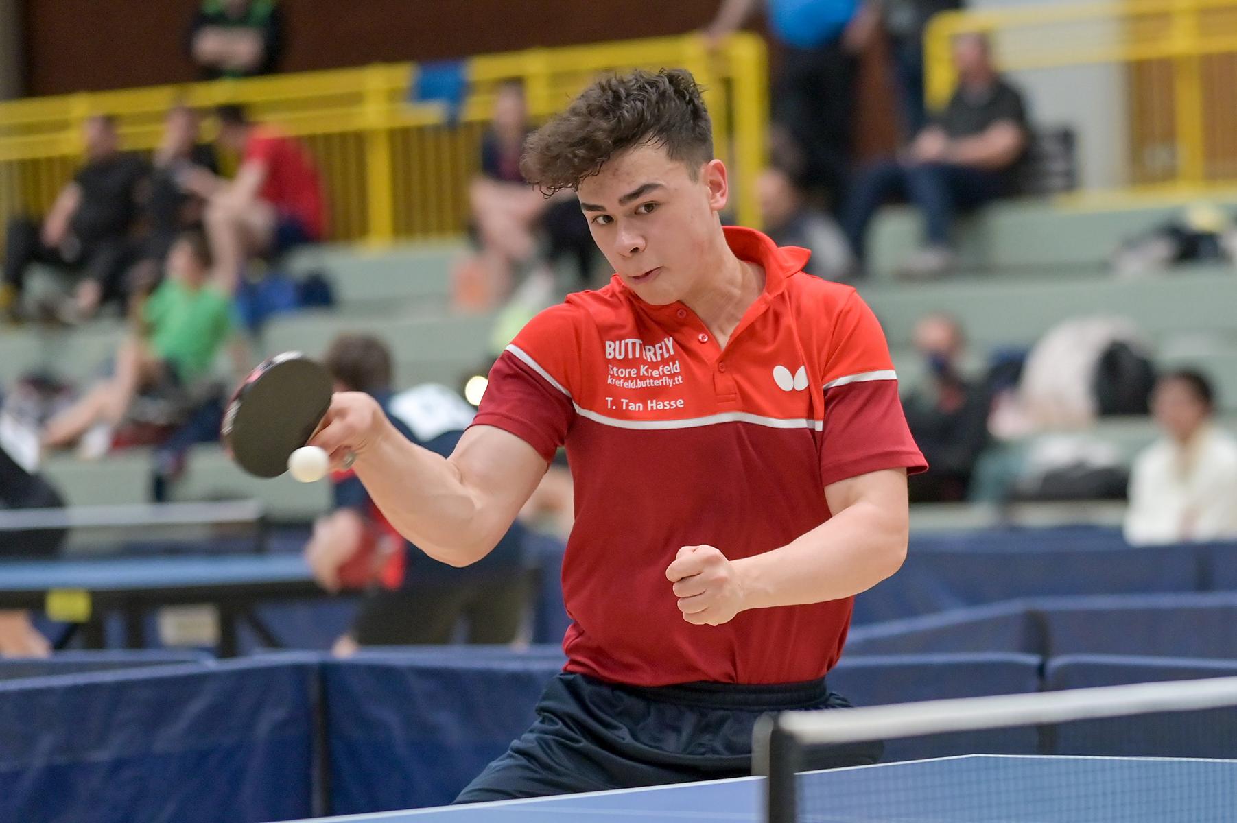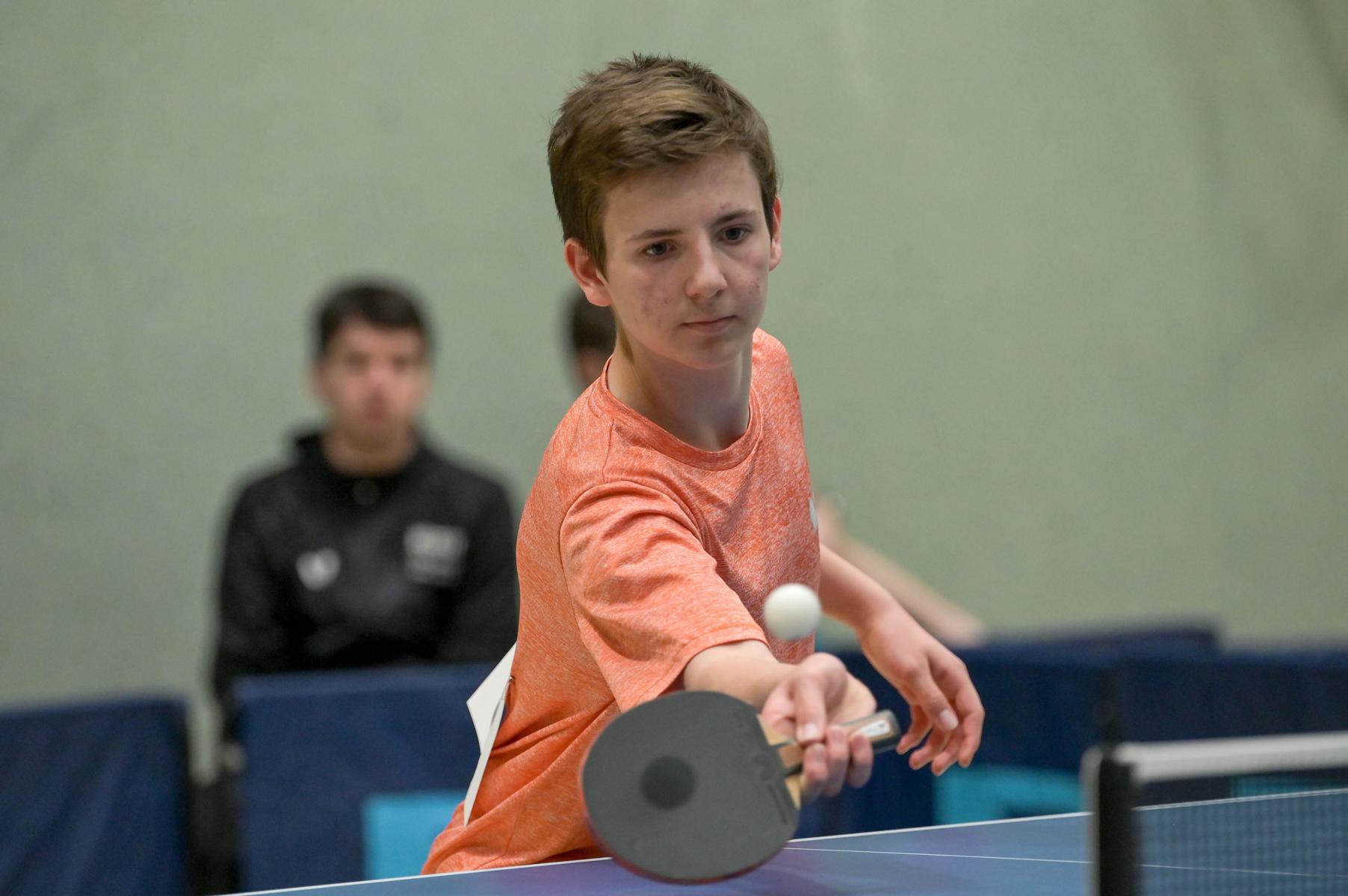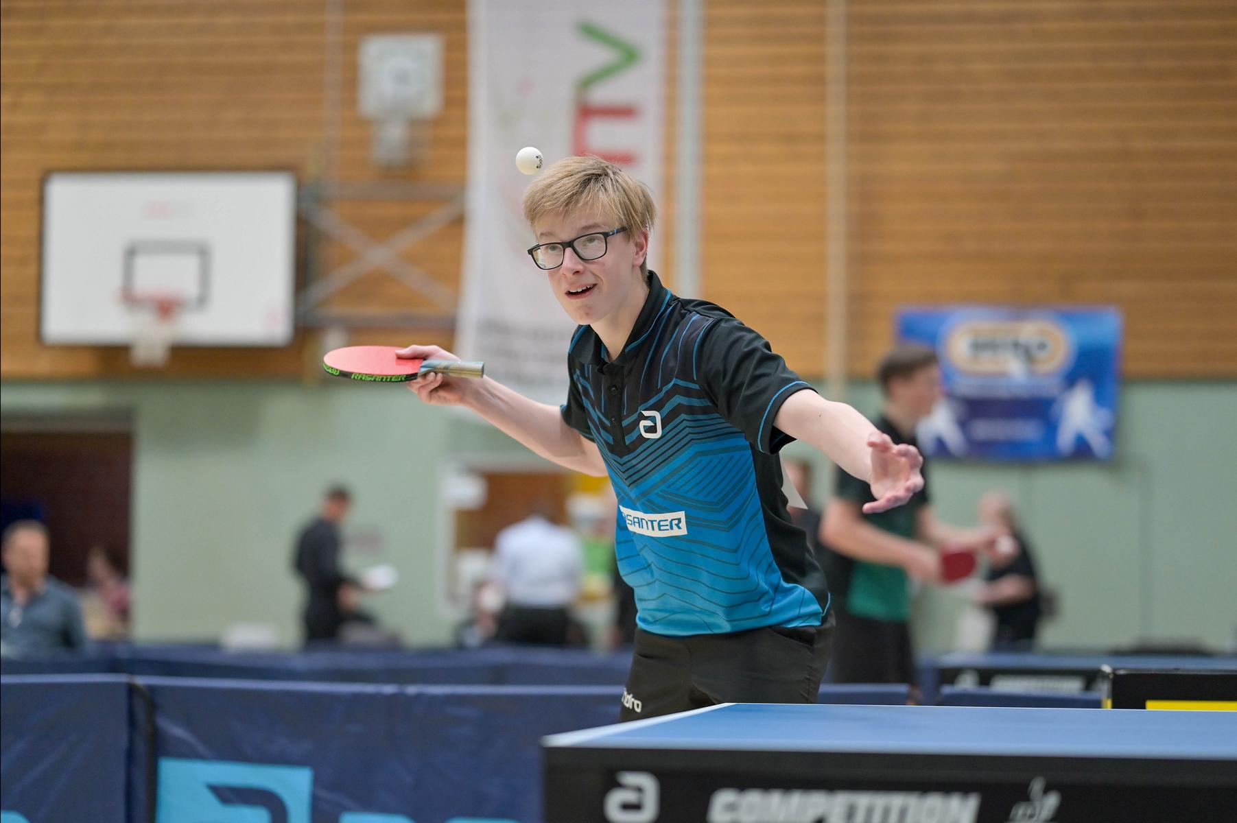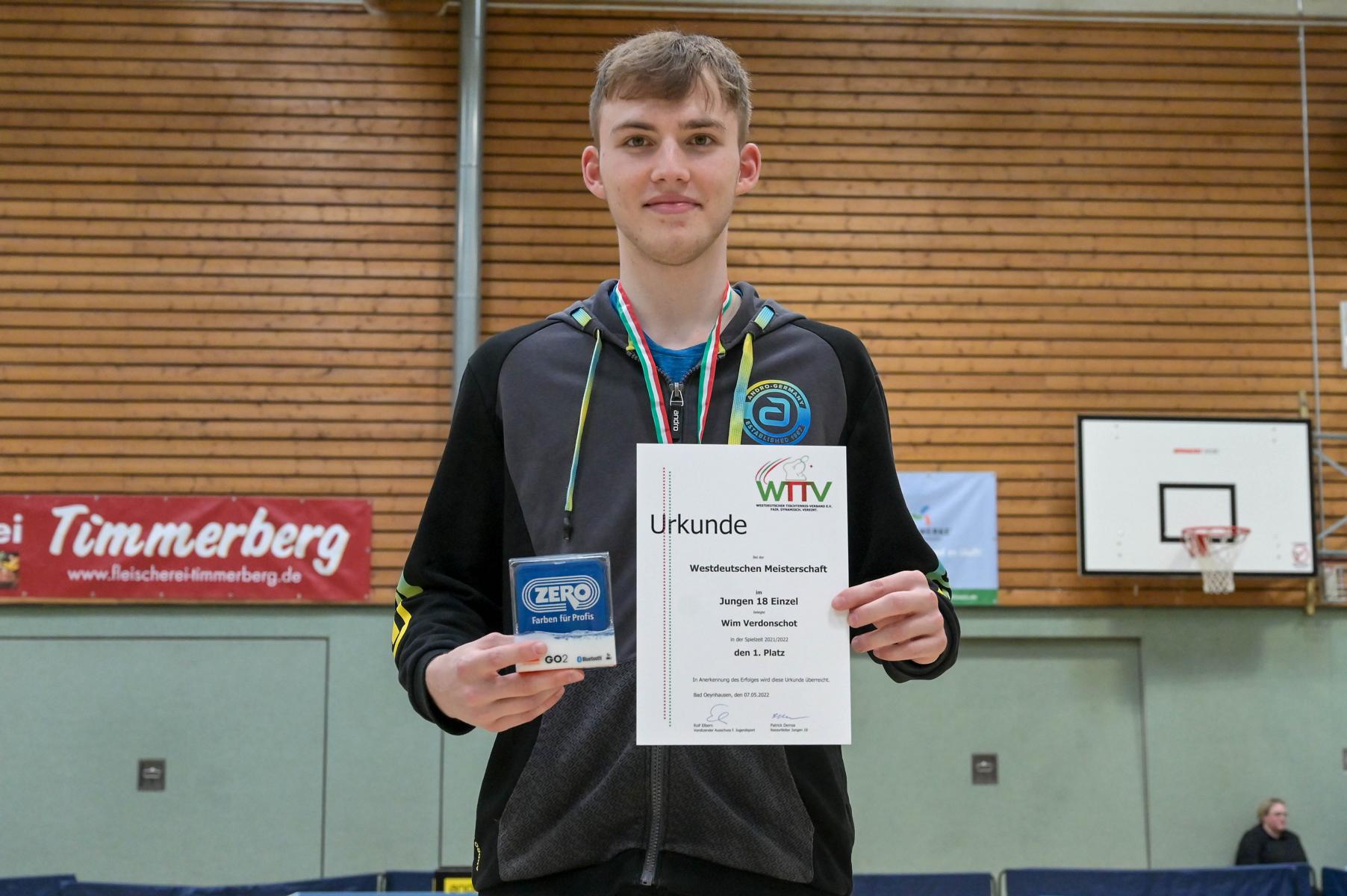 Los ging es am Samstag mit den älteren Athleten, der U18-Konkurrenz. Bei den Jungen setzte sich mit Wim Verdonschot (Borussia Dortmund), der im gesamten Turnier lediglich drei Sätze abgeben musste; verdient der topgesetzte Spieler durch. Sehr erfreulich war hier das Abschneiden der beiden U15-Spieler Friedrich Kühn von Burgsdorff (Post SV Gütersloh) und Noah Hersel (1. FC Köln), die sich beide erst dem späteren Sieger mit 3:0 bzw. 3:1 geschlagen geben mussten. Noah schaffte es im Finale sogar, Wim fast in den Entscheidungssatz zu zwingen, verlor den vierten Satz aber nach hartem Kampf mit 10:12. Platz drei sicherte sich neben Friedrich, Chris Andersen 8DJK Germania Lenkerbeck), der im Halbfinale Noah mit 1:3 unterlegen war.