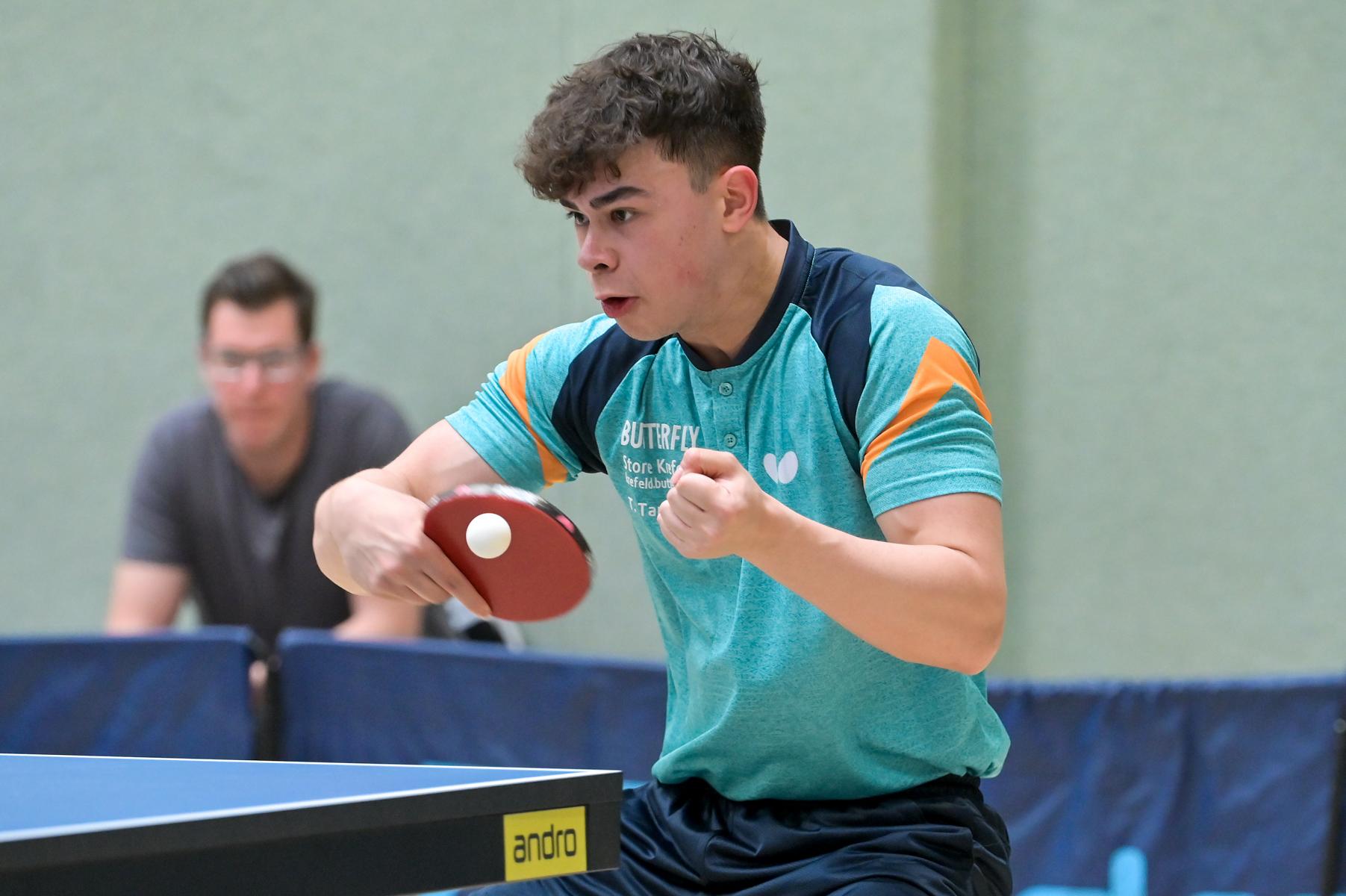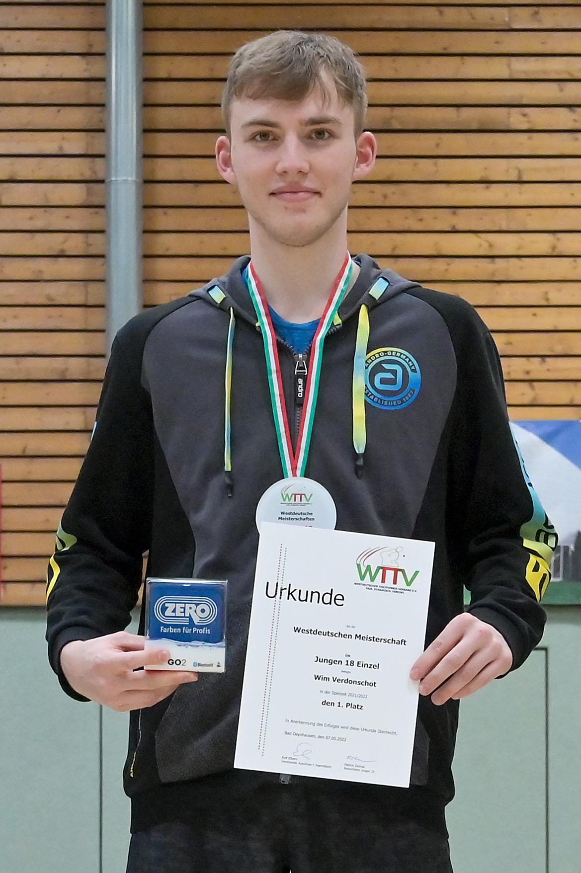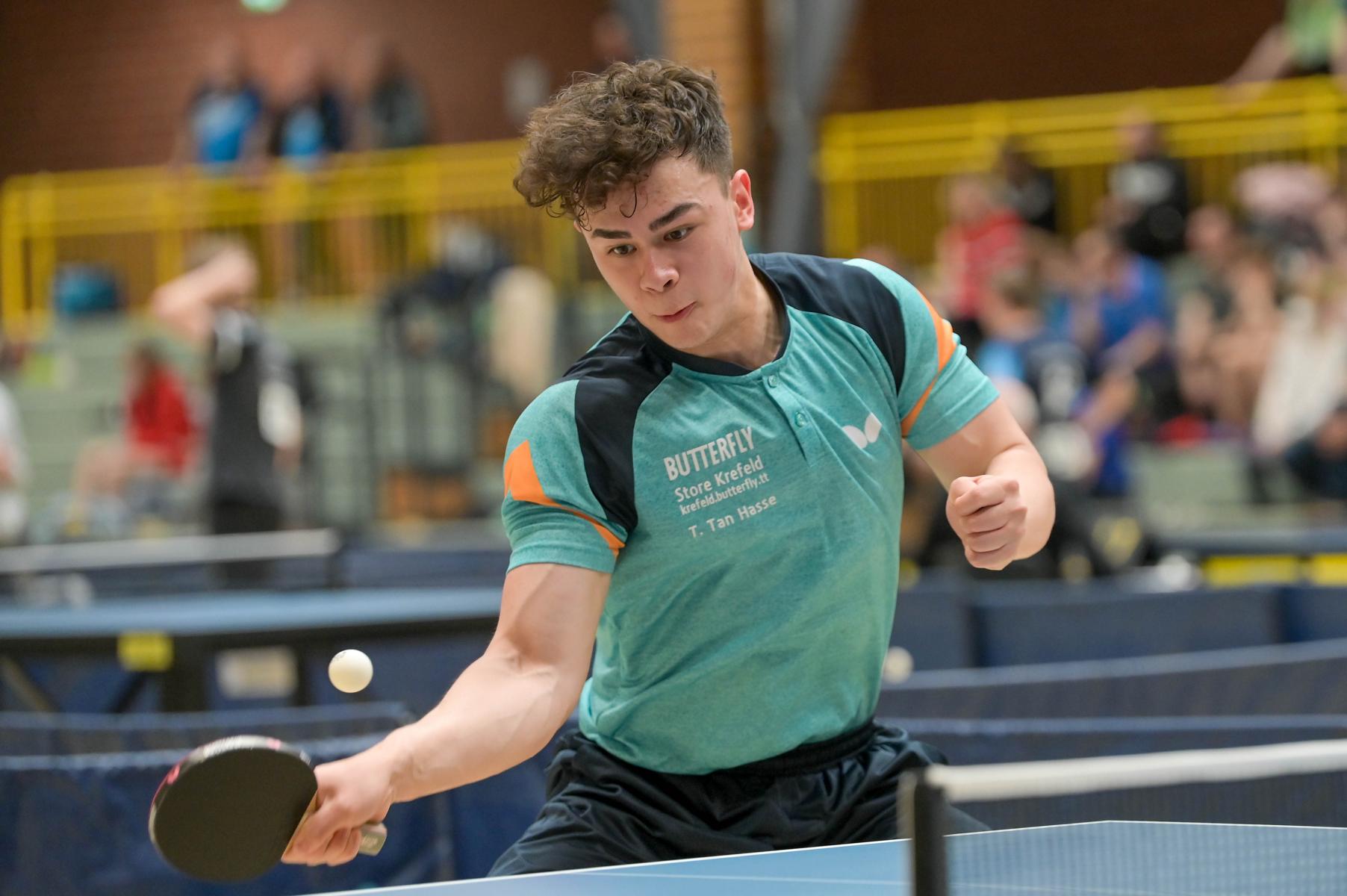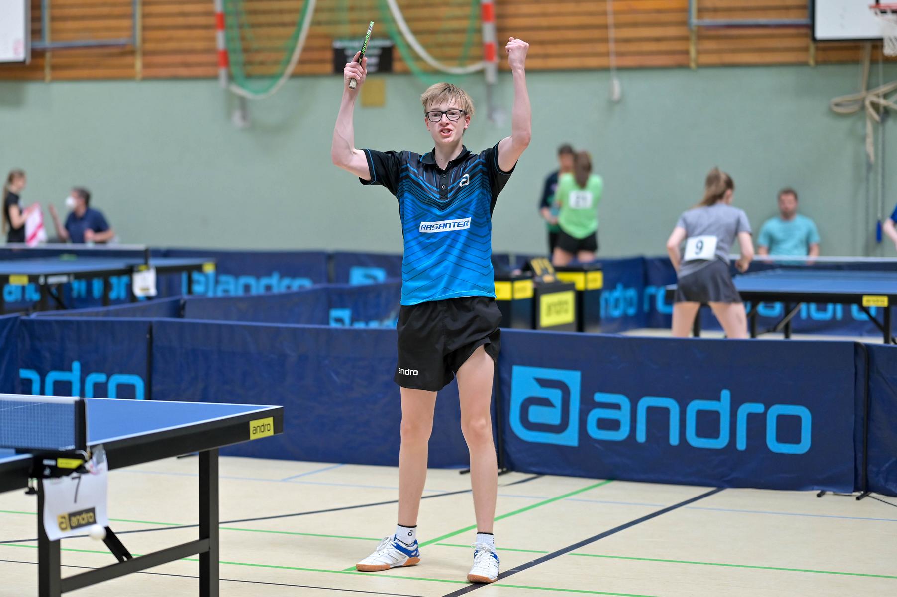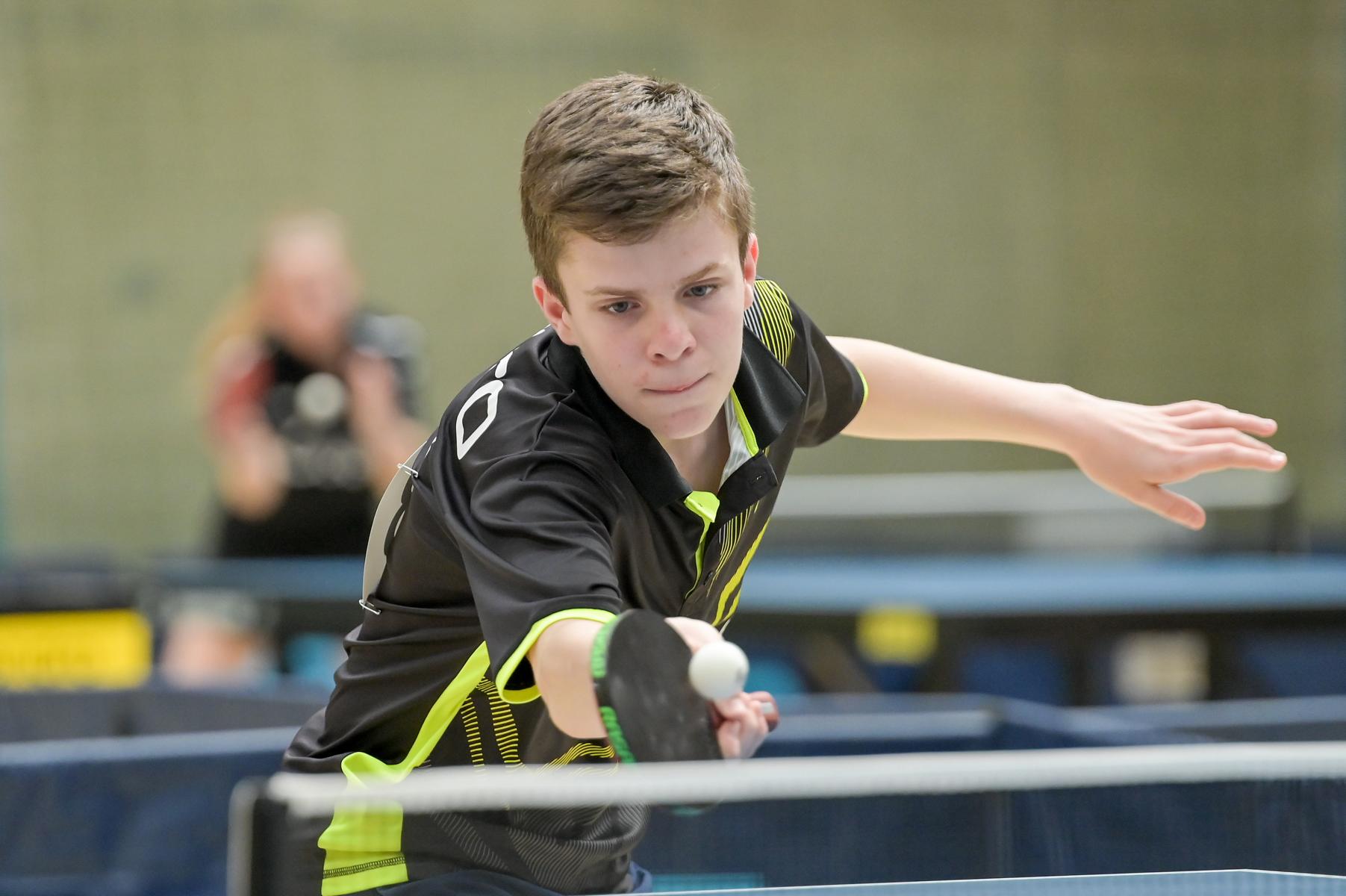 Los ging es am Samstag mit den älteren Athleten, der U18-Konkurrenz. Bei den Jungen setzte sich mit Wim Verdonschot (Borussia Dortmund), der im gesamten Turnier lediglich drei Sätze abgeben musste; verdient der topgesetzte Spieler durch. Sehr erfreulich war hier das Abschneiden der beiden U15-Spieler Friedrich Kühn von Burgsdorff (Post SV Gütersloh) und Noah Hersel (1. FC Köln), die sich beide erst dem späteren Sieger mit 3:0 bzw. 3:1 geschlagen geben mussten. Noah schaffte es im Finale sogar, Wim fast in den Entscheidungssatz zu zwingen, verlor den vierten Satz aber nach hartem Kampf mit 10:12. Platz drei sicherte sich neben Friedrich, Chris Andersen 8DJK Germania Lenkerbeck), der im Halbfinale Noah mit 1:3 unterlegen war.
