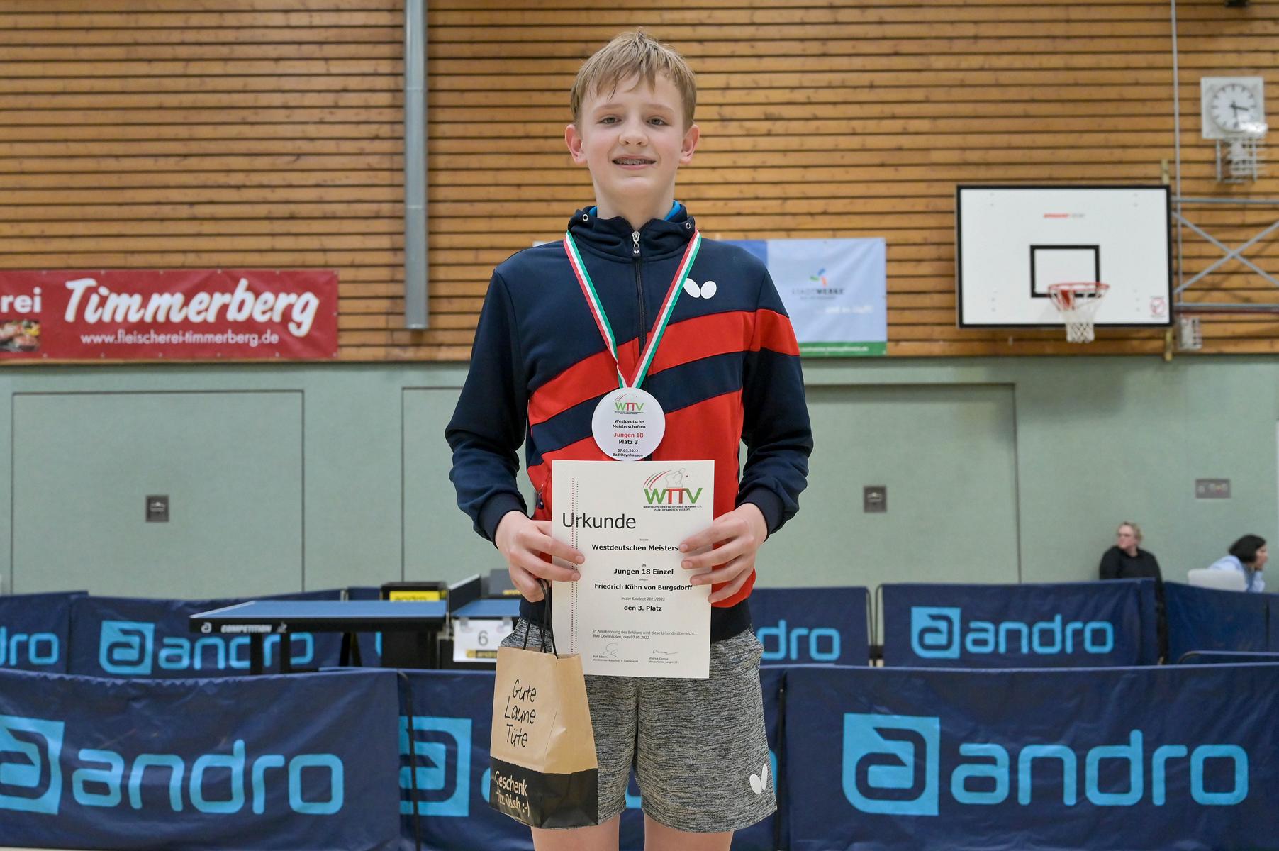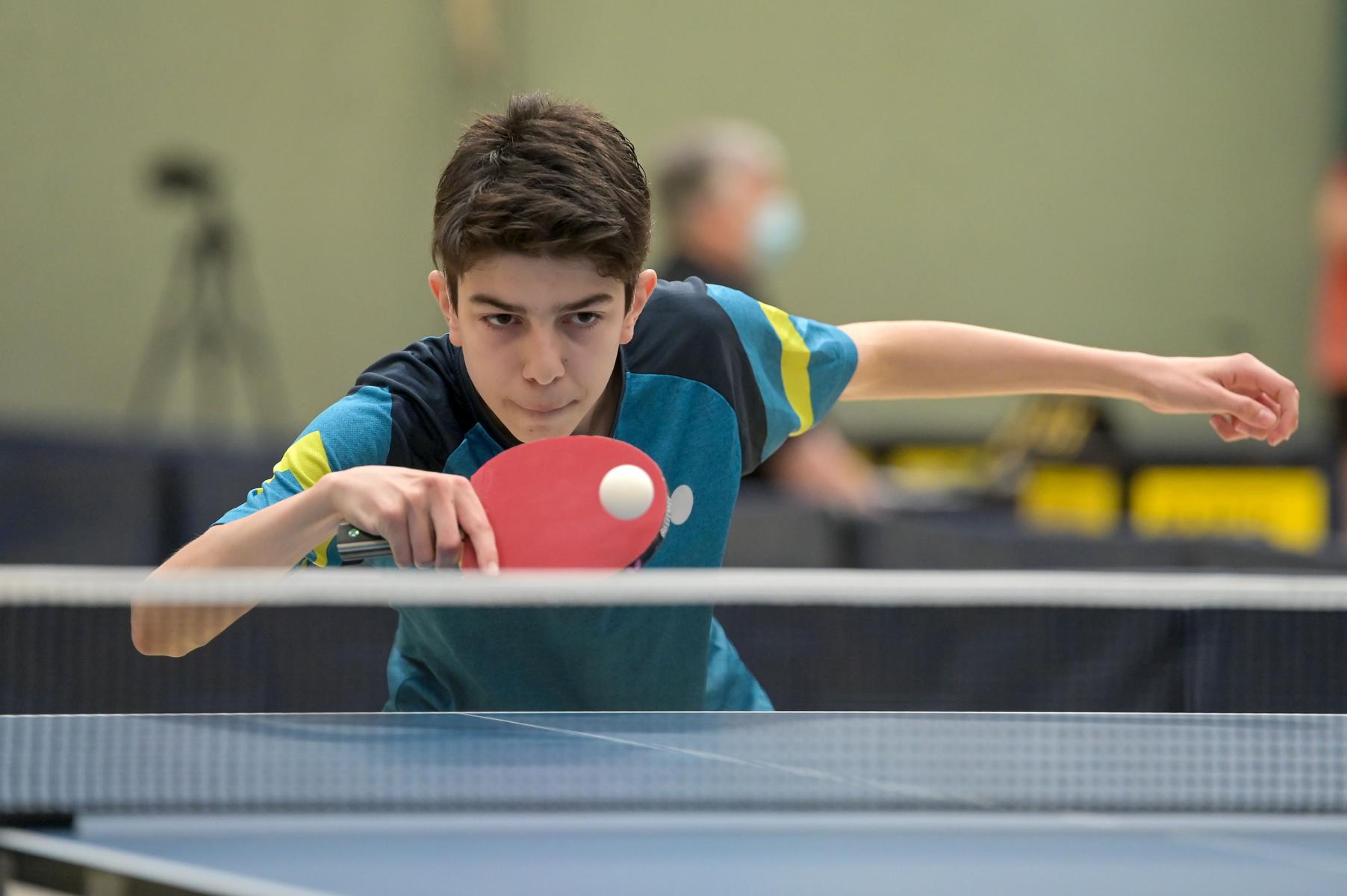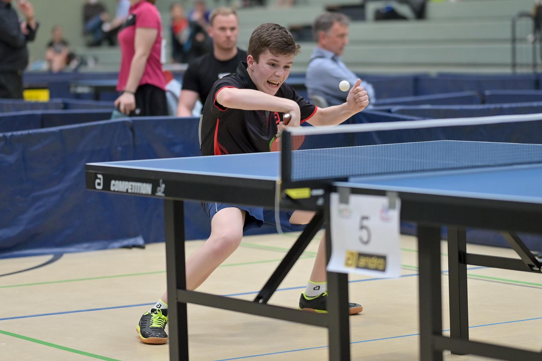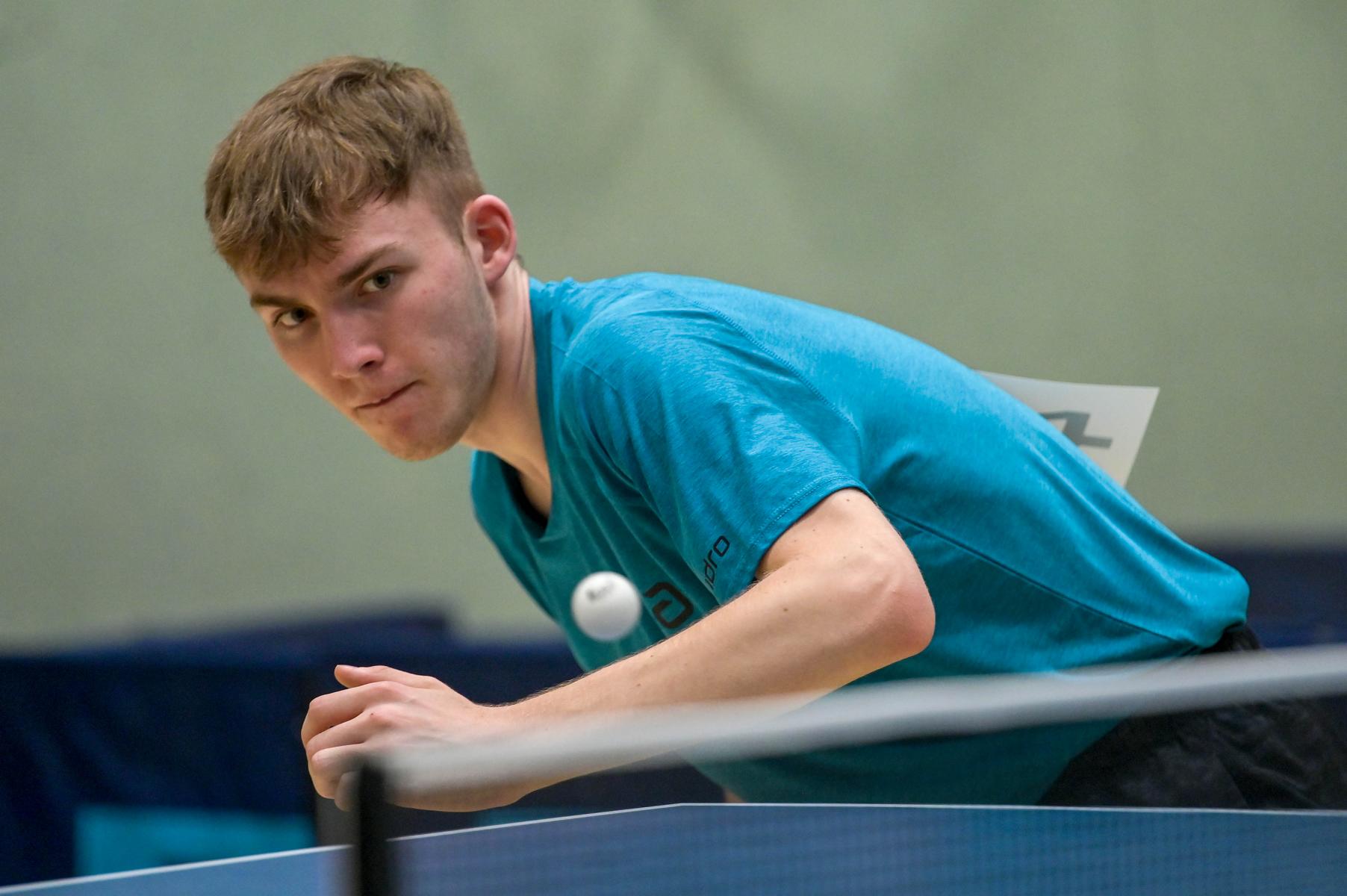Los ging es am Samstag mit den älteren Athleten, der U18-Konkurrenz. Bei den Jungen setzte sich mit Wim Verdonschot (Borussia Dortmund), der im gesamten Turnier lediglich drei Sätze abgeben musste; verdient der topgesetzte Spieler durch. Sehr erfreulich war hier das Abschneiden der beiden U15-Spieler Friedrich Kühn von Burgsdorff (Post SV Gütersloh) und Noah Hersel (1. FC Köln), die sich beide erst dem späteren Sieger mit 3:0 bzw. 3:1 geschlagen geben mussten. Noah schaffte es im Finale sogar, Wim fast in den Entscheidungssatz zu zwingen, verlor den vierten Satz aber nach hartem Kampf mit 10:12. Platz drei sicherte sich neben Friedrich, Chris Andersen 8DJK Germania Lenkerbeck), der im Halbfinale Noah mit 1:3 unterlegen war.