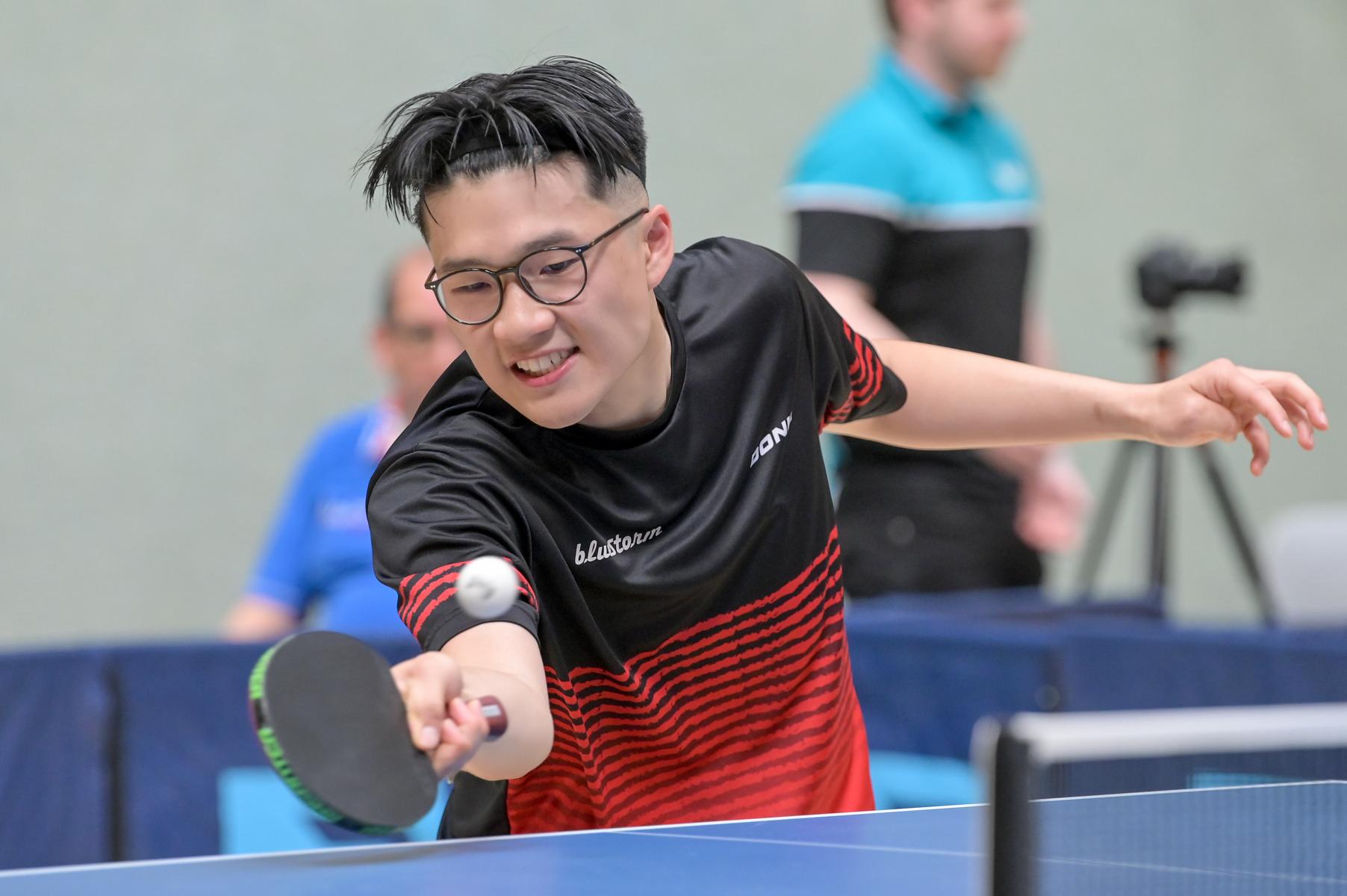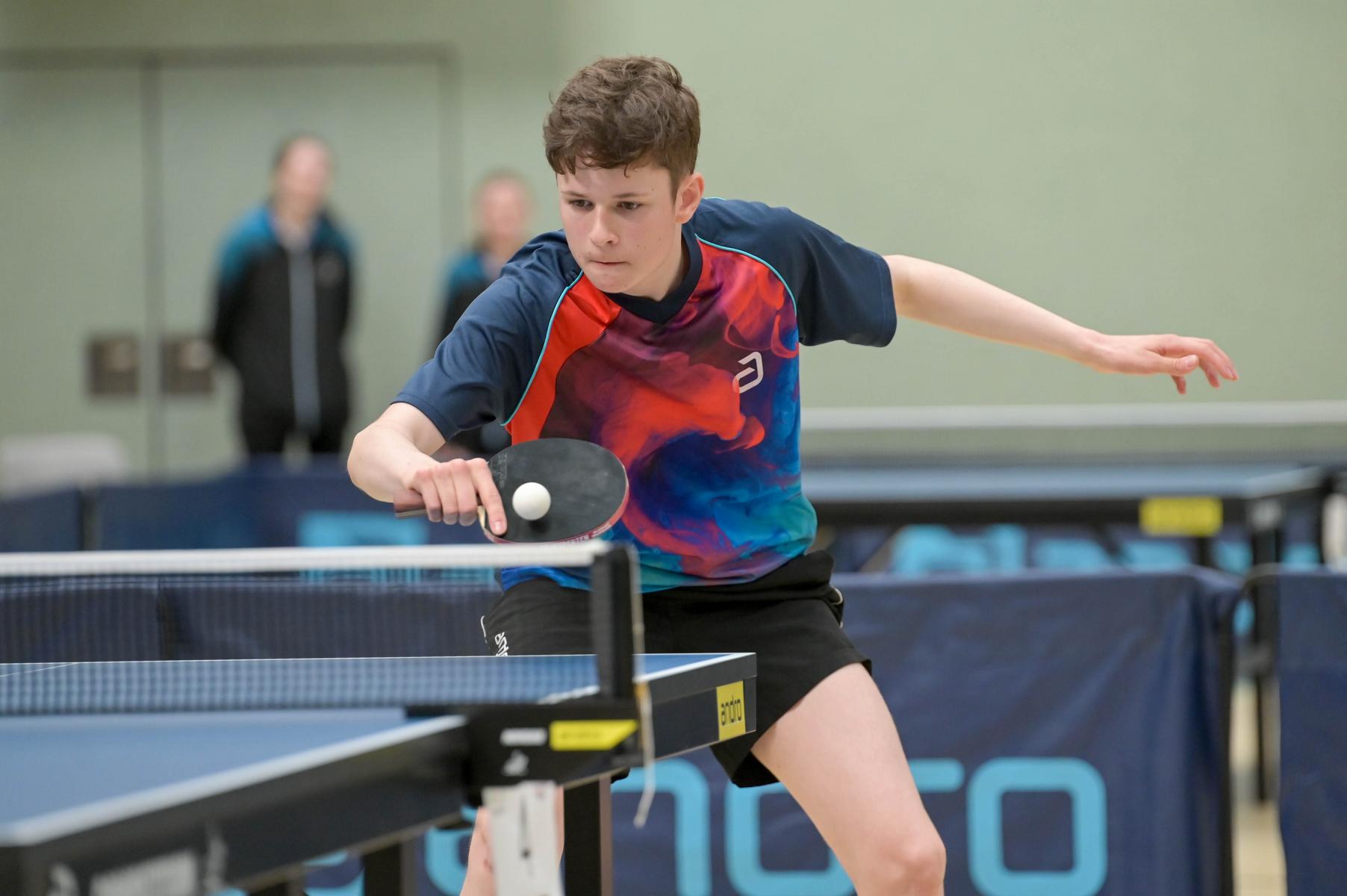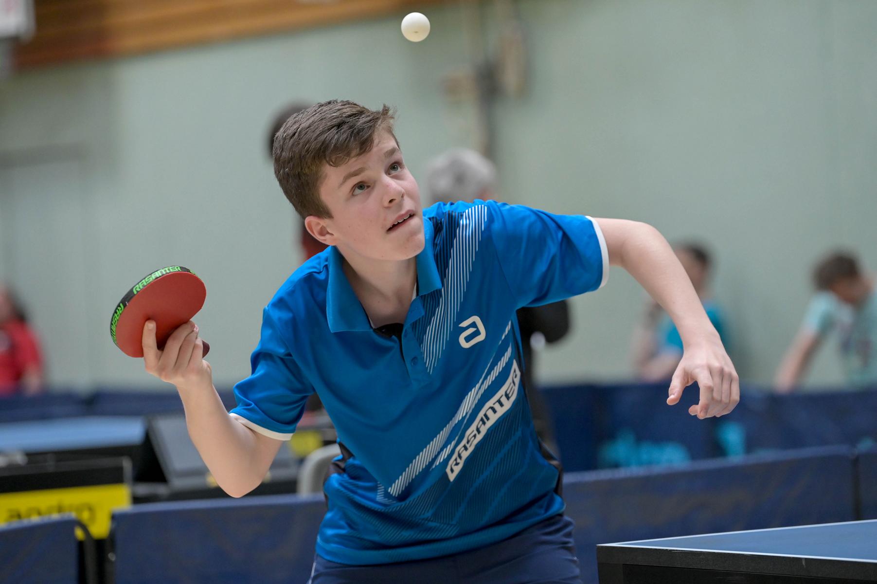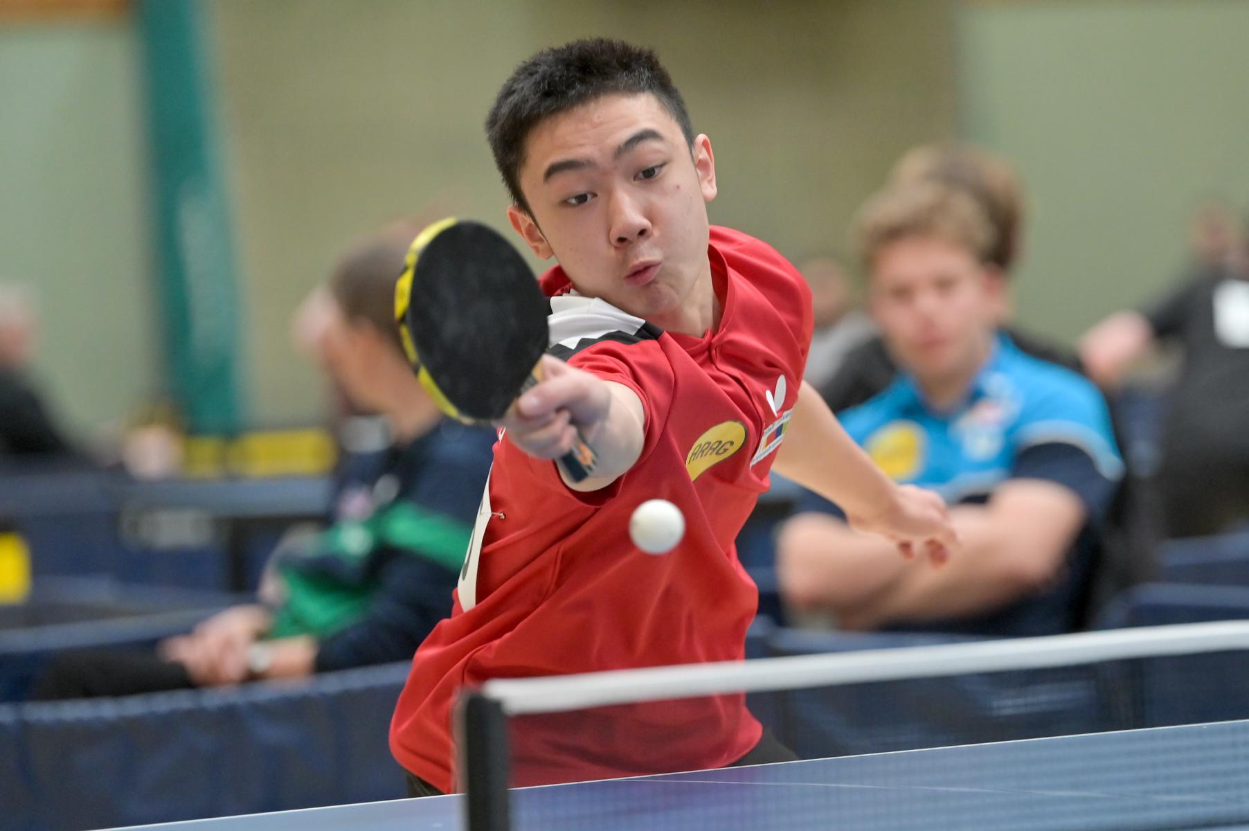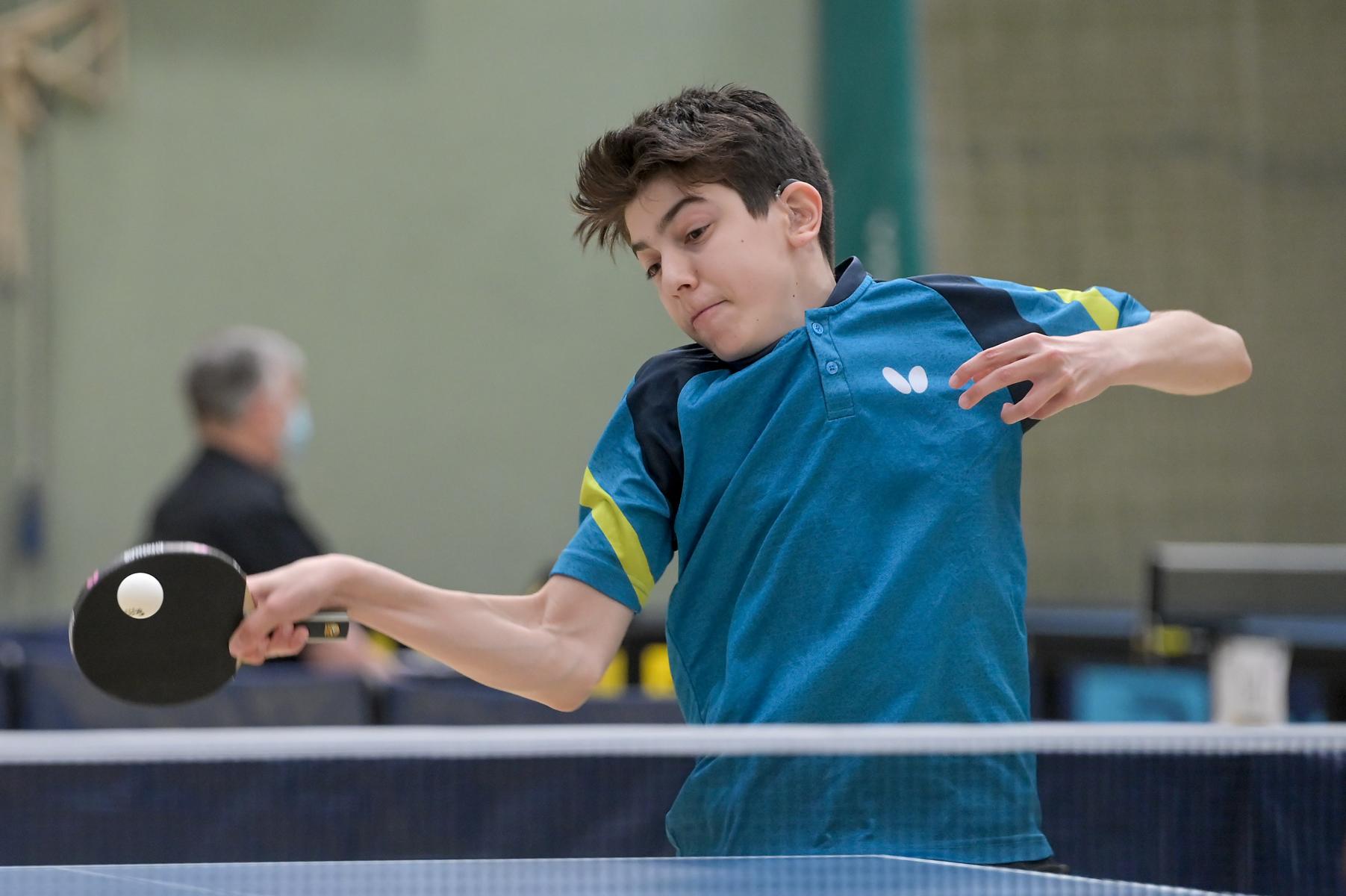 Los ging es am Samstag mit den älteren Athleten, der U18-Konkurrenz. Bei den Jungen setzte sich mit Wim Verdonschot (Borussia Dortmund), der im gesamten Turnier lediglich drei Sätze abgeben musste; verdient der topgesetzte Spieler durch. Sehr erfreulich war hier das Abschneiden der beiden U15-Spieler Friedrich Kühn von Burgsdorff (Post SV Gütersloh) und Noah Hersel (1. FC Köln), die sich beide erst dem späteren Sieger mit 3:0 bzw. 3:1 geschlagen geben mussten. Noah schaffte es im Finale sogar, Wim fast in den Entscheidungssatz zu zwingen, verlor den vierten Satz aber nach hartem Kampf mit 10:12. Platz drei sicherte sich neben Friedrich, Chris Andersen 8DJK Germania Lenkerbeck), der im Halbfinale Noah mit 1:3 unterlegen war.