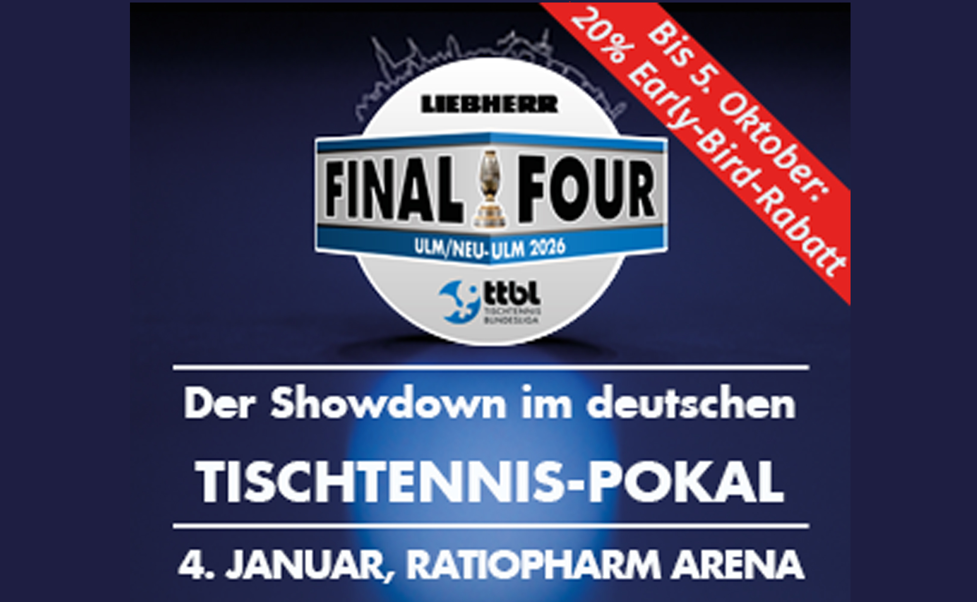 Liebherr Pokal-Final Four 2026 terminiert | Ticket-Vorverkauf startet mit Early-Bird-Aktion. Direkt zum Jahresstart 2026 dürfen sich alle Tischtennis-Fans auf ein Highlight freuen: Am 4. Januar 2026 entscheidet sich im Liebherr Pokal-Final Four, welches Team den ersten Titel der Saison erringt.