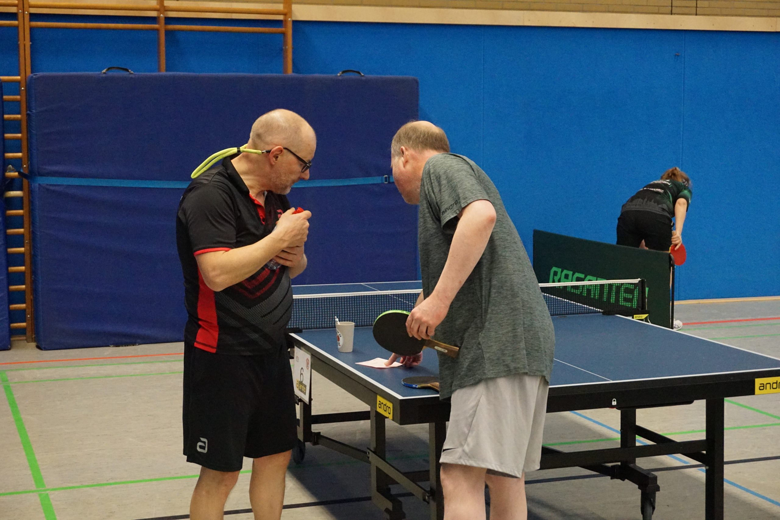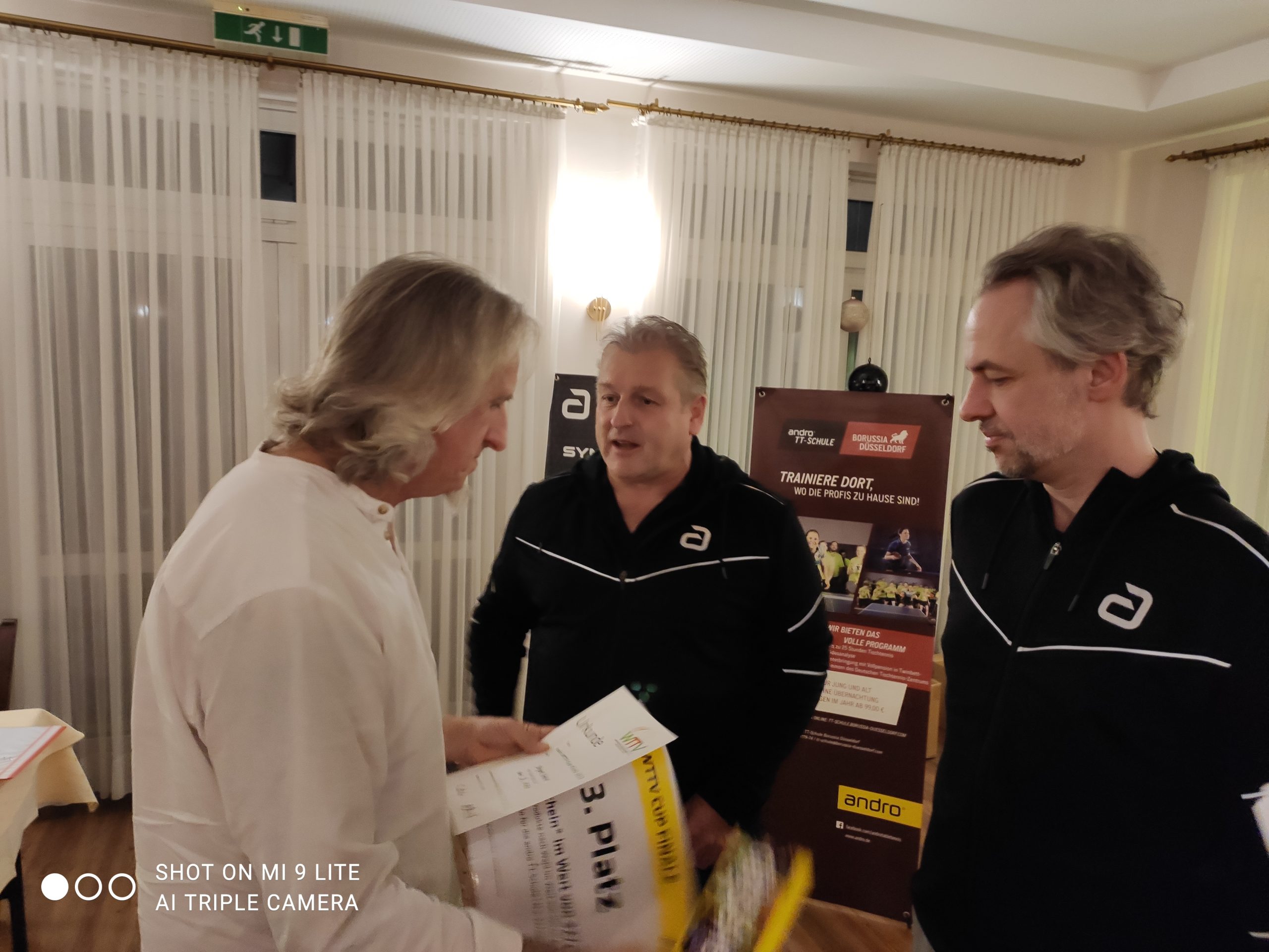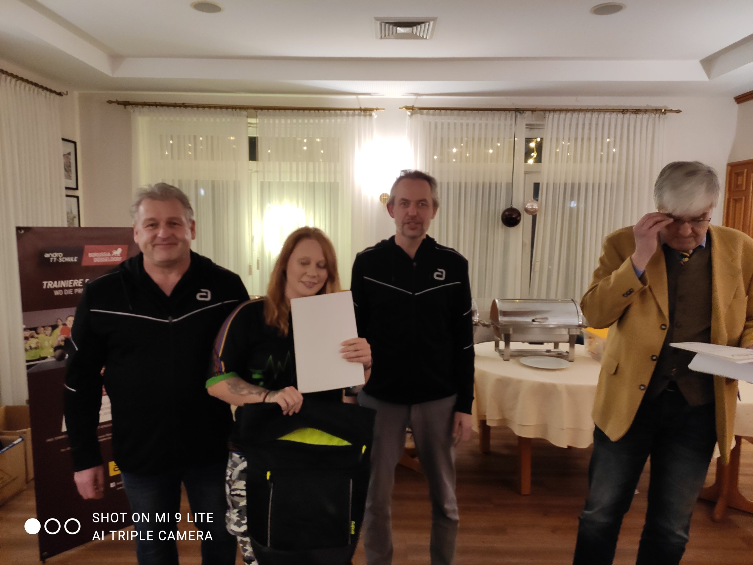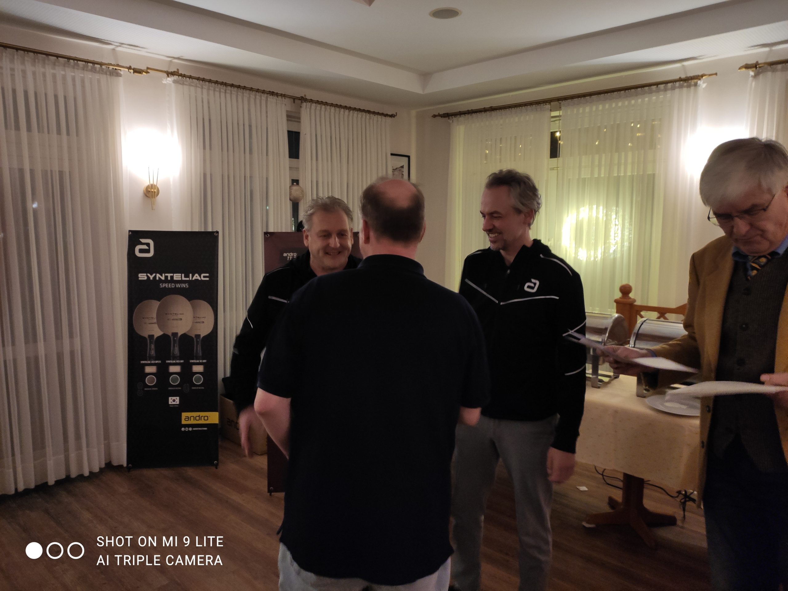 Doch der Reihe nach: Nach der Begrüßung durch Jens Korte vom gastgebenden TTV Waltrop konnte Spielleiter Reinhardt Hantke bereits die ersten Spiel-Begegnungen aufrufen. Drei Stunden mit Engagement und viel Schweiß lagen hinter den Teilnehmenden, als Sieger und Platzierte zur Siegerehrung im Hotel am Park eilten. Hier warteten Rainer Schmidt und David Daus mit Anerkennung und stattlichen Peisen auf die Akteure, die unter dem Beifall der Spieler/innen zur Ausreichung kamen.