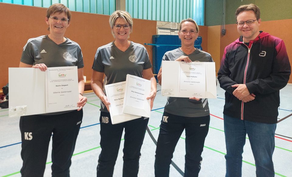 Für ihre 30-jährige aktive Spielertätigkeit erhielten Nina Beckerjürgen und Tanja Katluhn die Bronzene Spielernadel des WTTV, wobei Tanja Katluhn schont seit 39 Jahren und Nina Beckerjürgen schon seit 36 Jahren aktiv sind. Karin Siepert wurde sogar mit der Silbernen Spielernaedel für 42 Jahre aktive Spielertätigkeit geehrt.
