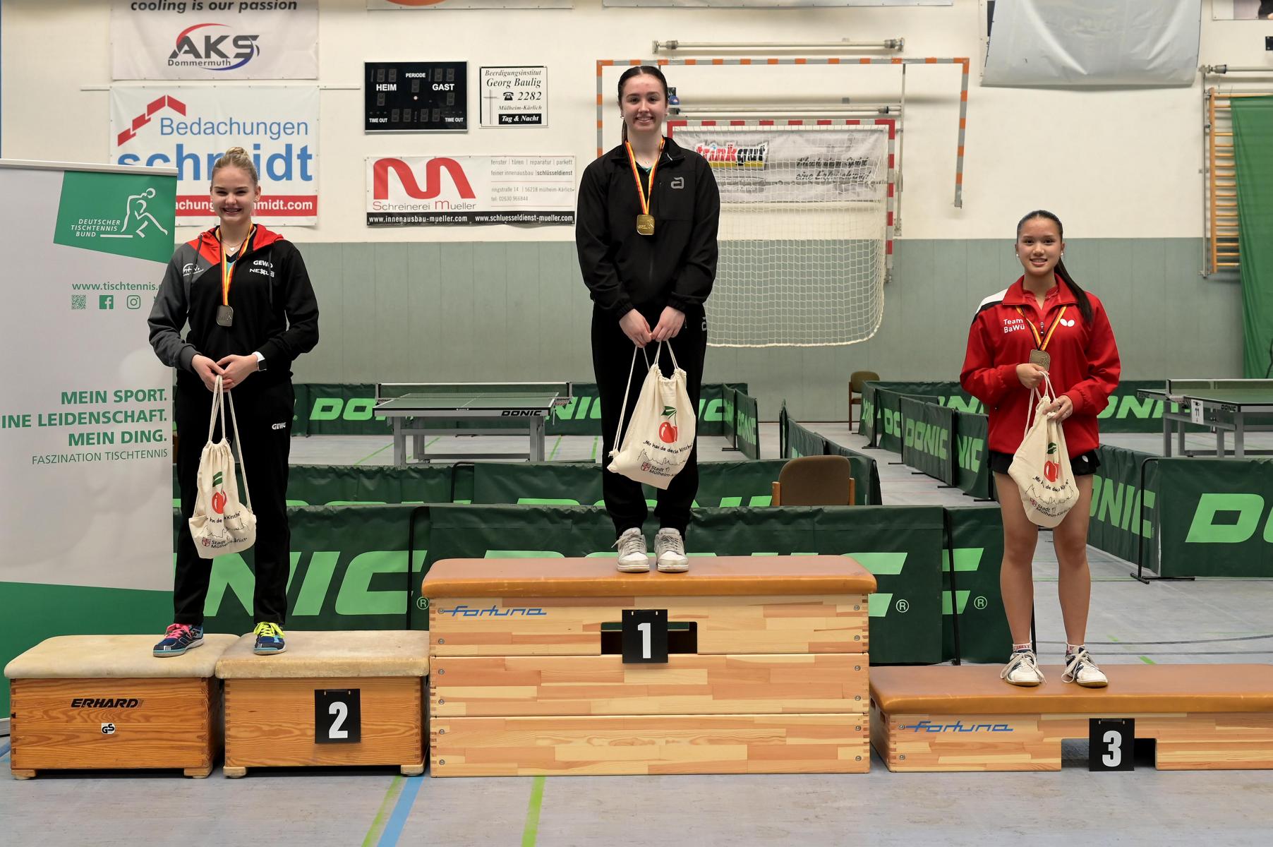 Auch in den folgenden Partien musste Eireen nochmals eine kritische Situation meistern, setzte sich aber erneut im Entscheidungssatz gegen Ledwoch (Bayern) durch. Als sie dann den Matchball im letzten Spiel gegen Faltermeier (Bayern) verwandelte, war die Erleichterung groß. Eireen bliebt in allen Partien ungeschlagen und gab lediglich fünf Sätze ab. Hut ab vor dieser beeindruckenden Leistung gegen die besten U19-Mädchen Deutschlands! Herzlichen Glückwunsch, Eireen!