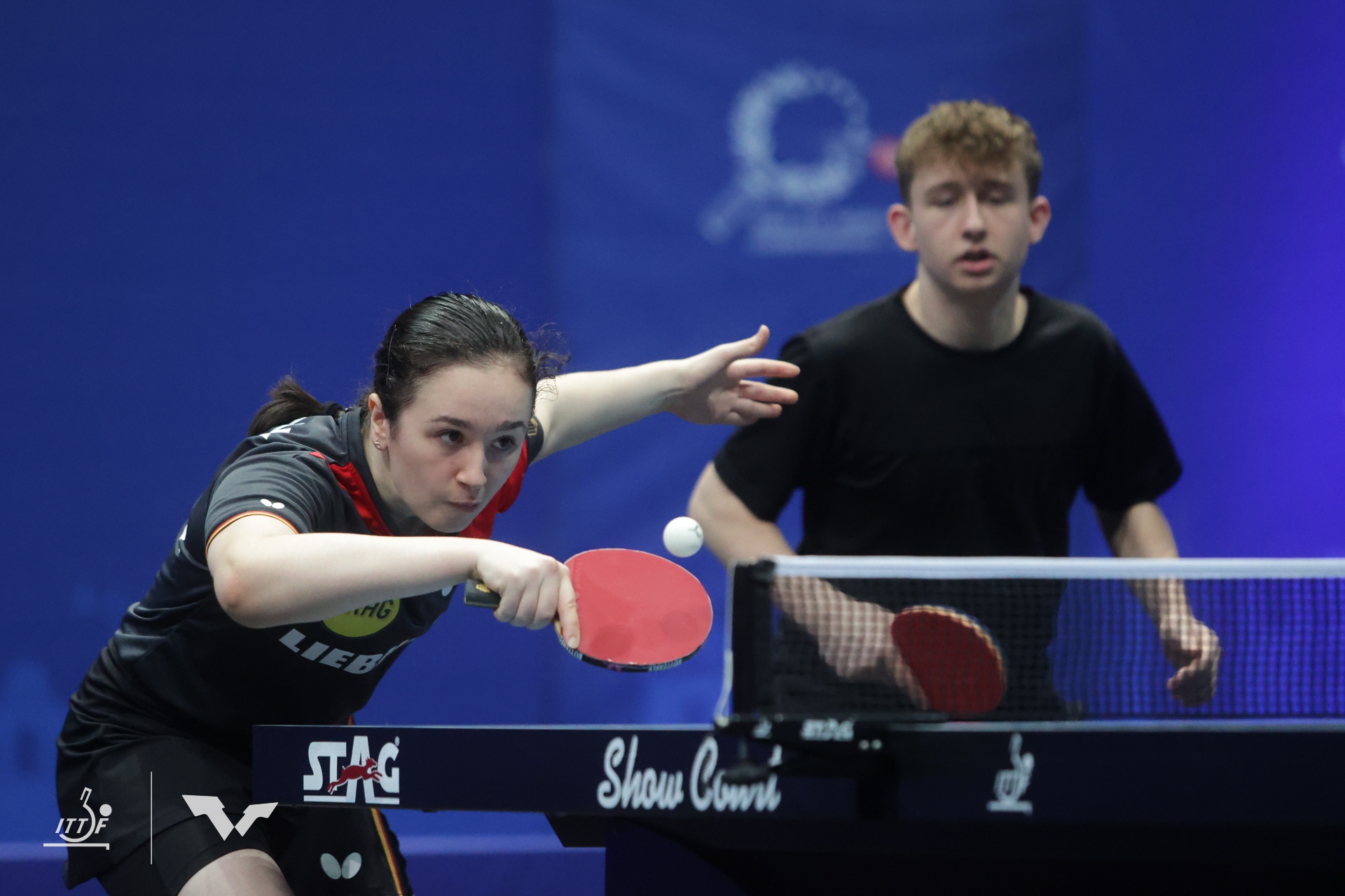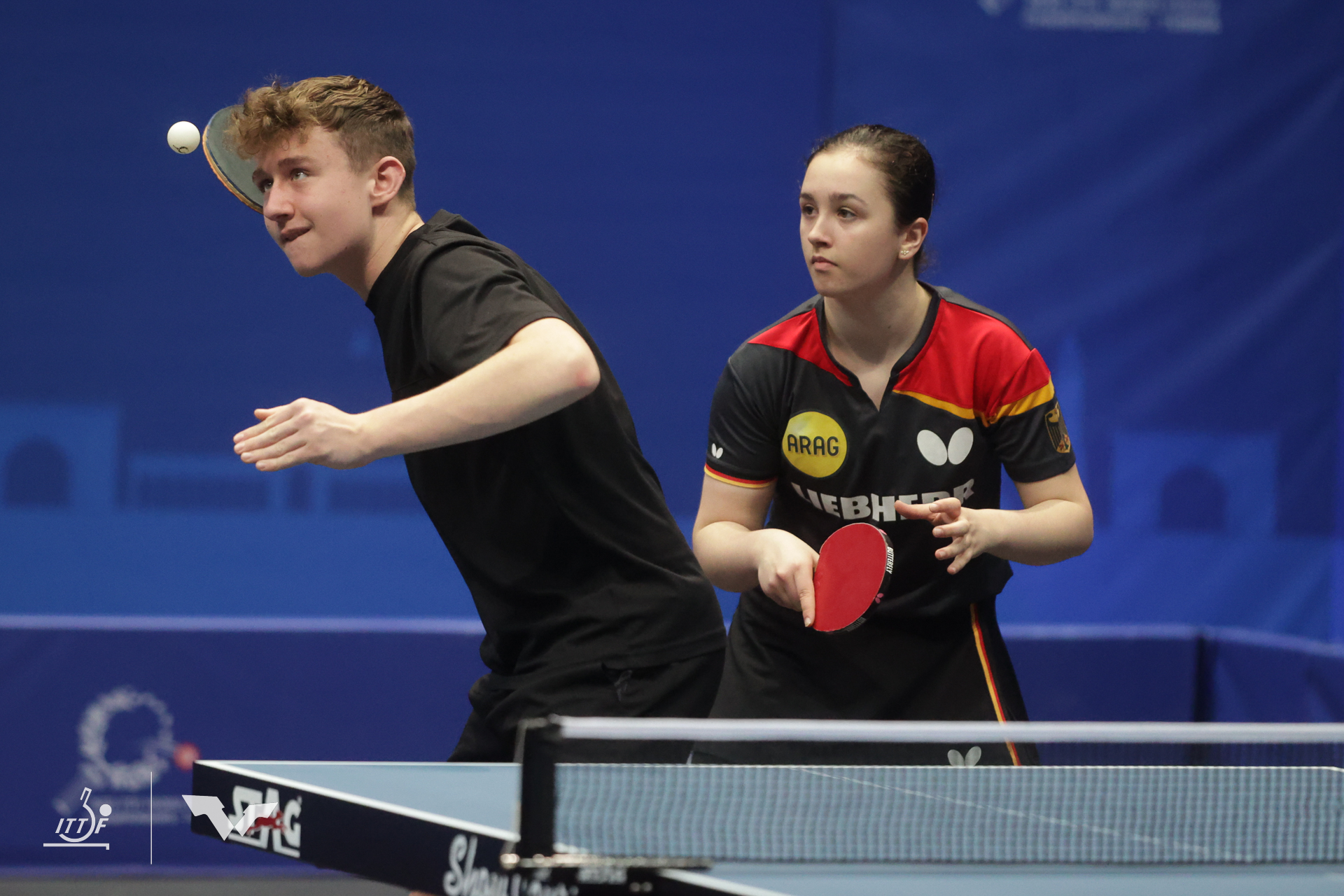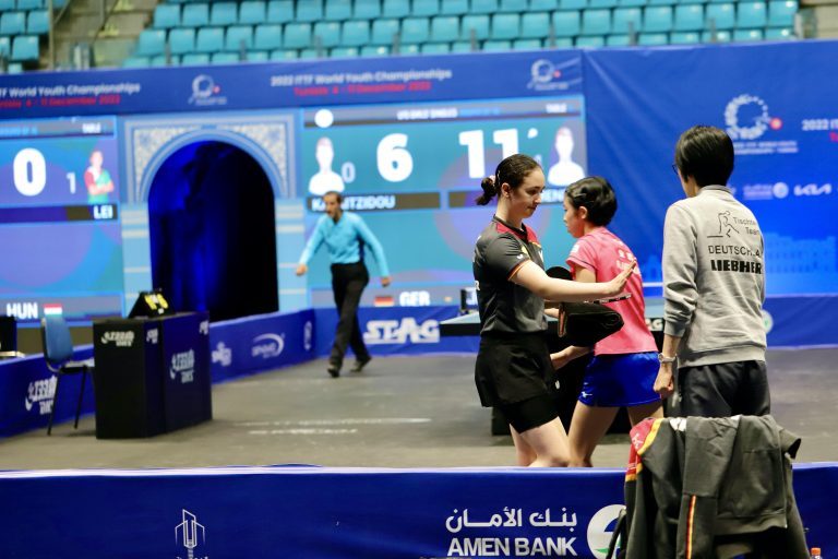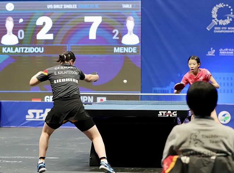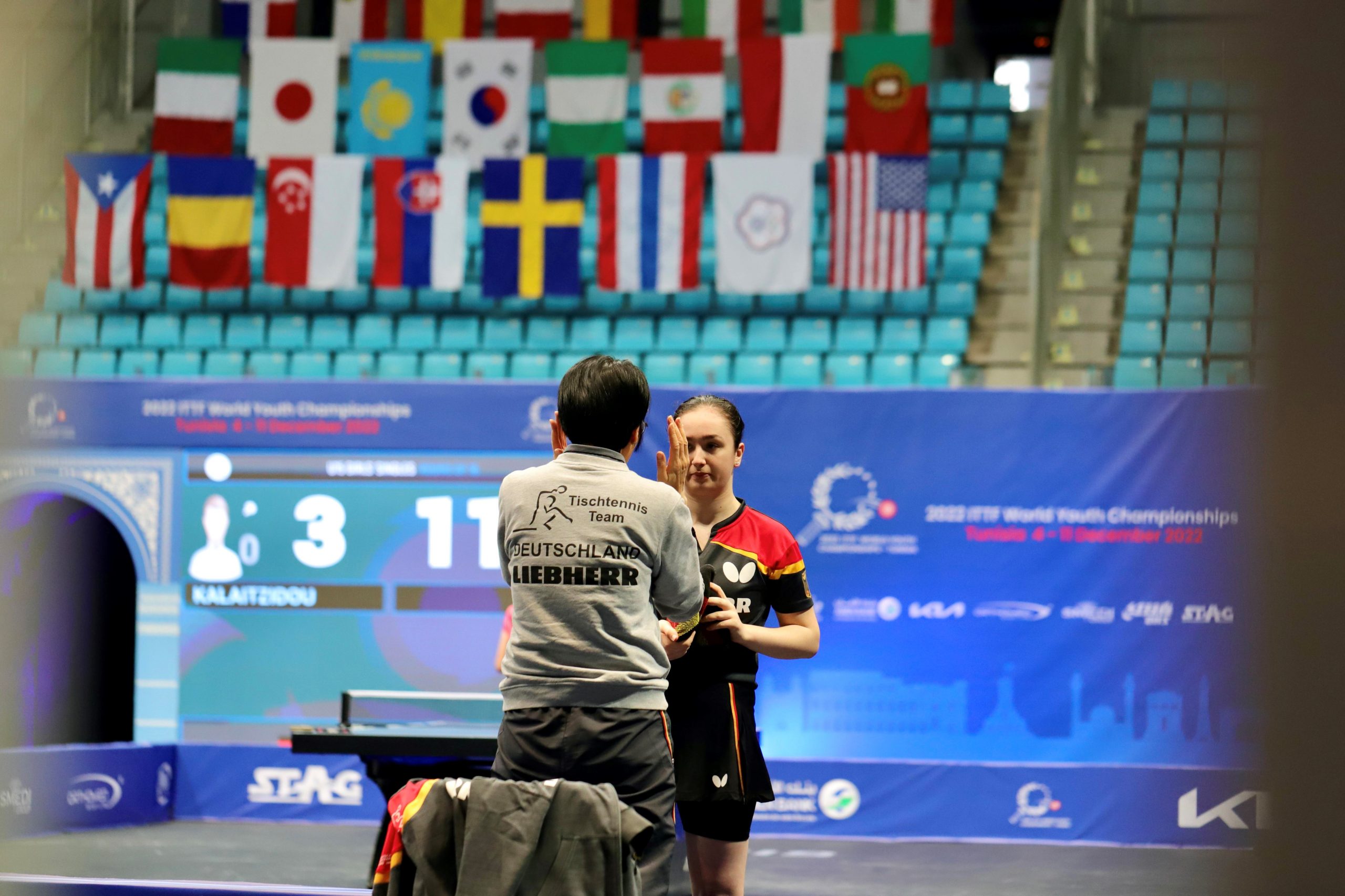 WM-Debütintin Eireen Kalaitzidou als erste des DTTB-Trios Edelmetall für den Deutschen Tischtennis-Bund in Tunis gewonnen. Mit einem 11:3, 11:6, 11:13 und 11:8-Viertelfinalerfolg setzte sich die Düsseldorferin zusammen mit ihrer rumänischen Partnerin Alesia Sferlea im U15-Doppel-Viertelfinale gegen die sehr unorthox zwischen aktivem Spiel und Defensive wechselnde ägyptisch-thailändische Kombination mit Habiba Elbasoumy und Materialspielerin Phatsaraphon Wonglakhon durch, die im Achtelfinale vollkommen überraschend die an Position eins gesetzte Medaillenanwärterin Hana Goda (Ägypten) und deren indische Partnerin Yashaswini Ghorpade aus dem Turnier geworfen hatte.