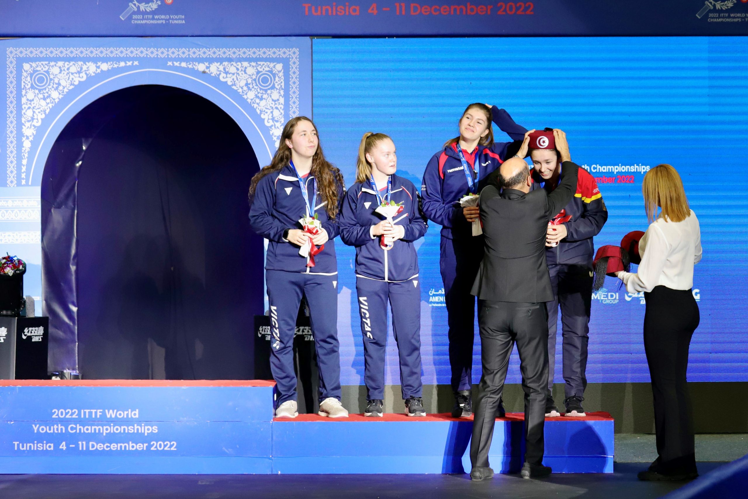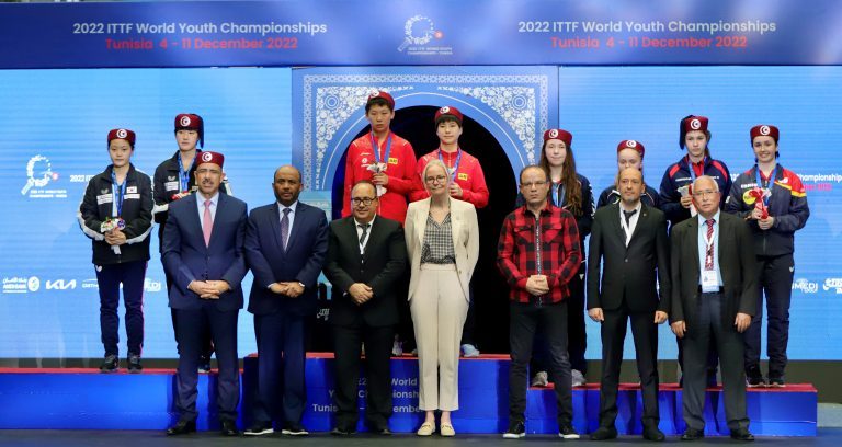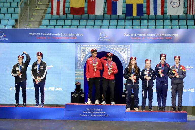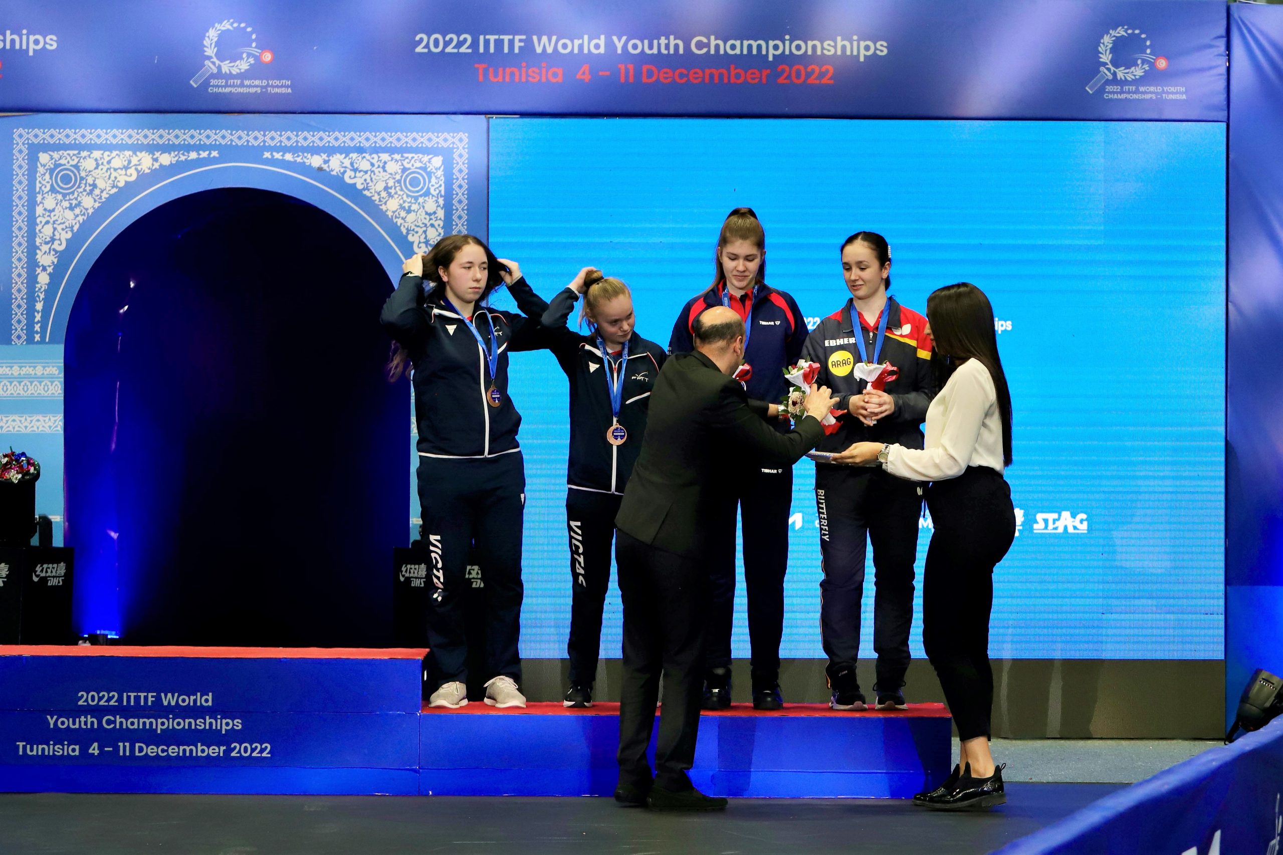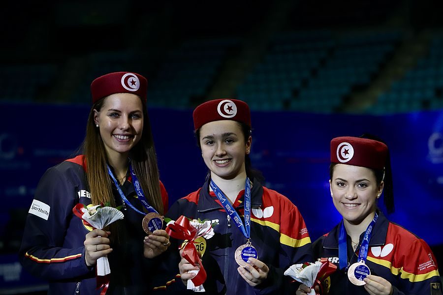 WM-Debütintin Eireen Kalaitzidou als erste des DTTB-Trios Edelmetall für den Deutschen Tischtennis-Bund in Tunis gewonnen. Mit einem 11:3, 11:6, 11:13 und 11:8-Viertelfinalerfolg setzte sich die Düsseldorferin zusammen mit ihrer rumänischen Partnerin Alesia Sferlea im U15-Doppel-Viertelfinale gegen die sehr unorthox zwischen aktivem Spiel und Defensive wechselnde ägyptisch-thailändische Kombination mit Habiba Elbasoumy und Materialspielerin Phatsaraphon Wonglakhon durch, die im Achtelfinale vollkommen überraschend die an Position eins gesetzte Medaillenanwärterin Hana Goda (Ägypten) und deren indische Partnerin Yashaswini Ghorpade aus dem Turnier geworfen hatte.
