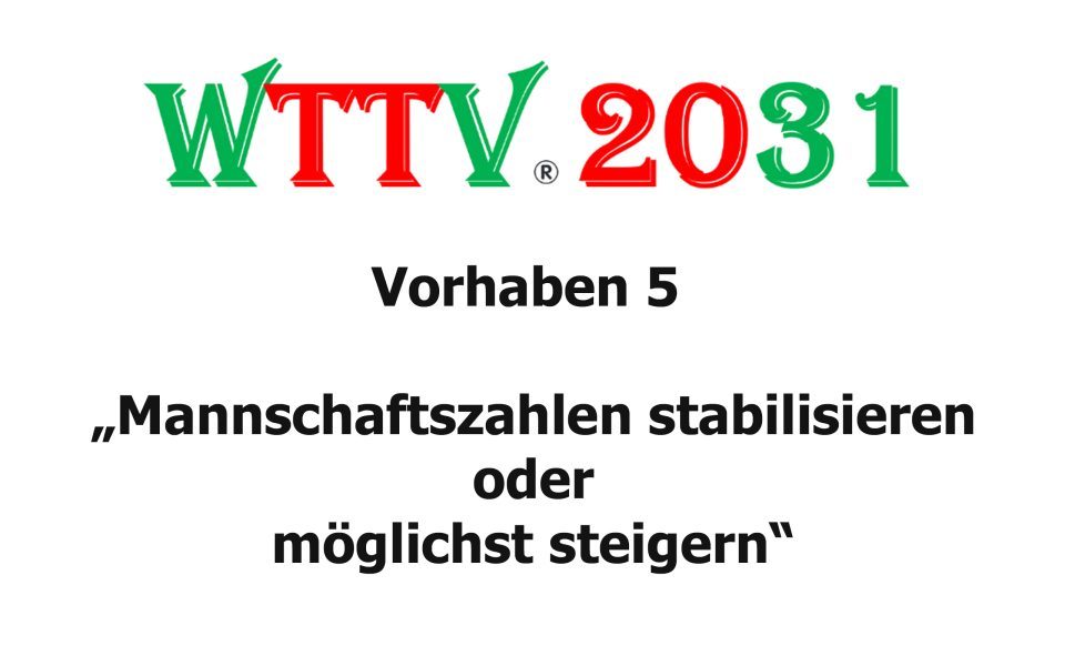 - Während die Verbandsebene auch weiterhin mit 6er-Mannschaften an den Start gehen soll, werden die diesbezüglichen Entwicklungen (in anderen Mitgliedsverbänden des DTTB) auch weiterhin aufmerksam beobachtet.