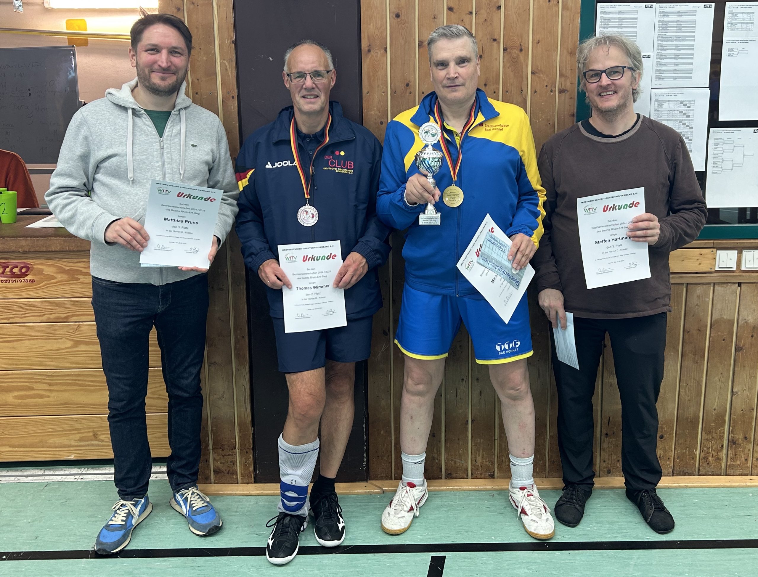 Ergebnisliste – Mit 150 TeilnehmerInnen waren 27% weniger Aktive in Lohmar dabei, als bei den BM 2023. Es wurden nur bei den Senioren der AK60 Doppel ausgetragen, in den übrigen Klassen entfiel die Doppelkonkurrenz, da die Halle um 22 Uhr geschlossen wurde!