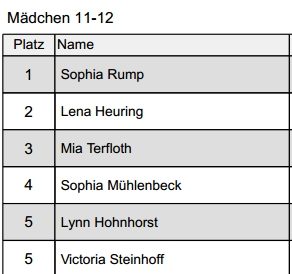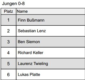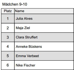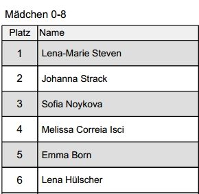 *nachträgliche Anmerkung zur Siegerliste:Bei den Mädchen 8 Jahr gab es einen nachträglichen Rückzug in Sachen Starterlaubnis (wegen bestehender Spielberechtigung). Dadurch rücken Platz 5 und 6 jeweils hoch.