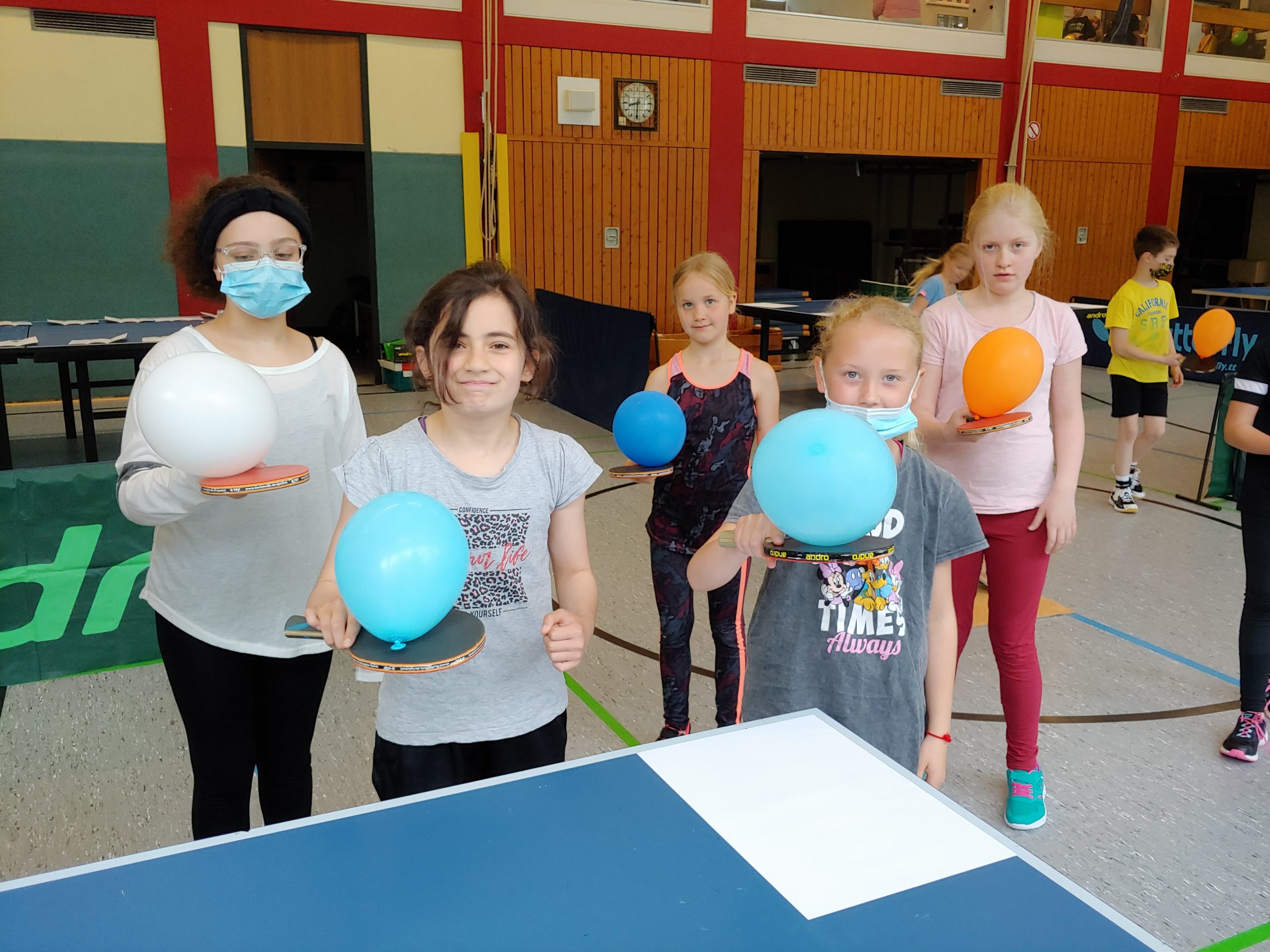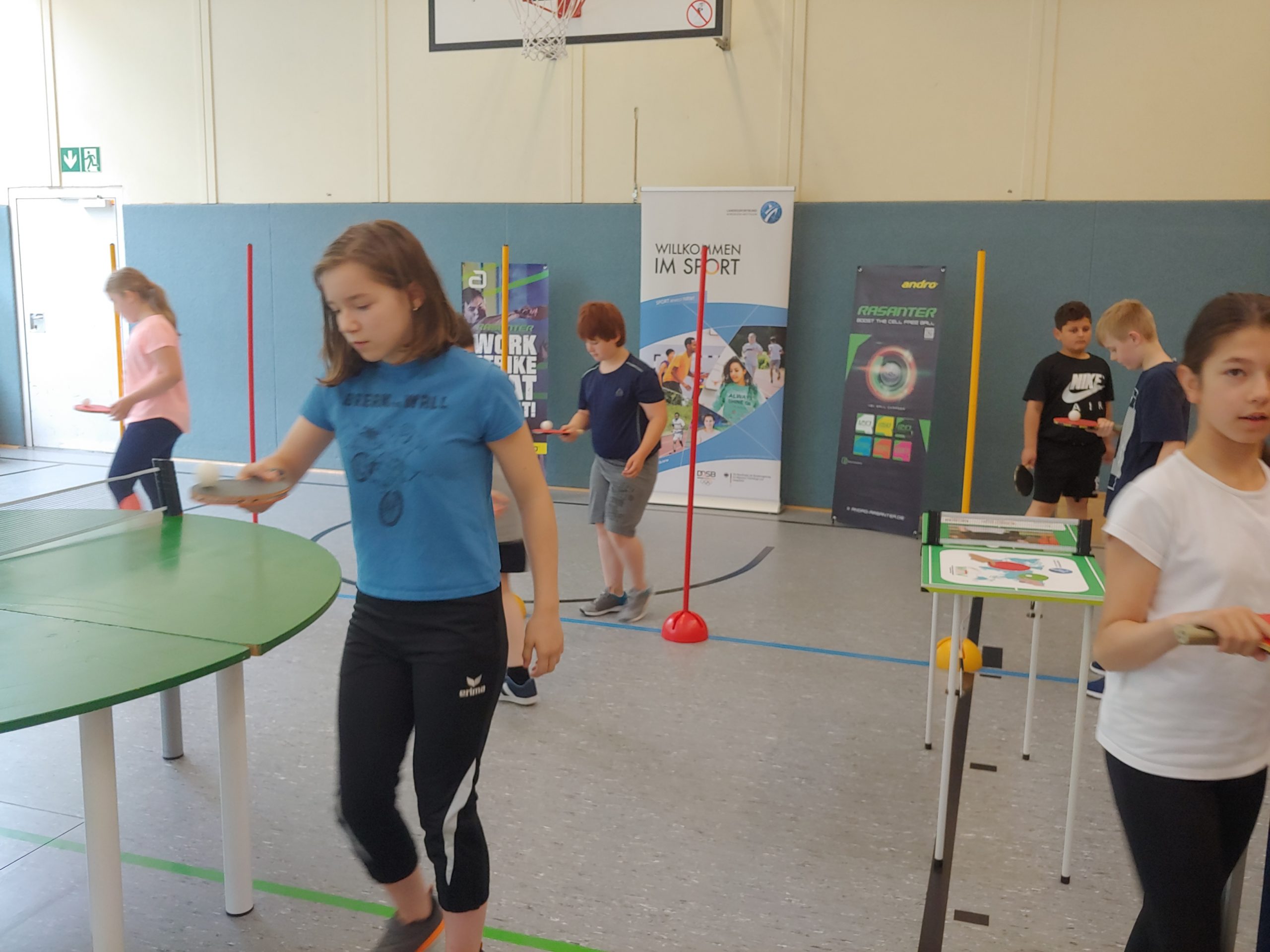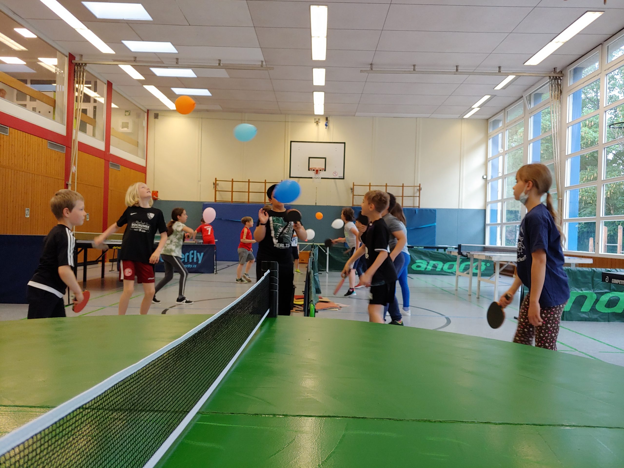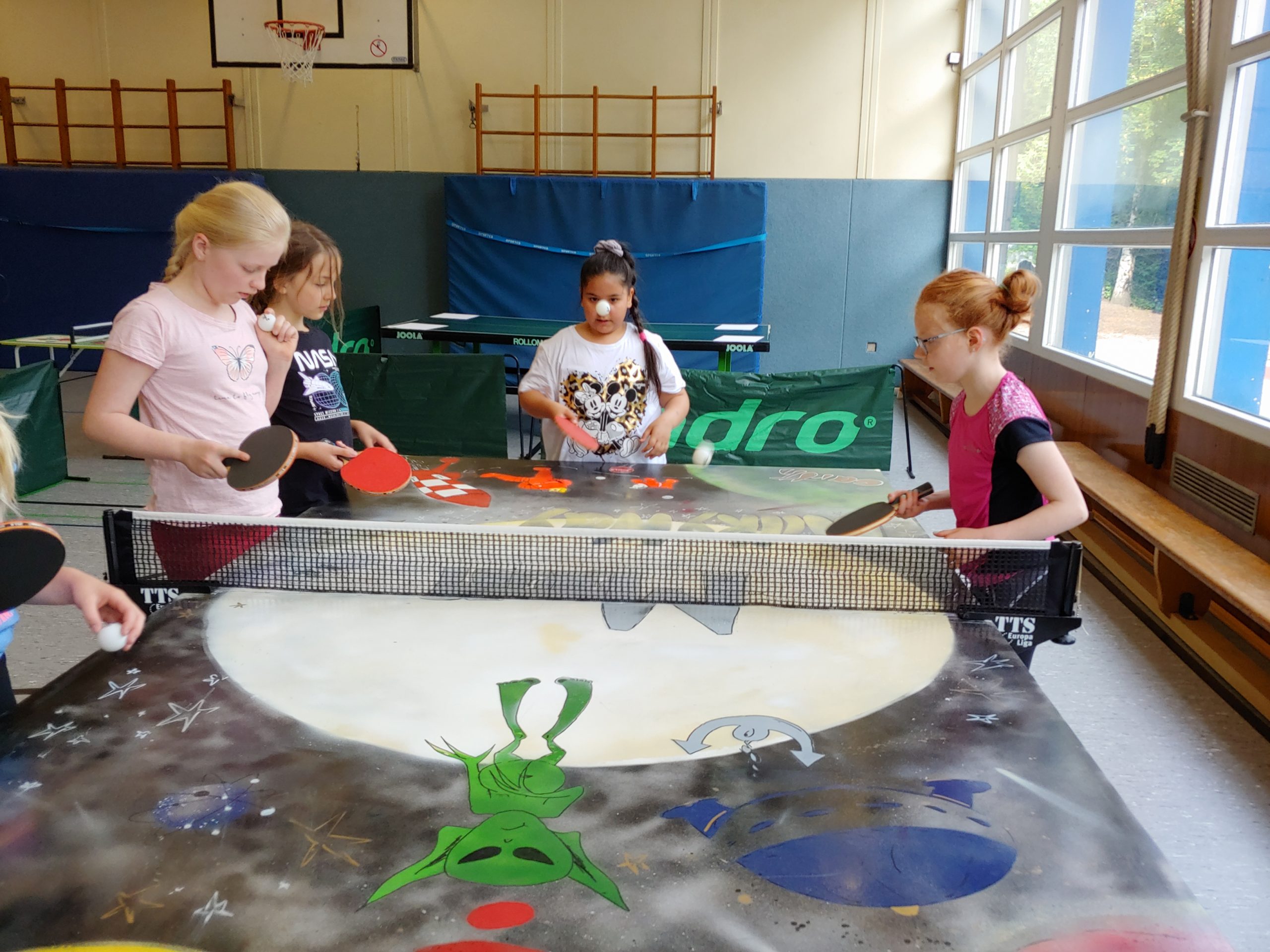 In der Woche vom 1.-10.06.2022 führte die Grundschule am Strückerberg eine Projektwoche durch. Unter dem Motto „Integration durch Sport“ boten sich dabei den Schülerinnen und Schülern des 3. und 4. Jahrgangs auch die Möglichkeit, an vielen verschiedenen Stationen und in abwechslungsreichen Spielformen Freude am Tischtennisspielen zu entwickeln. Ein Vorhaben, das durch die Bereitstellung eines großen Angebots an verschiedenen Mini-, Maxi- und Rundtischen des WTTVs neben den Standardtischen auch tatsächlich in die Tat umgesetzt werden konnten. Dabei war mit dem „Spacytisch“ auch schnell der Lieblingstisch der Kinder ausgemacht.