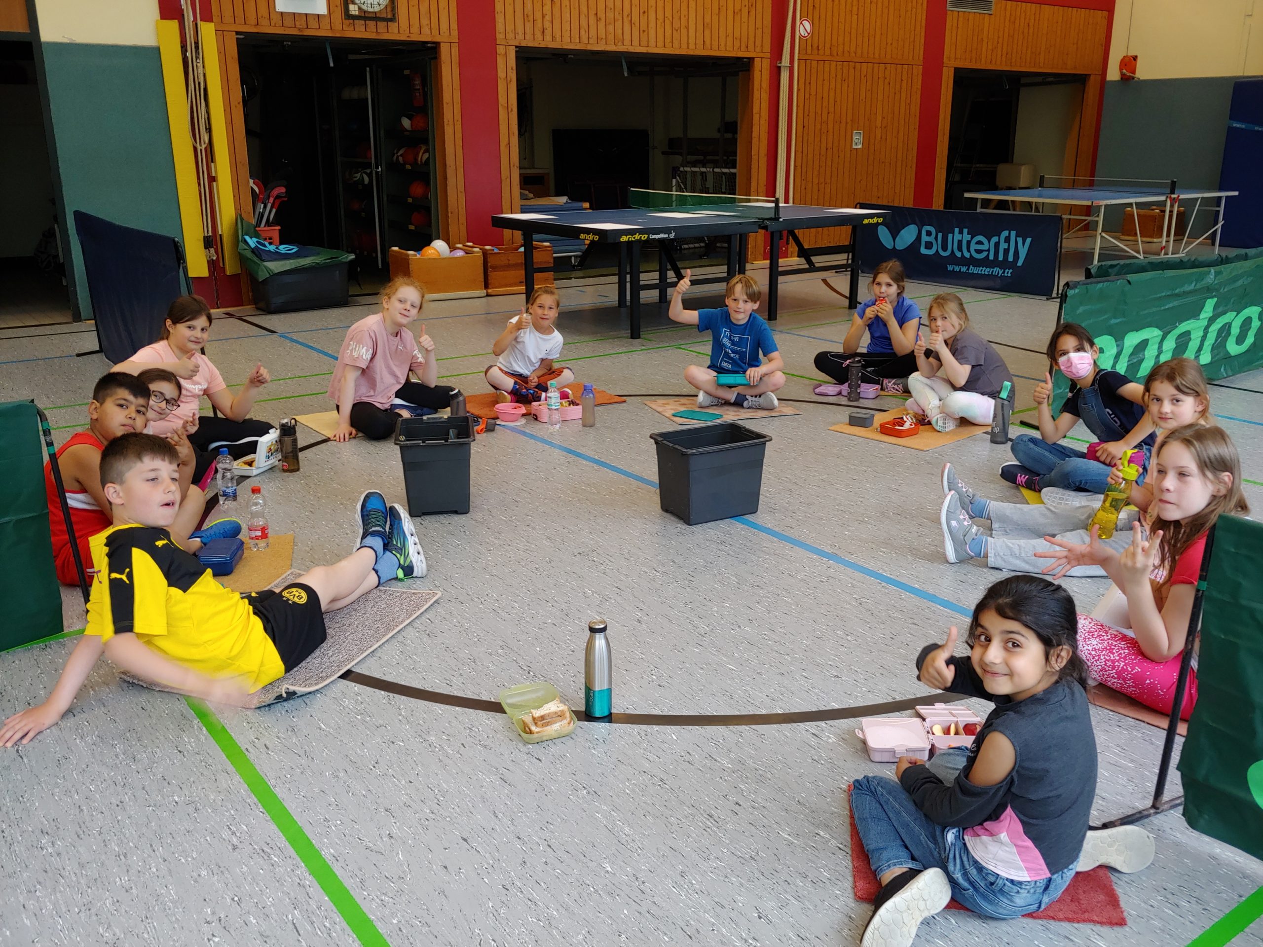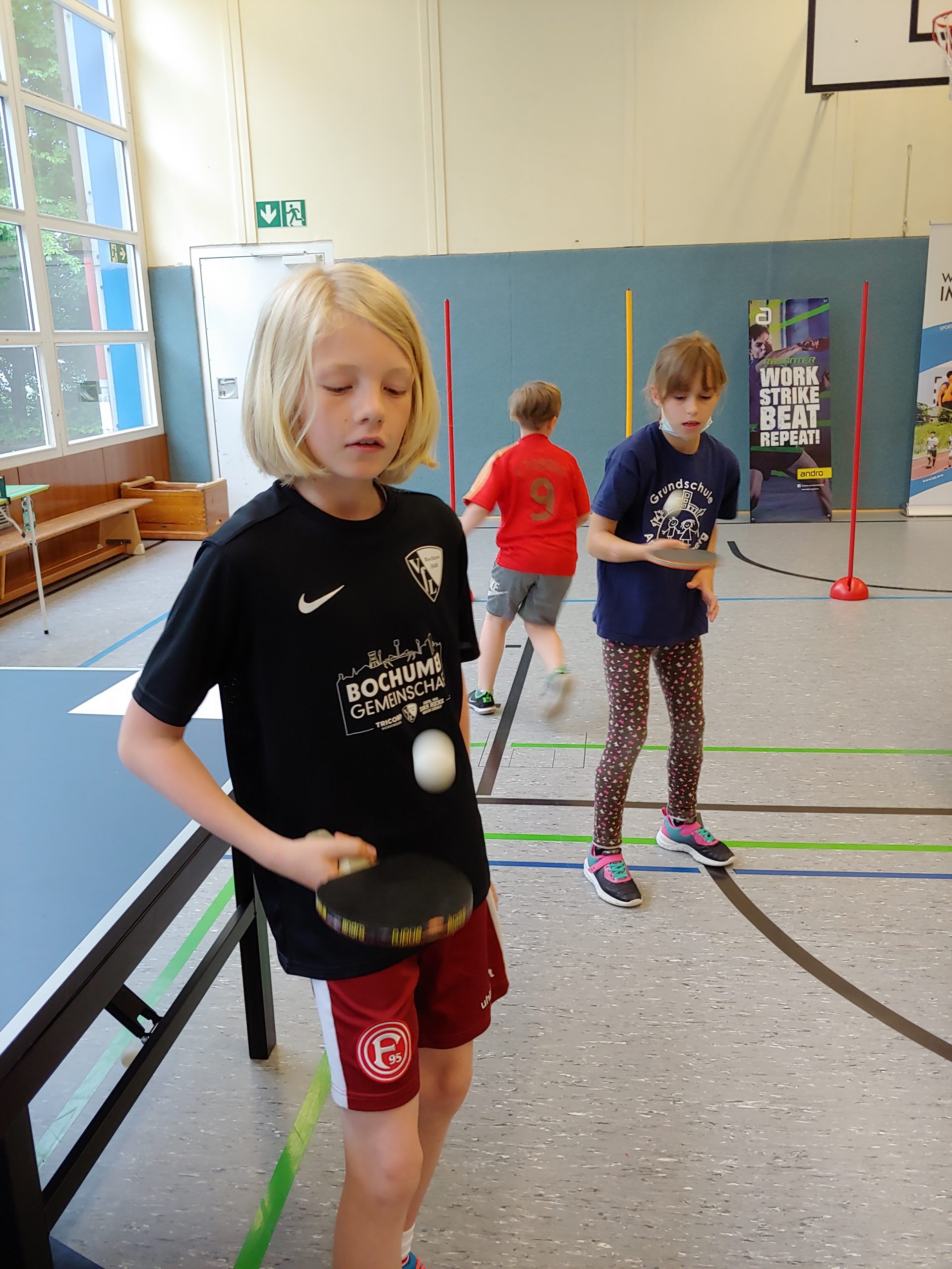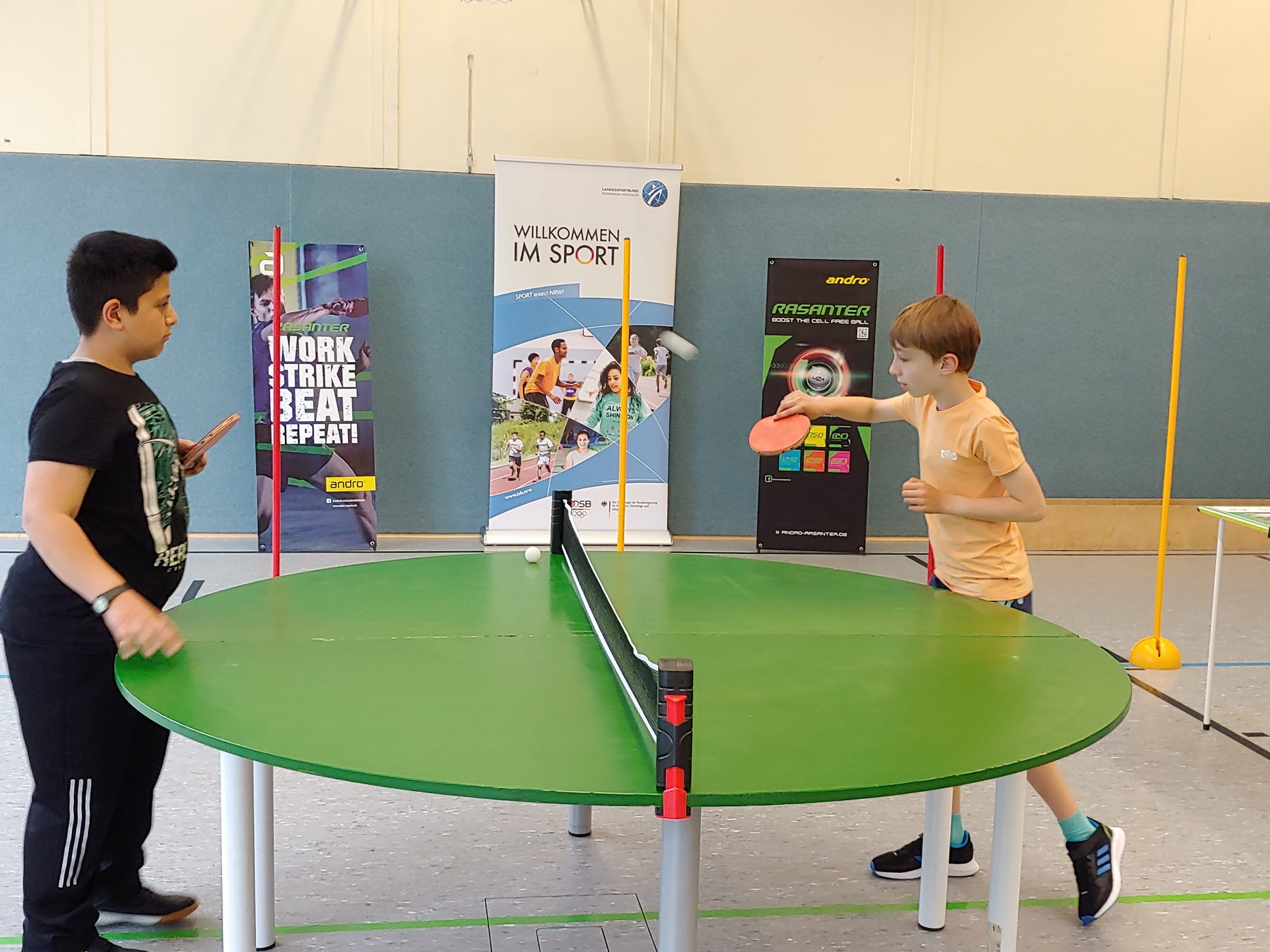 In der Woche vom 1.-10.06.2022 führte die Grundschule am Strückerberg eine Projektwoche durch. Unter dem Motto „Integration durch Sport“ boten sich dabei den Schülerinnen und Schülern des 3. und 4. Jahrgangs auch die Möglichkeit, an vielen verschiedenen Stationen und in abwechslungsreichen Spielformen Freude am Tischtennisspielen zu entwickeln. Ein Vorhaben, das durch die Bereitstellung eines großen Angebots an verschiedenen Mini-, Maxi- und Rundtischen des WTTVs neben den Standardtischen auch tatsächlich in die Tat umgesetzt werden konnten. Dabei war mit dem „Spacytisch“ auch schnell der Lieblingstisch der Kinder ausgemacht.