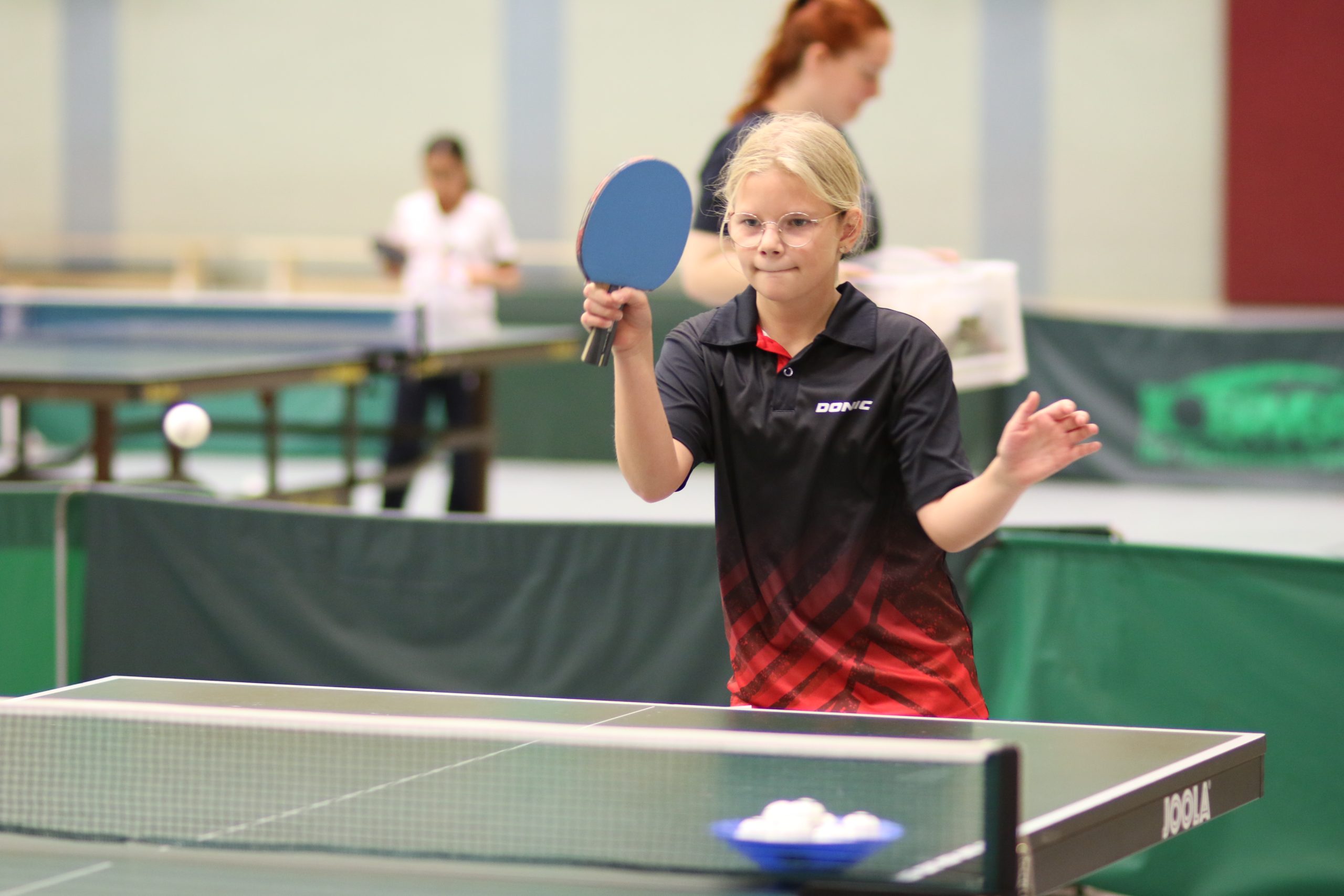Die erste Trainingseinheit fand von 11:00 bis 13:00 Uhr statt. Aufgeteilt in drei Gruppen wurden die Mädchen nach dem Aufwärmen bei unterschiedlichen Tischtennisübungen gefordert. Jede Teilnehmerin konnte ihre Talente entfalten und gleichzeitig neue Fähigkeiten erlernen. Die Trainer sorgten dafür, dass jede Übung nicht nur lehrreich, sondern auch stets mit einer Prise Spaß verbunden war.