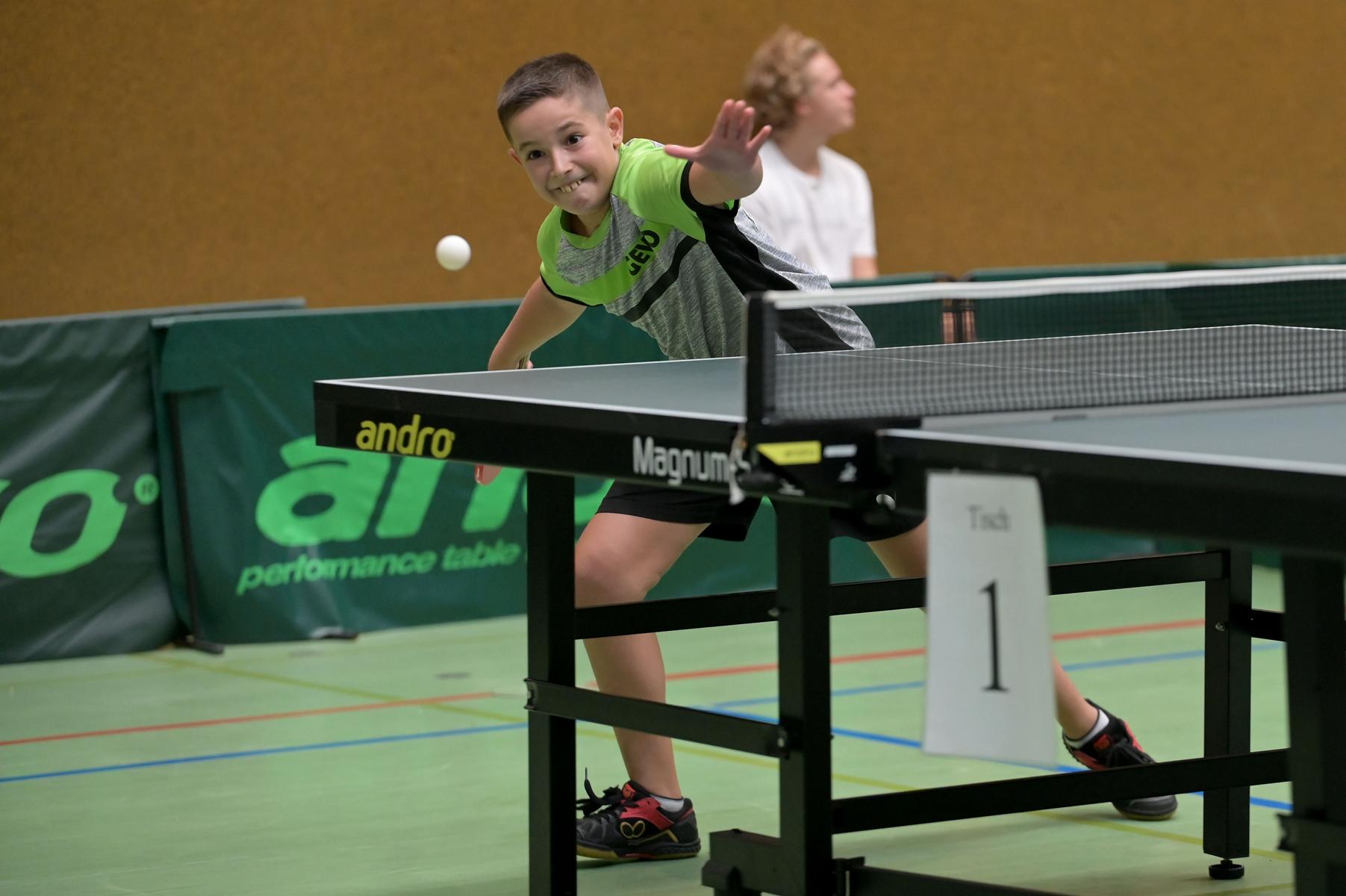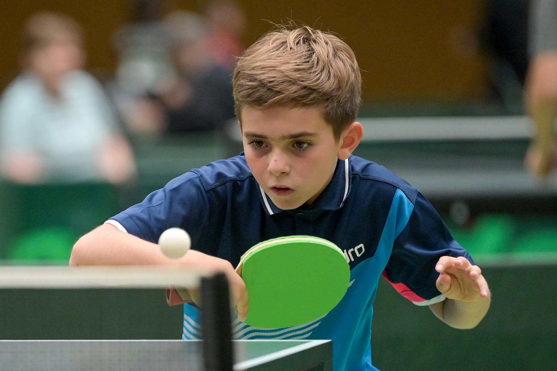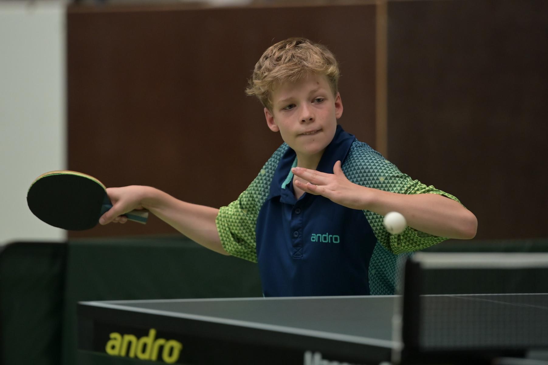 Bei den Jungen13 hatte wohl niemand so richtig Tom Henseler auf dem Schirm. Schon in der ersten Runde rang Tom den Mitfavoriten Dorian Lheriau mit 3:2 nieder. Dieser Sieg gab dem Linkshänder Tom viel Sicherheit und Selbstvertrauen, so dass er sich mit gutem Aufschlagspiel und unangenehmen Linkshändertopspins immer mehr ins Turnier reinspielte. Am Ende verlor er kein einziges Match und war der verdiente Sieger, der damit auch das Ticket zum Top48 der Jugend15 löste.