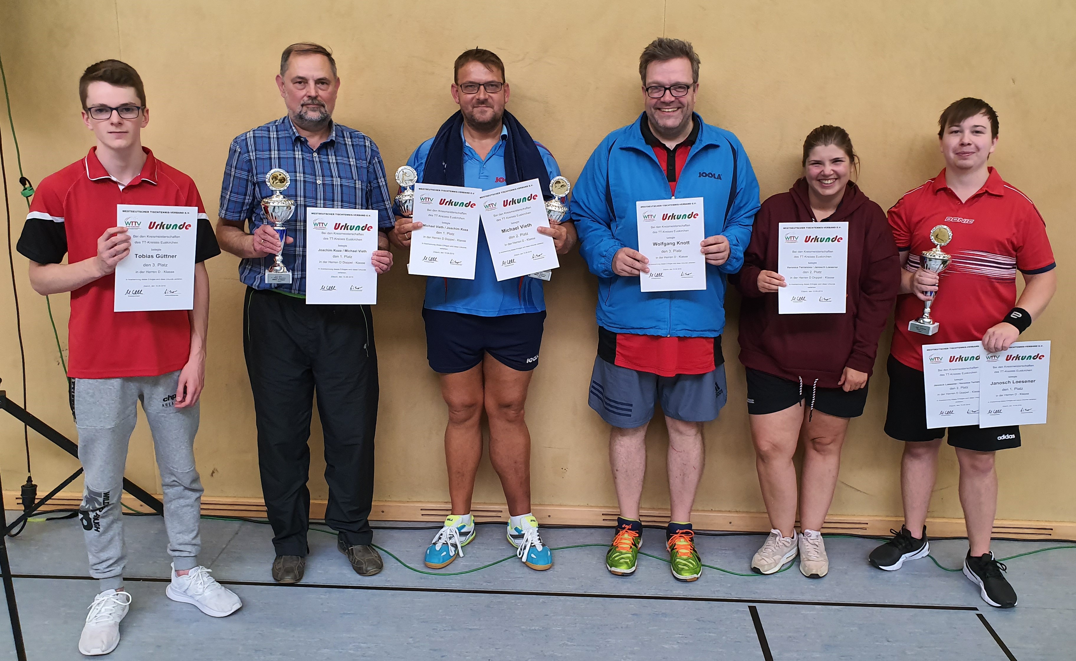 Die Herren-D-Klasse mit 11 Teilnehmern gewann Janosch Loesener vom TV Kuchenheim vor Michael Vieth vom TTC Lechenich. Den Sieg im Doppel sicherten sich Joachim Koza und Michael Vieth (TTC Vernich/TTC Lechenich).