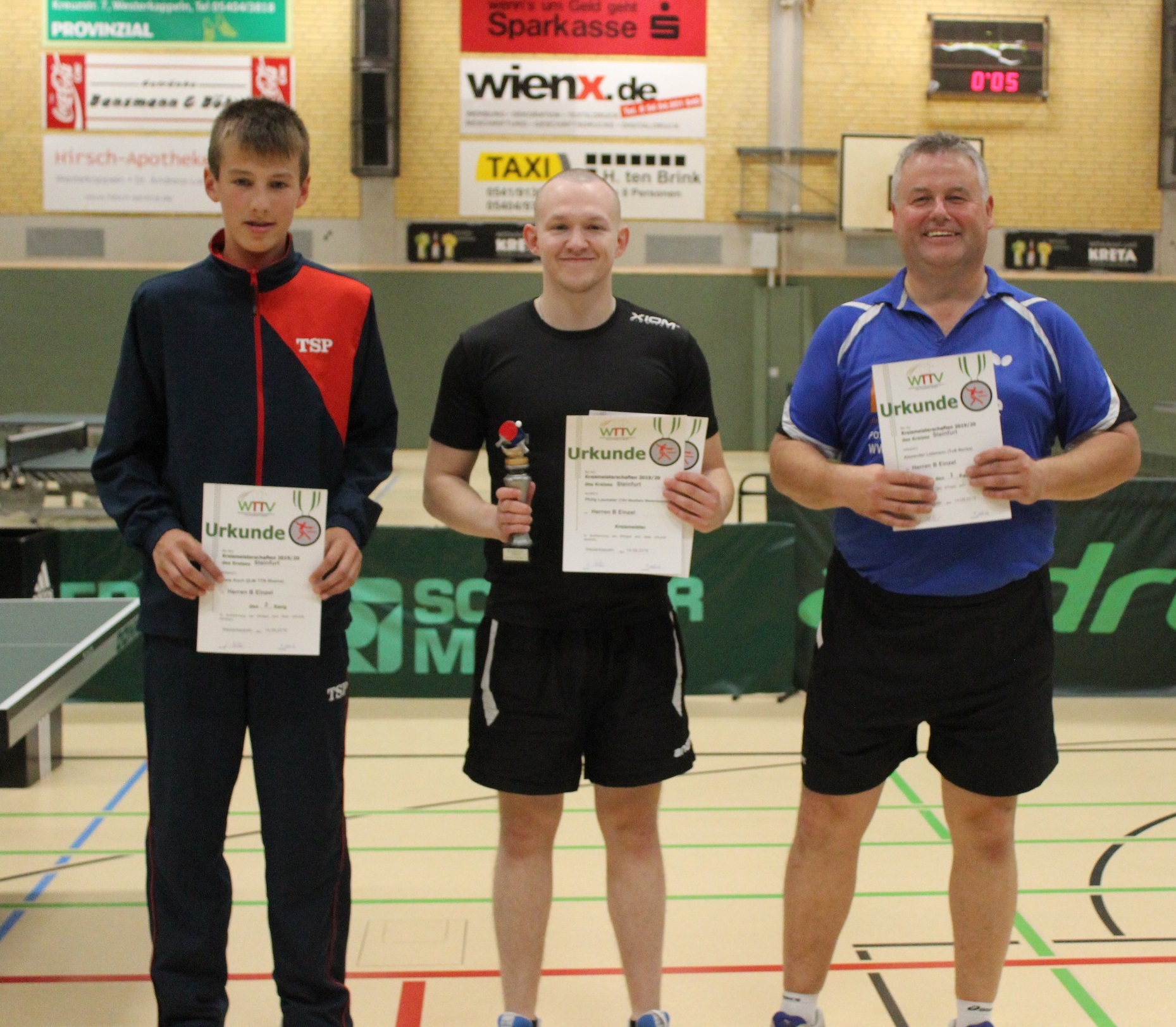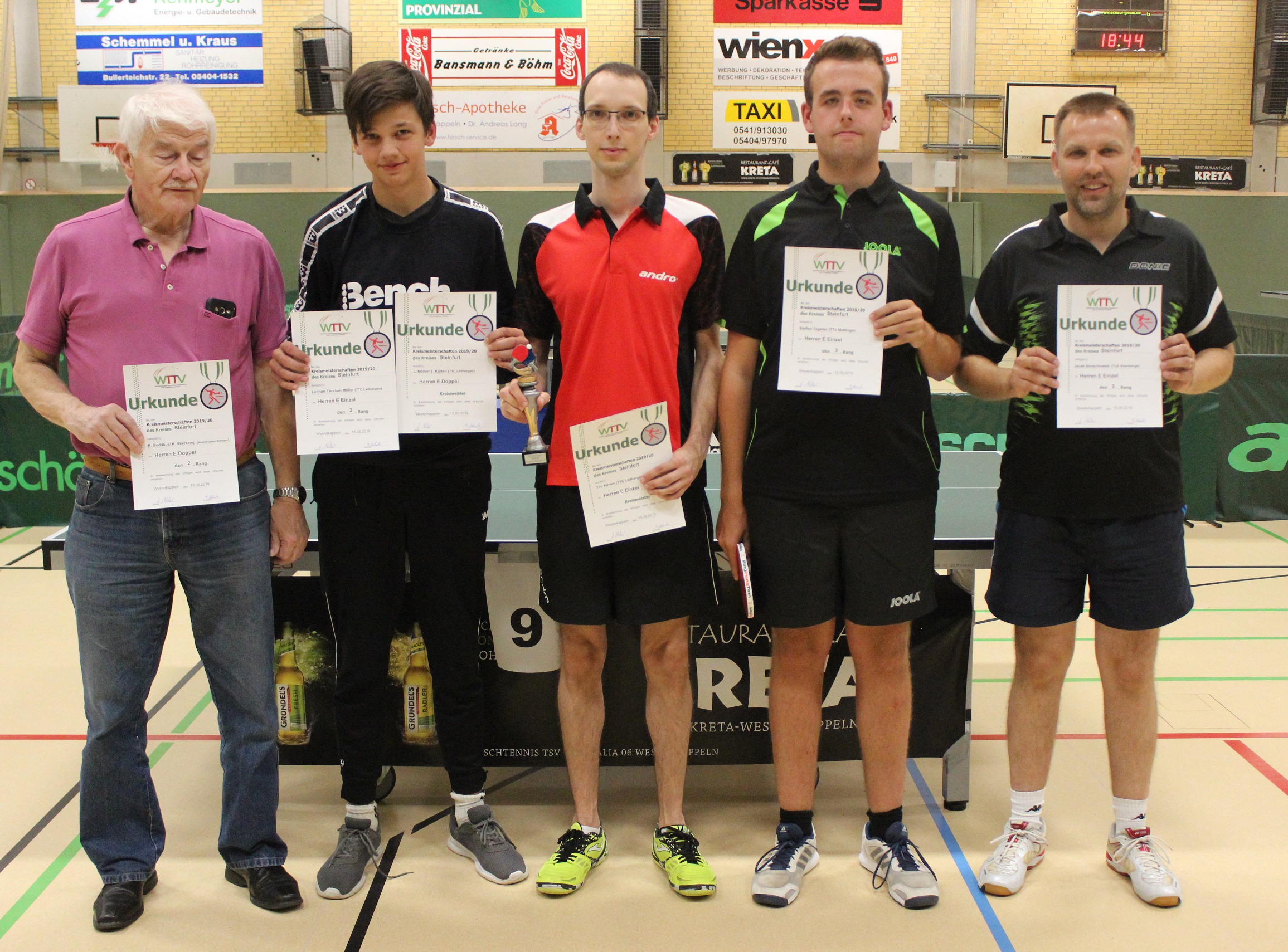 Herren/Damen E (Einzel): 1. Tim Kürten (TTC Ladbergen), 2. Lennart Möller (TTC Ladbergen), 3. Steffen Tegeder (TTV Mettingen) und Jacek Streschewski (TuS Altenberge)