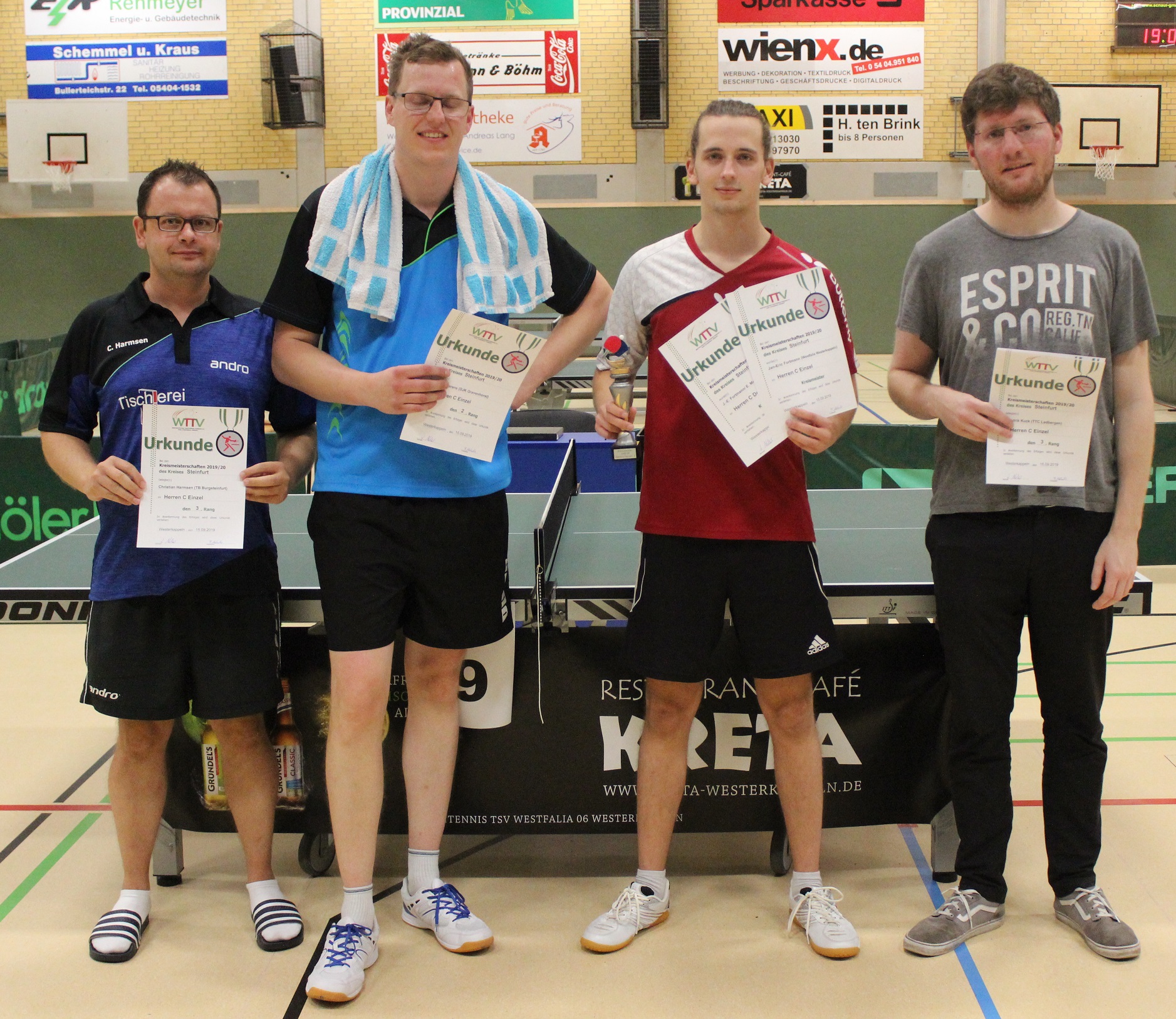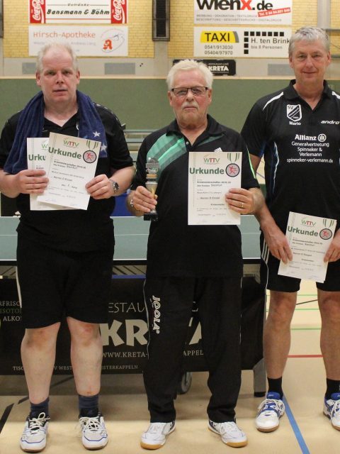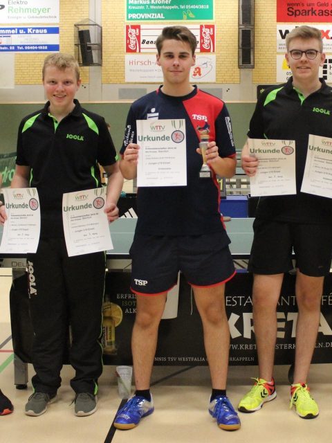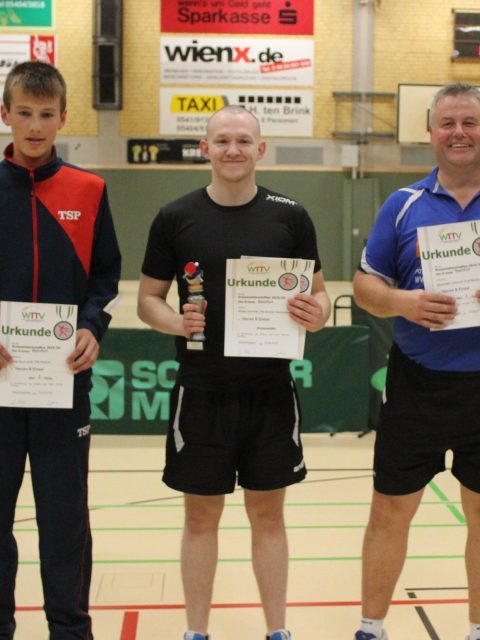 Herren A (Einzel): 1. Christopher Ligocki (Arminia Ochtrup), 2. Sergej Schwebel (Westfalia Westerkappeln), 3. Philip Laumeier (Westfalia Westerkappeln) und Philip Brosch (Arminia Ochtrup)