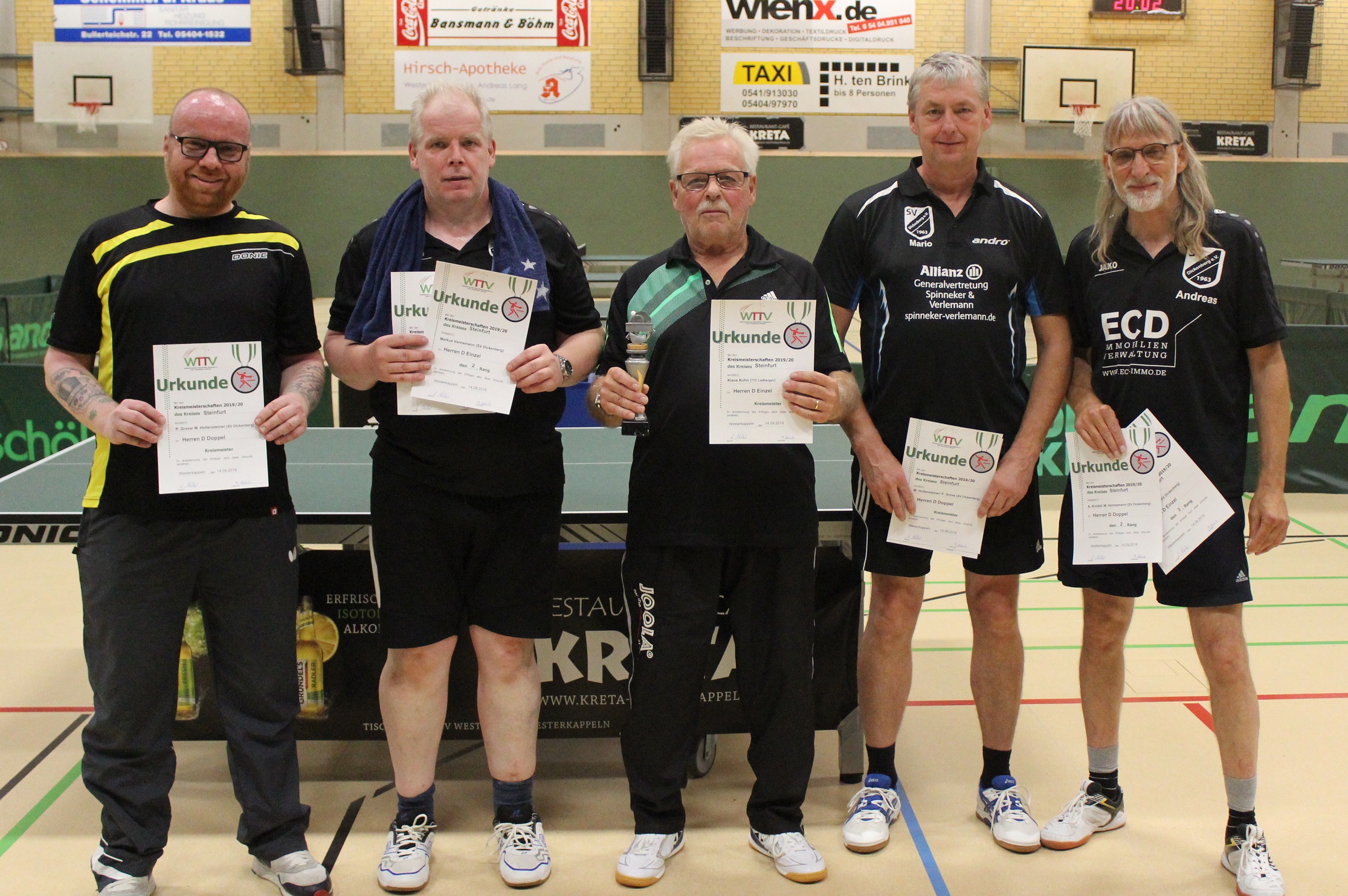 Herren/Damen D (Einzel): 1. Klaus Kuhn (TTC Ladbergen), 2. Marcus Vennemann (SV Dickenberg), 3. Mario Hollensteiner (SV Dickenberg) und Andreas Knöfel (SV Dickenberg)