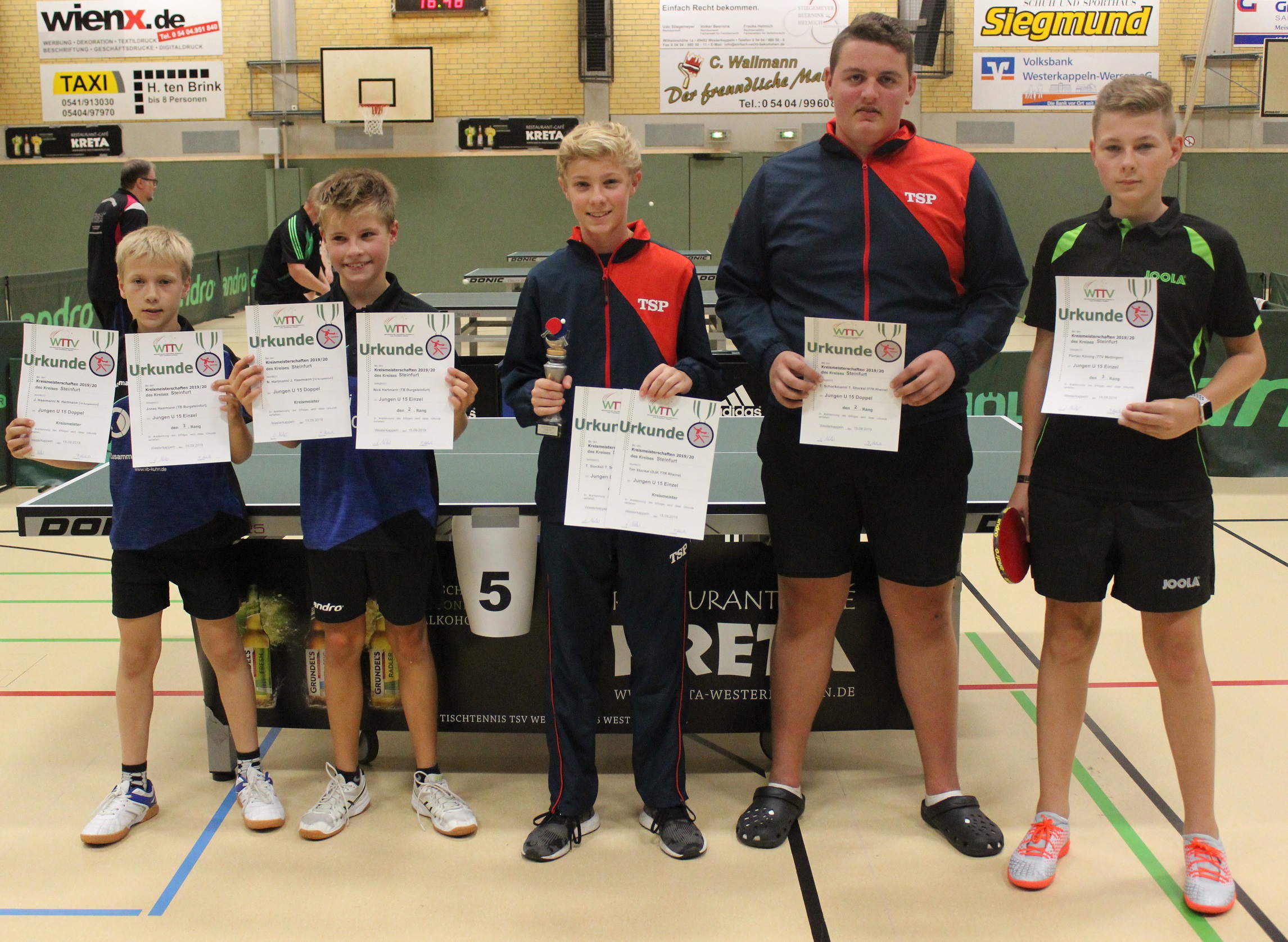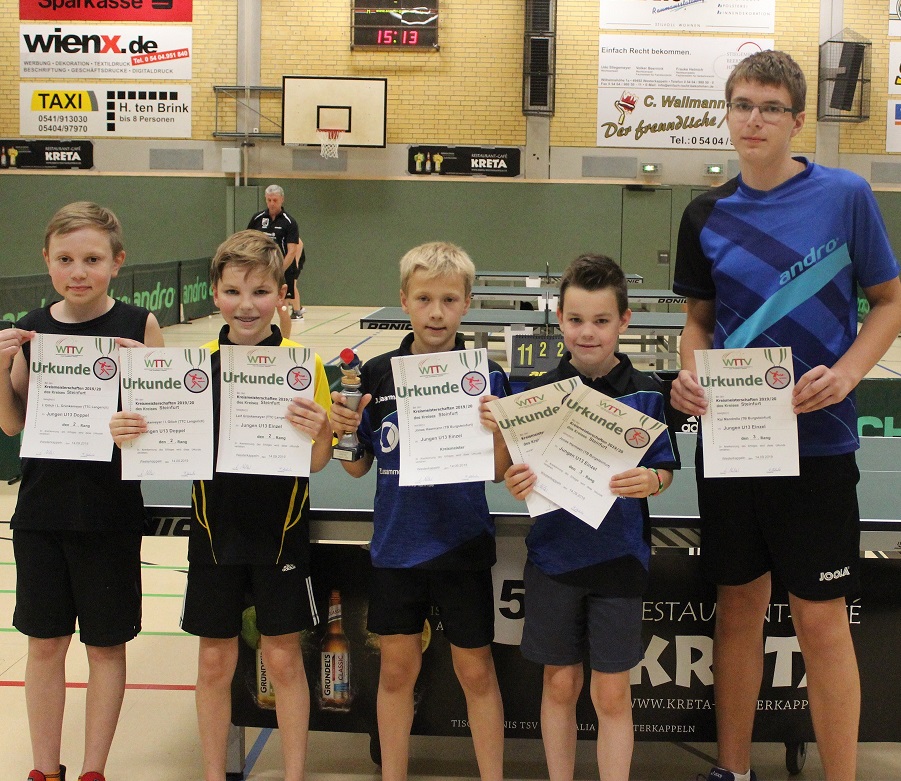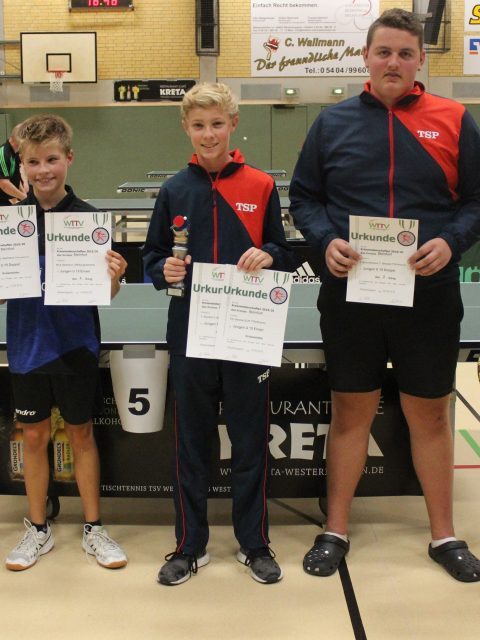 Jungen U15 (Einzel): 1. Tim Stockel (TTR Rheine), 2. Nick Hartmann (TB Burgsteinfurt), 3. Jonas Haarmann (TB Burgsteinfurt) und Florian Köning (TTV Mettingen)