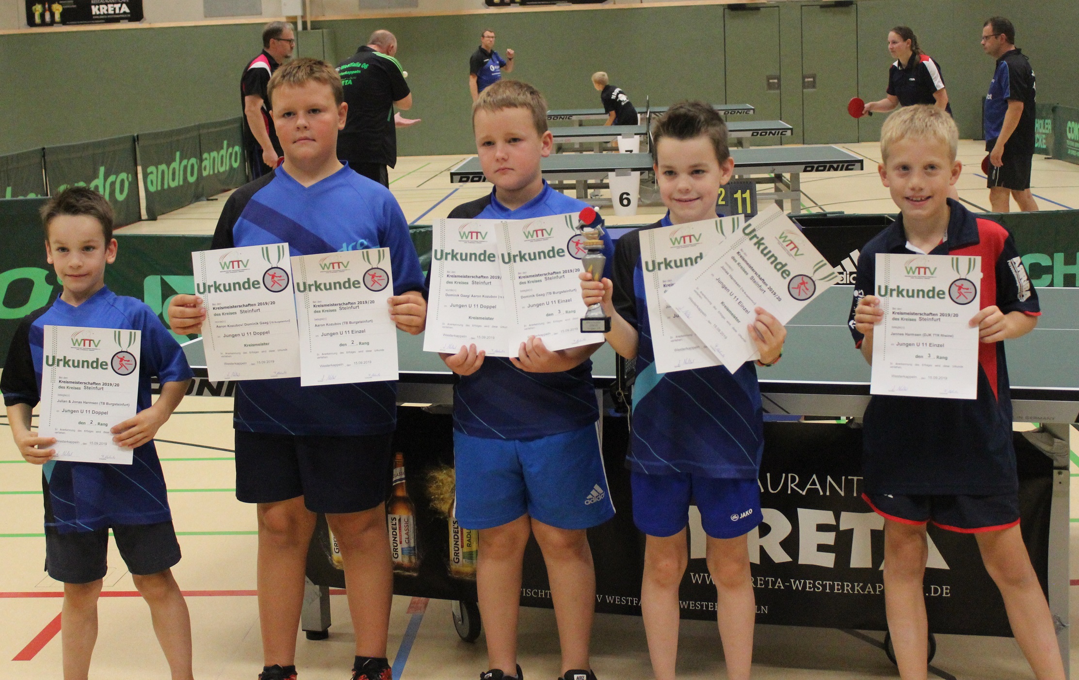 Jungen U11 (Einzel): 1. Jonas Harmsen (TB Burgsteinfurt), 2. Aaron Kozubov (TB Burgsteinfurt), 3. Jannes Harmsen (TTR Rheine) und Dominik Gaag (TB Burgsteinfurt)