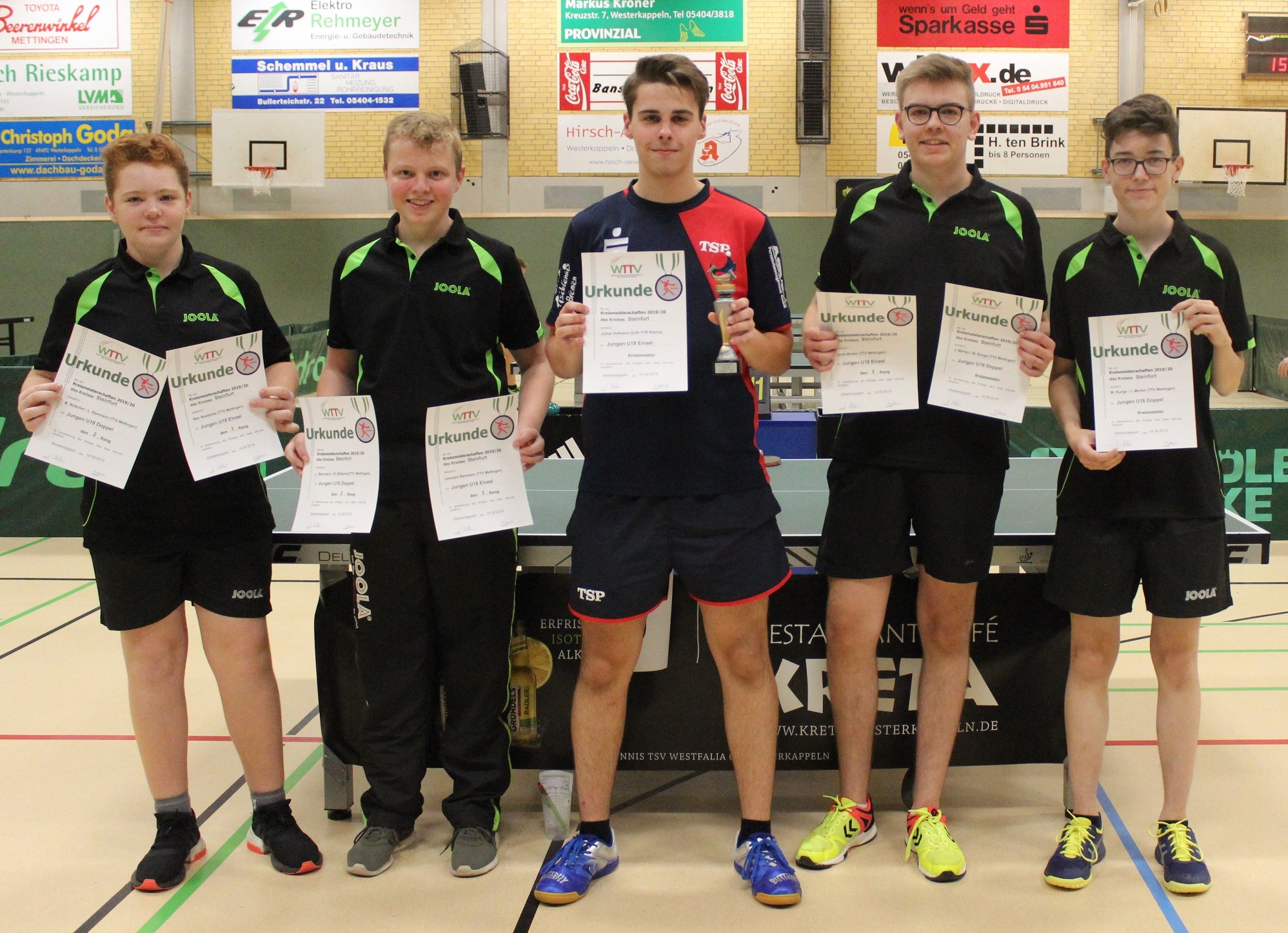 Jungen U18 (Einzel): 1. Julius Hofmann (TTR Rheine), 2. Janik Marten (TTV Mettingen), 3. Lennard Stermann (TTV Mettingen) und Ben Boettcher (TTV Mettingen)