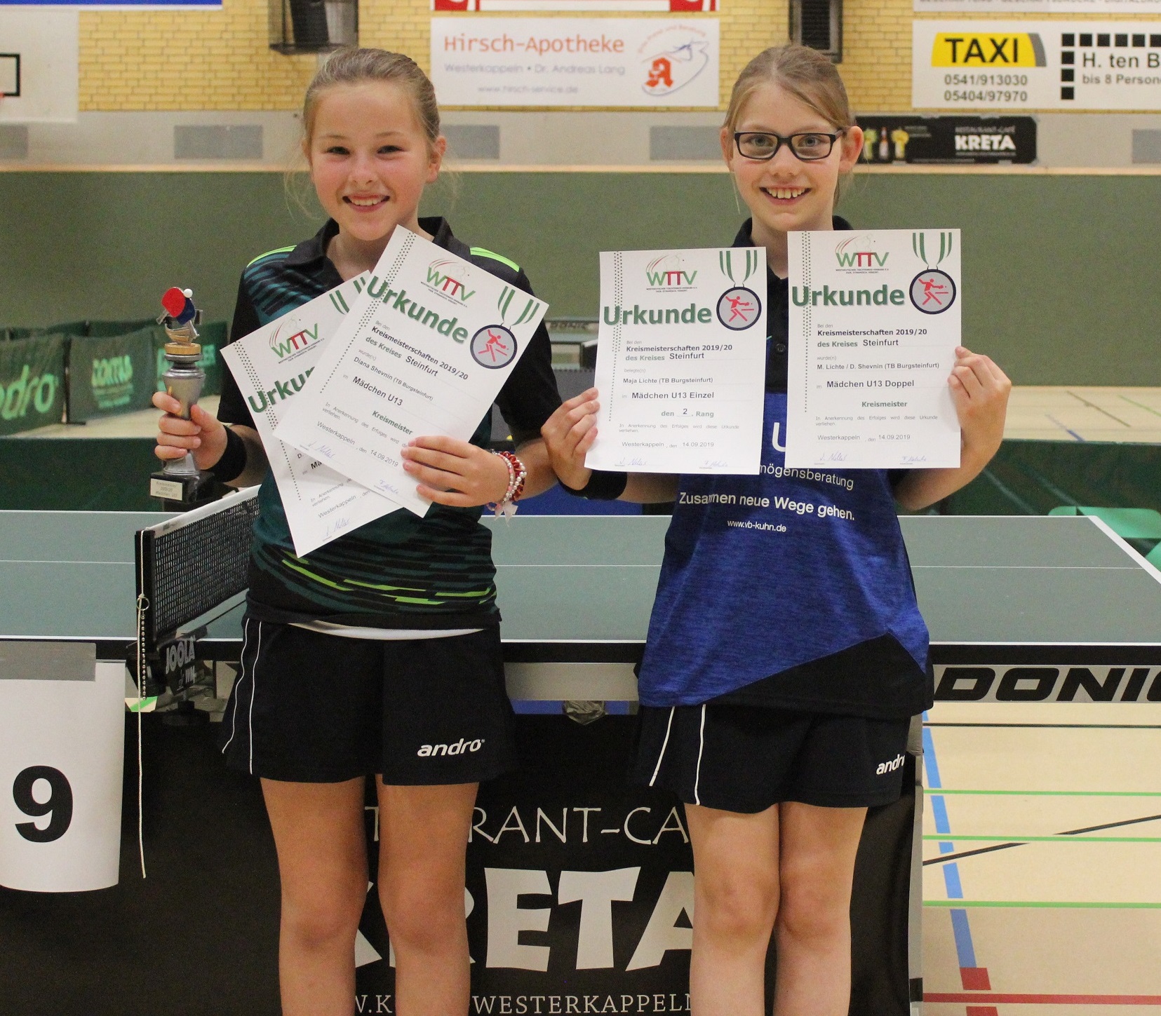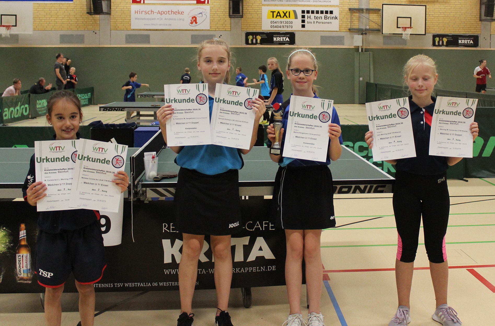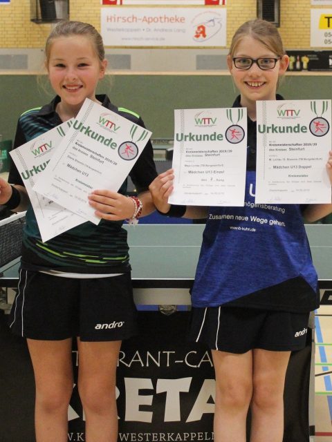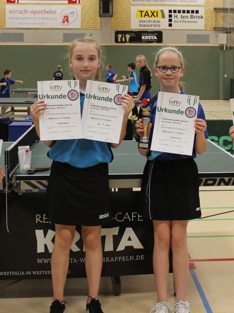 Mädchen U11 (Doppel): 1. Marina Hengstmann (TB Burgsteinfurt)/Hannah Kuhmann (Arminia Ochtrup), 2. Melissa Correia Isci/Leni Werning (TTR Rheine)
