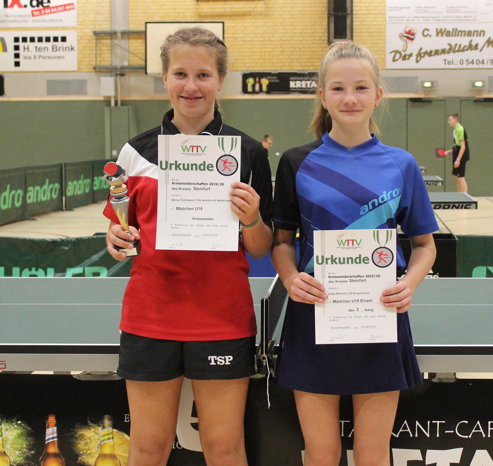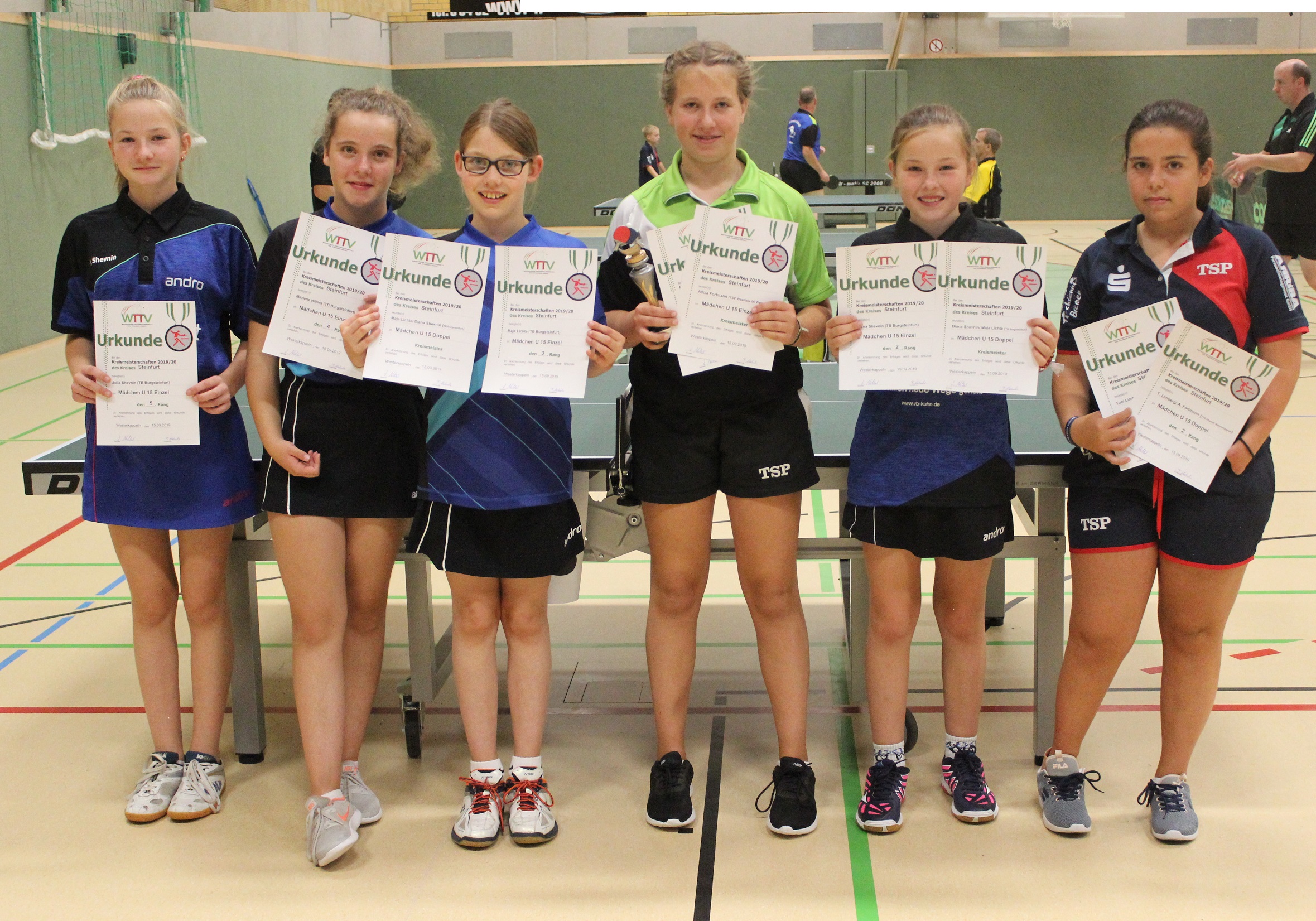 Mädchen U15 (Doppel): 1. Diana Shevnin/Maja Lichte (TB Burgsteinfurt), 2. Alicia Fortmann (Westfalia Westerkappeln)/Toni Limberg (TTR Rheine)