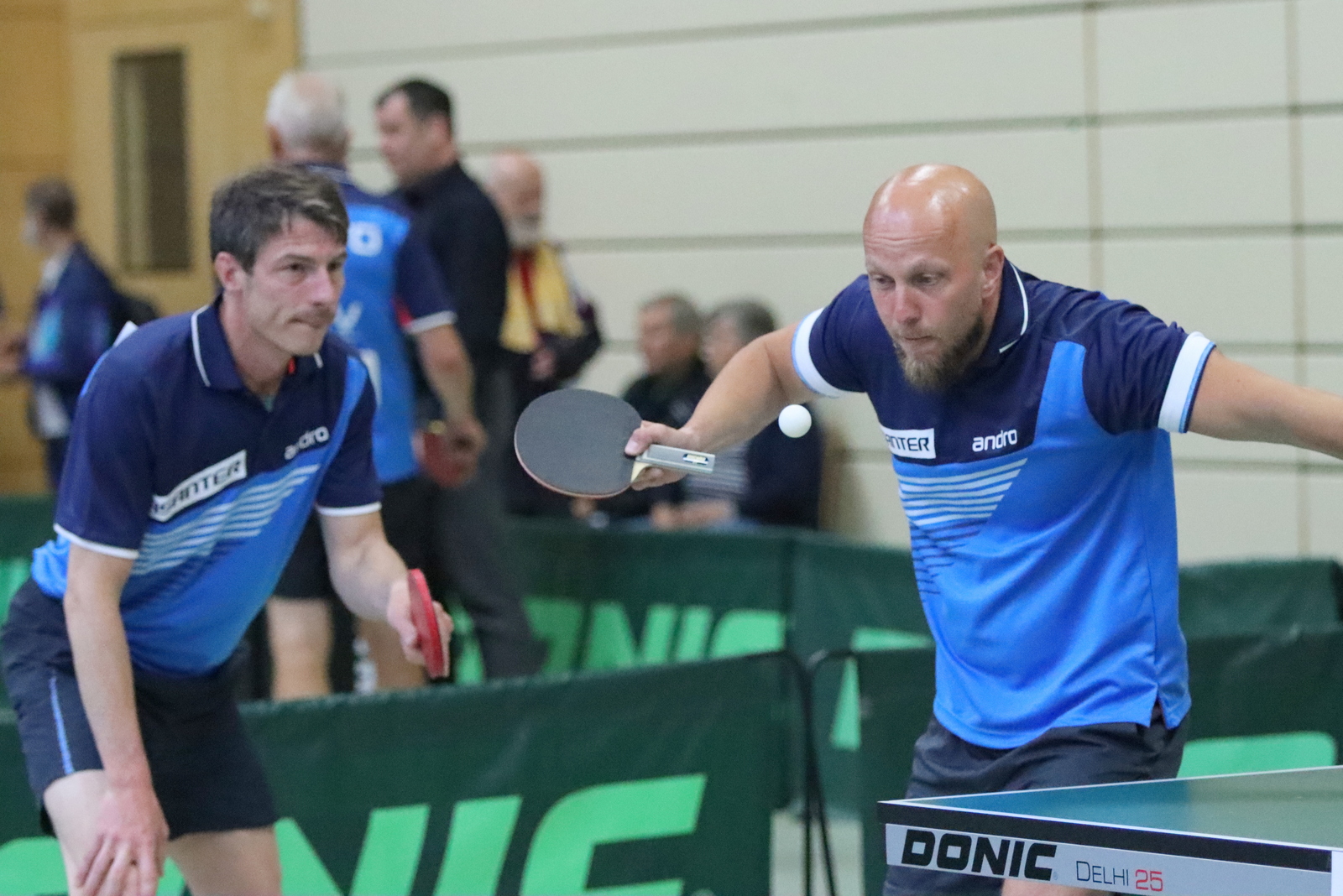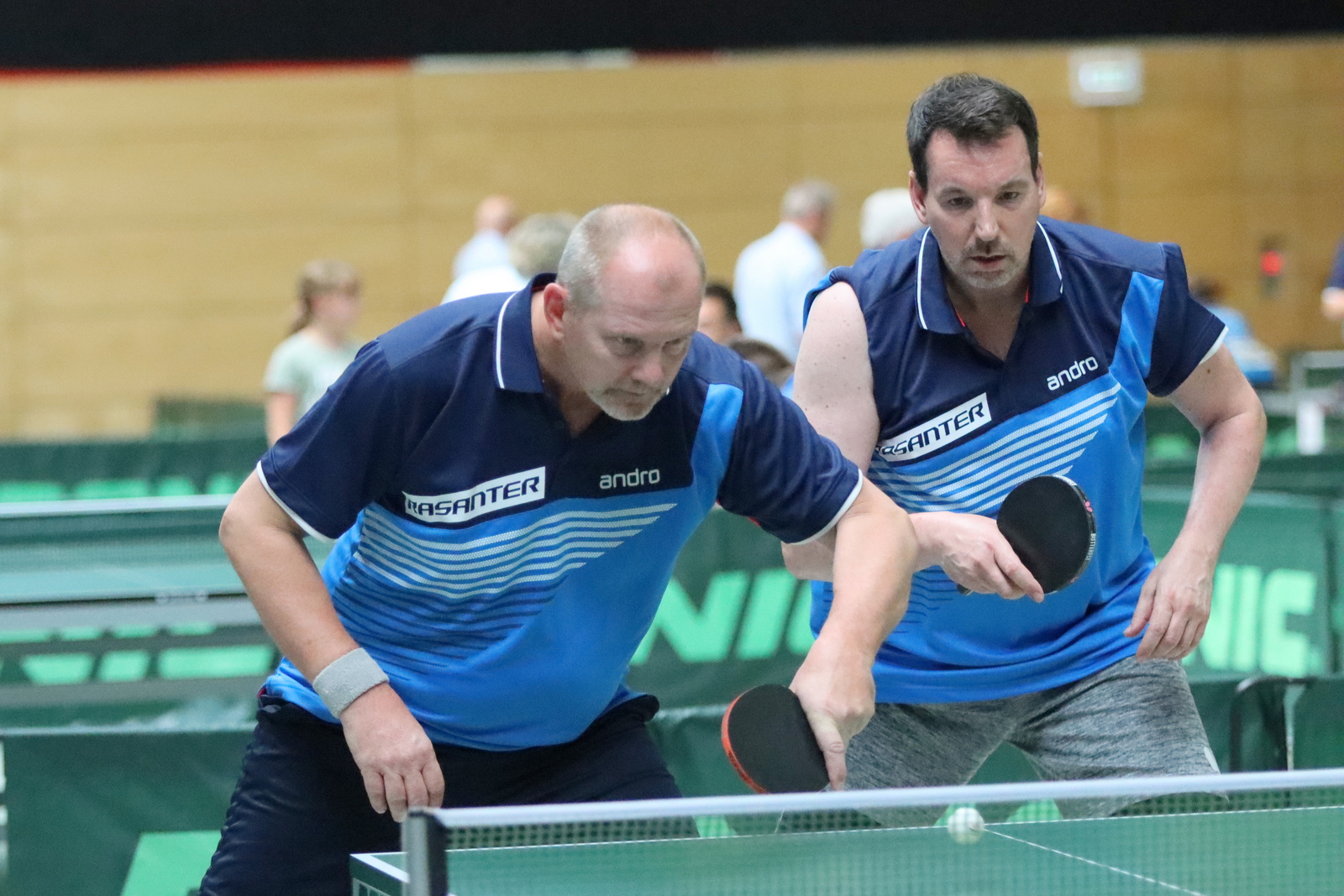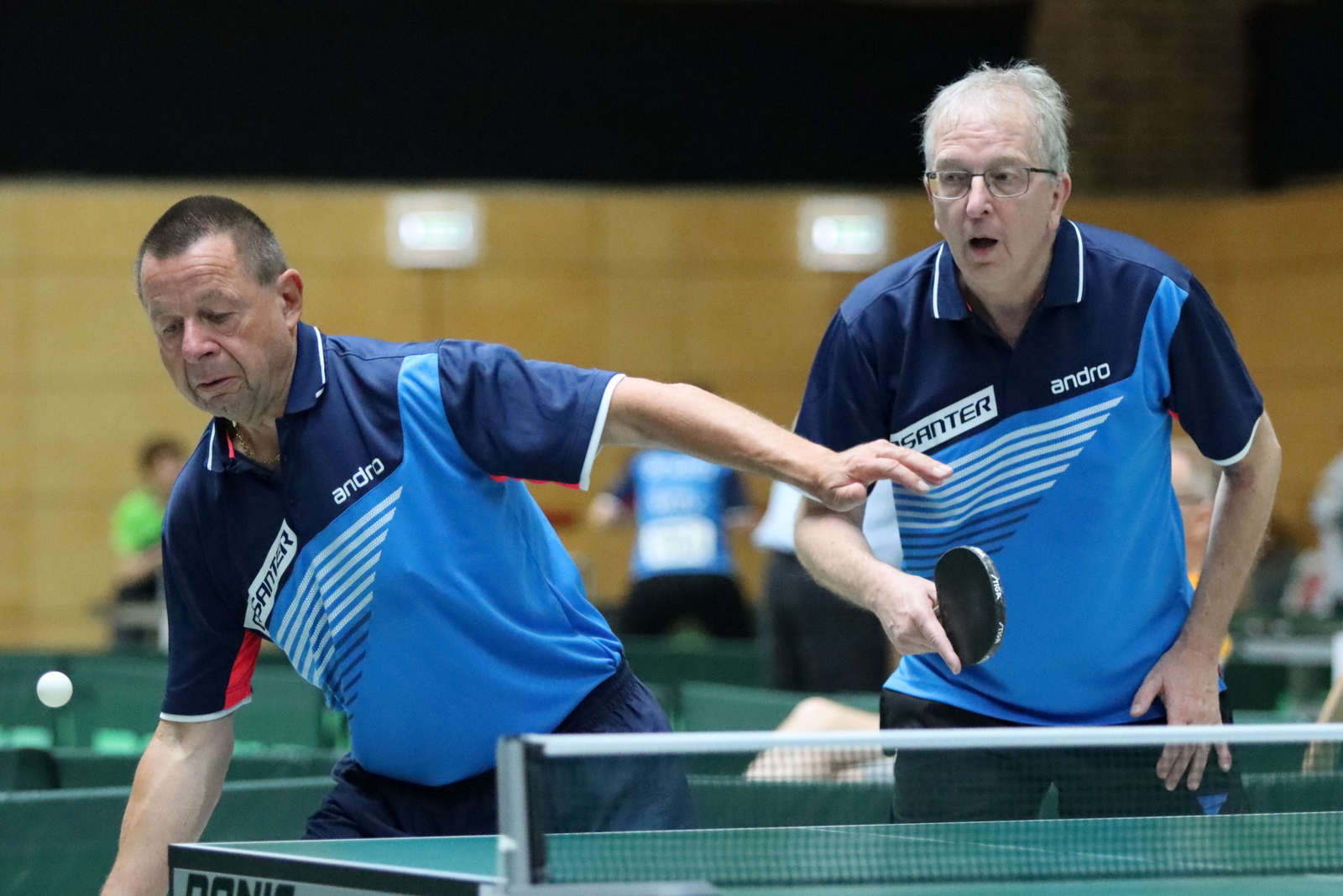 Für großartige Atmosphäre sorgten spektakuläre Auftritte von Wolfgang Gerth und Joachim Beumers (Sen-50) in Einzel und Doppel und dazu das Linkshänder-Doppel Maurice Mann/Guido Schmitz (Sen-45).