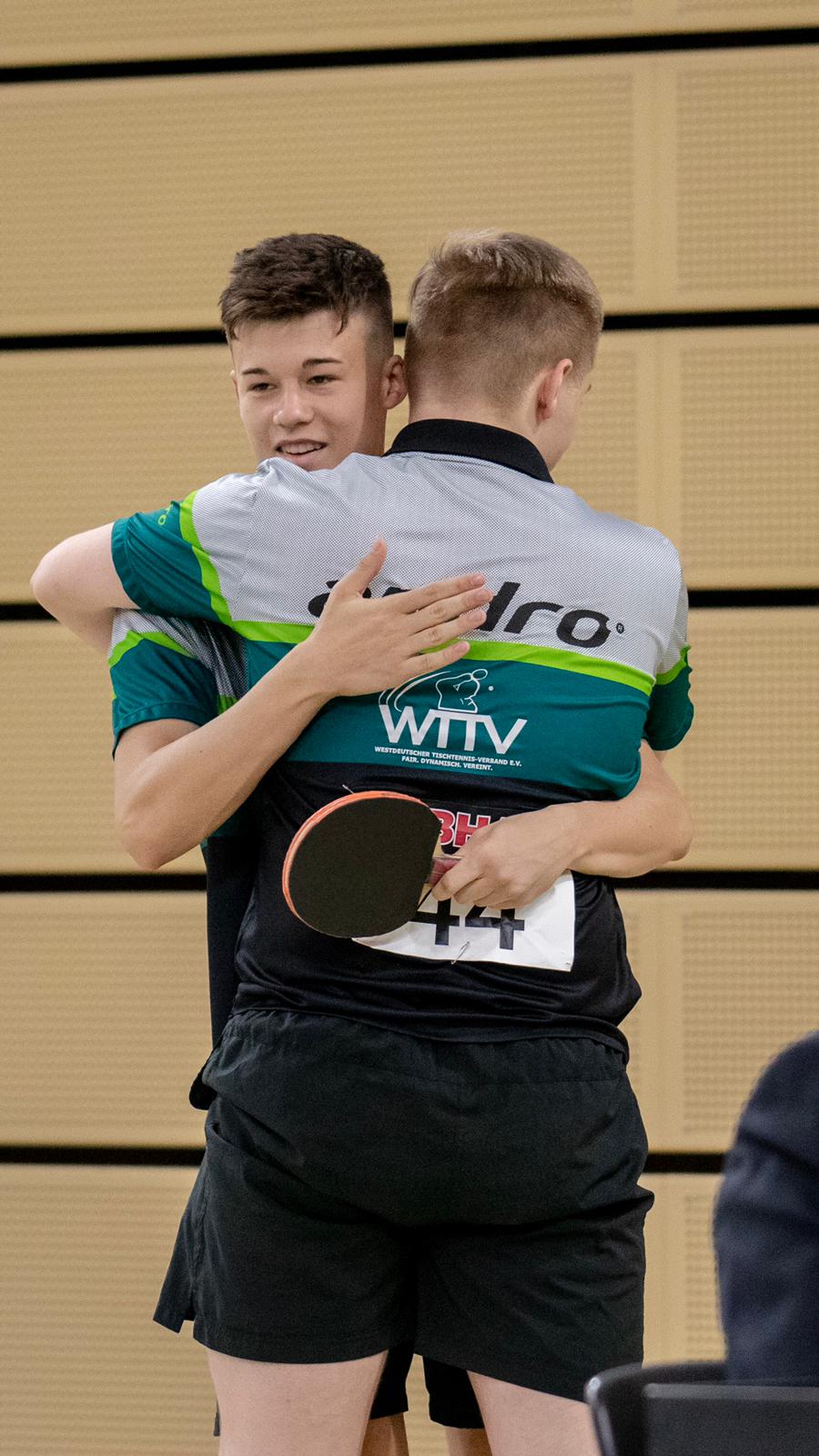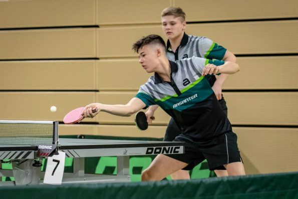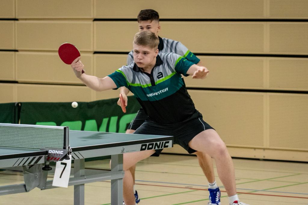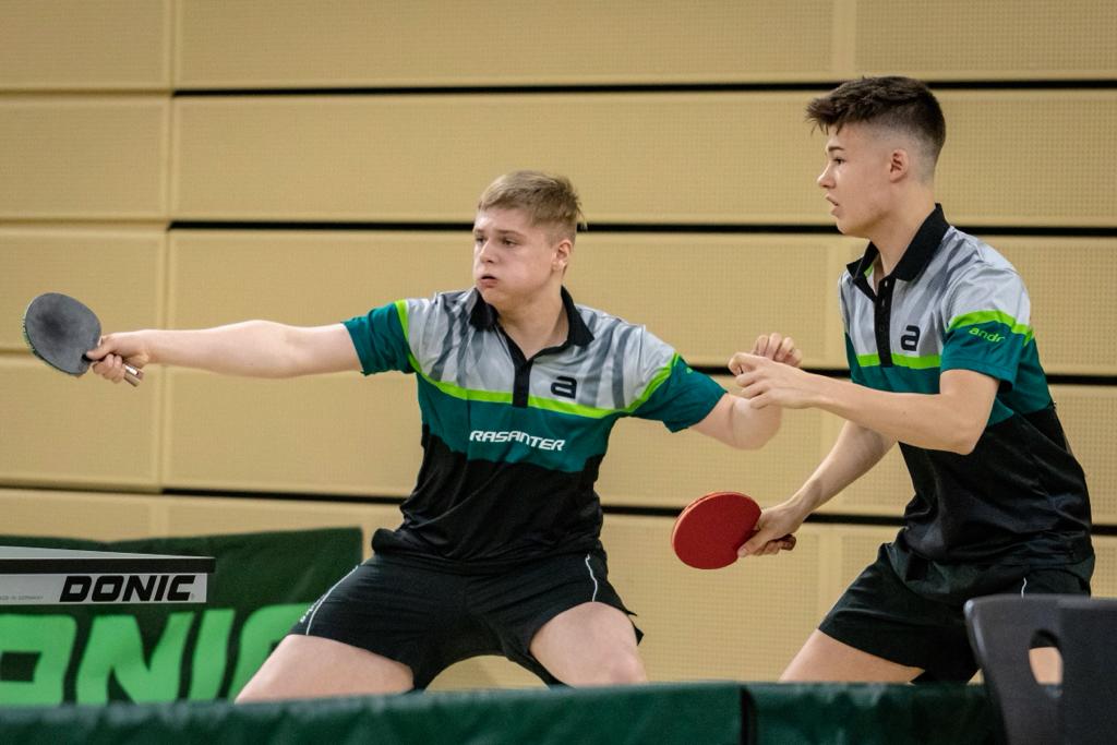 Tom und Lukas, die auch schon beim Deutschland Pokal zusammeln Doppel gespielt haben, fanden im Laufe des Turniers immer besser zusammen und konnten sich von Runde zu Runde steigern. Nachdem sie zu Beginn des Turnier im Achtel- und Viertelfinale zwar deutlich gegen Llorca/Klute (HTTV) und Senkbeil/Kohne (TTVN) gewinnen konnten, bedurfte es schon einer Leistungssteigerung, um im Halbfinale das eingespielte bayrische Duo Hörmann/Rinderer zu besiegen. Und dies zeigten die Jungs auch. In einem hochklassigen und dramatischen Match, welches über die volle Distanz ging, gewannen sie am Ende mit 11:9 im Entscheidungssatz und zogen so ins Finale gegen Hennig/Tran (TTVBW) ein.