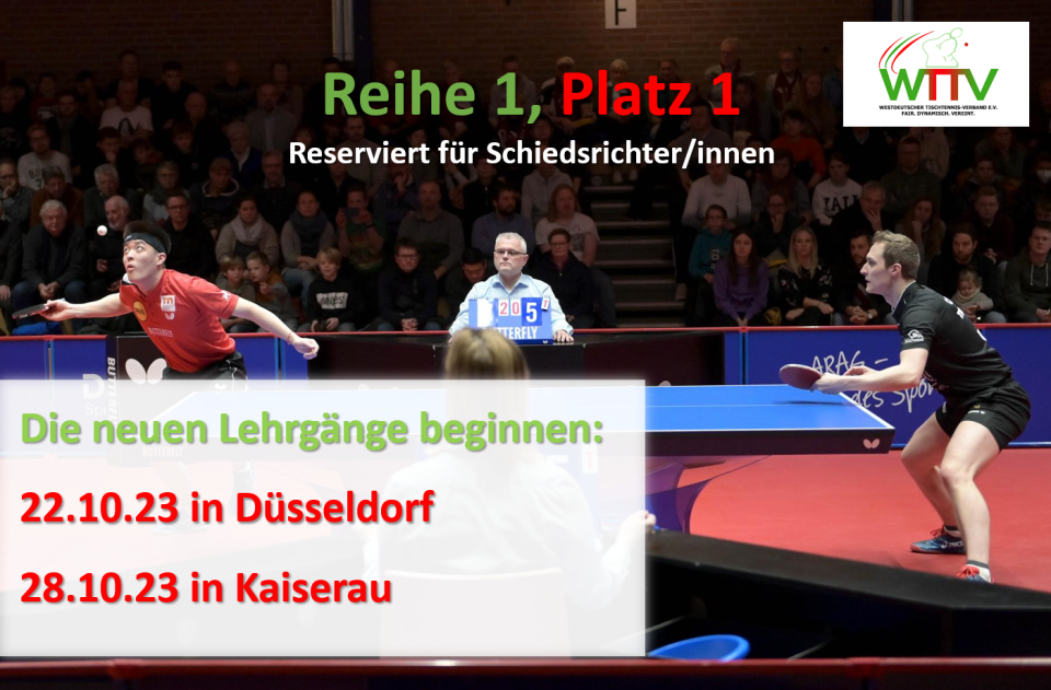 Du bist interessiert? Dann freut sich Ralf Simon (Ralf.Simon@wttv.de) über Deine Kontaktaufnahme. Oder Du meldest Dich direkt über den Seminarkalender in click-tt an. Wir sehen uns dann am 22.10.23 im DTTZ Düsseldorf oder am 28.10.23 im Sportcentrum Kaiserau zum ersten Seminarteil Deiner Ausbildung zum Verbandsschiedsrichter!