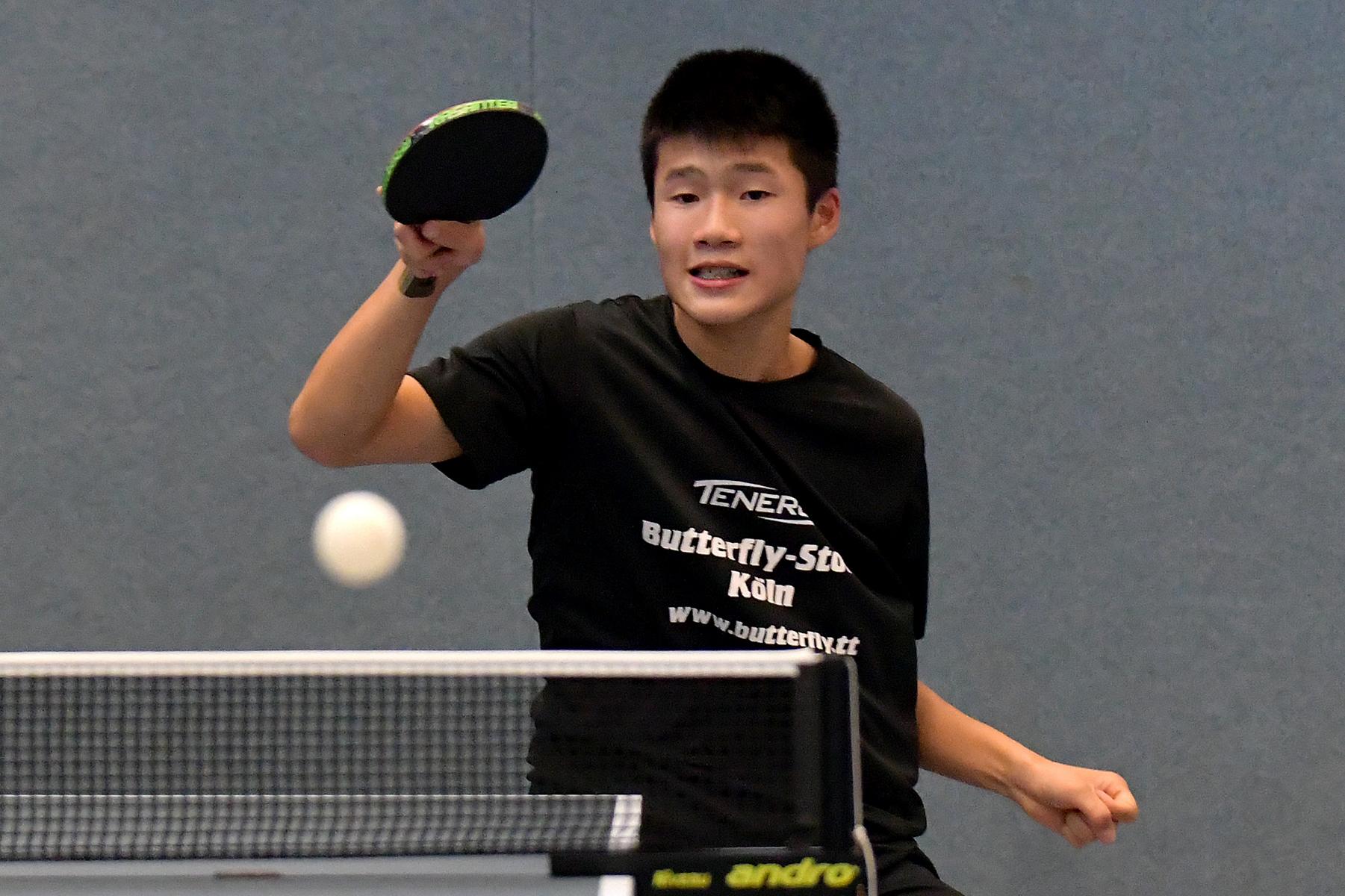Nach der Gruppenphase ging es in den Platzierungsspielen um das Ticket für das DTTB Top 48 Ranglistenfinale der Schüler. Hier zeigten die jungen Spieler noch einmal alles, was sie in den letzten Monaten an Fortschritten gemacht haben. So war es auch kein Wunder, dass hervorragende Ballwechsel mit viel Applaus belohnt wurde. In der letzten Runde gab es einen echten Showdown. Sowohl Marco Stefanidis als auch Andre Bertelsmeier hatten vor dem letzten Spiel des Tages eine Bilanz von 5:1. Marco verlor zuvor gegen Wim Verdonschot (TTC Hagen) und Andre gegen Julius von Bandemer (Borussia Düsseldorf). Es gab ein echtes Endspiel zu sehen, welches die Zuschauer mitgerissen hat. Marco ließ nichts anbrennen, konnte nach einem langen Turniertag das Spiel mit 3:0 für sich entscheiden und sicherte sich das begehrte Ticket für das DTTB Top 48 Ranglistenfinale, welches am 20/21.10 in Norderstedt, in der Nähe von Hamburg stattfindet. Hinter Marco und Andre konnten sich An Duy Dang (TTC Lövenich), Pascal Hong (Borussia Düsseldorf) mit je 4:3 Spielen die Plätze drei und vier sichern.