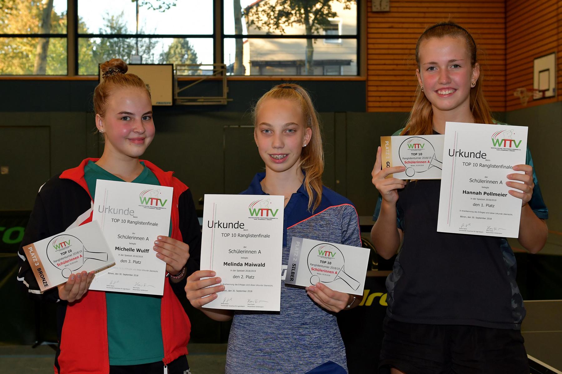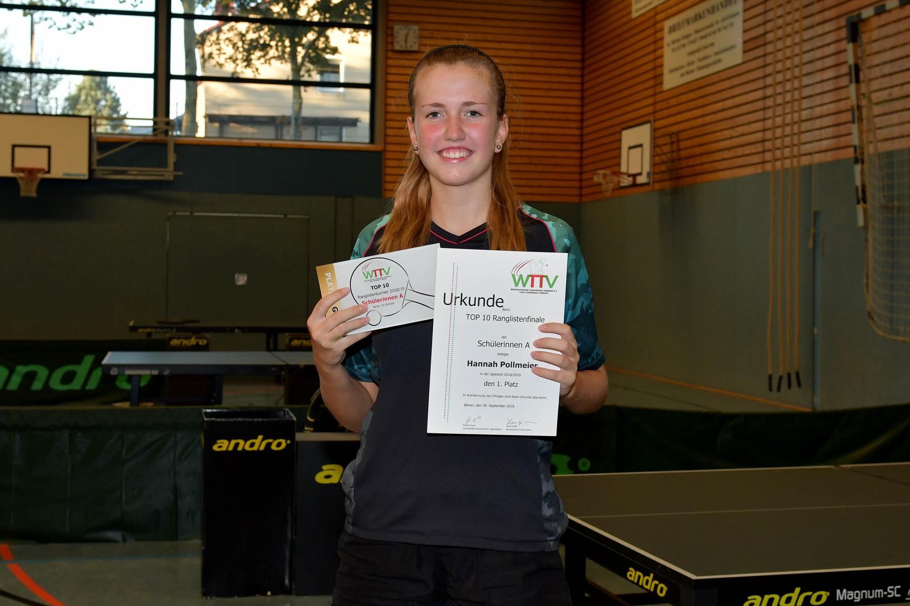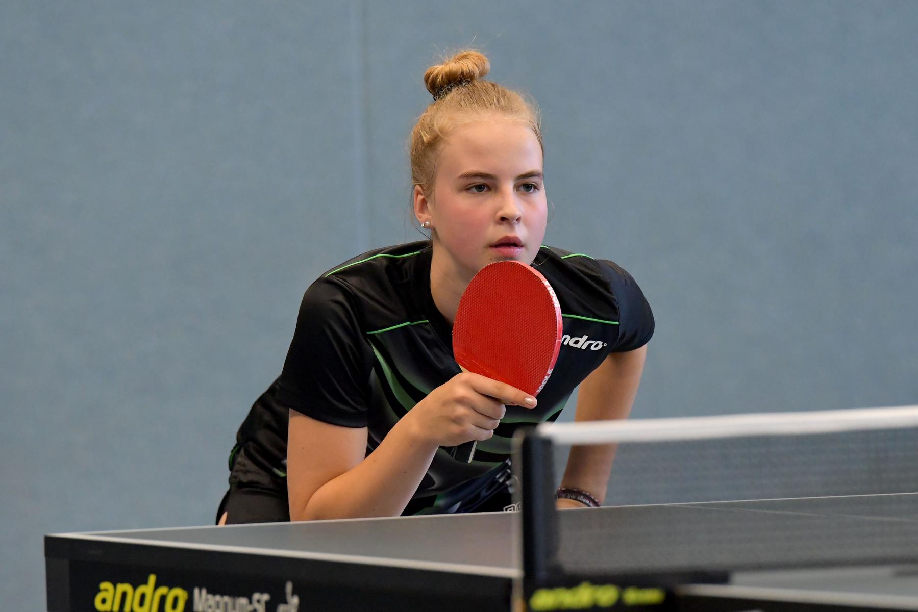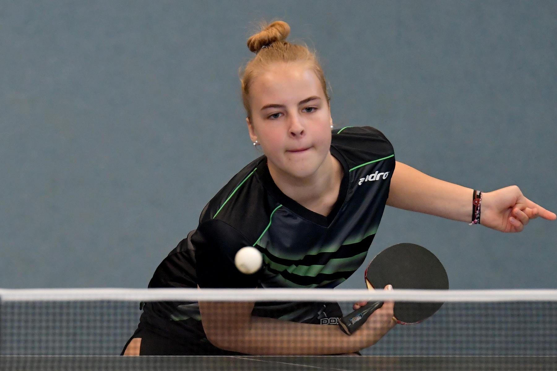 Bei den Schülerinnen konnte sich Hannah Pollmeier (TTV Hövelhof) vor ihrer Vereinskollegin Melinda Maiwald durchsetzen. Beide konnten damit die begehrten Tickets für das Bundesranglistenfinale Top 48 lösen. Direkt in der ersten Runde trafen sie aufeinander und zeigten eindrucksvoll, dass sie zu den Besten im Westen gehören. Mit 3:2 setzte sich nach einem spannenden und hochkarätigen Match Hannah durch. Dieser Sieg schenkte Hannah das notwendige Selbstvertrauen, um die nächsten Herausforderungen zu bestehen. Und diese ließen nicht lange auf sich warten. Michelle Wulff (DJK SR Cappel) sicherte sich mit 5:3 Spielen und dem besseren Satzverhältnis den dritten Platz vor Amelie Pucker (SV Bergheim). Jeweils vier Siege und vier Niederlagen standen zum Schluss für Samira Oudriss (TV Refrath) Annika Menns (Anrather TK) auf dem Turnierbogen und bedeuteten Platz fünf und sechs. Felina Busch (SC Fortuna Bonn) belegte mit 3:5 Spielen Platz sieben vor Luisa Düchting (TTG Langenich) und Katja Schütz (TSV Marienberghausen). Leider verletzte sich Medeea Grozav-Marcu (TuS Sundern) im Spiel gegen Felinda Busch so schwer, dass sie das Turnier abbrechen und sich in ärztliche Behandlung begeben musste. Auf diesem Wege wünschen wir ihr alles Gute und hoffen, dass sie bald wieder gesund ist.